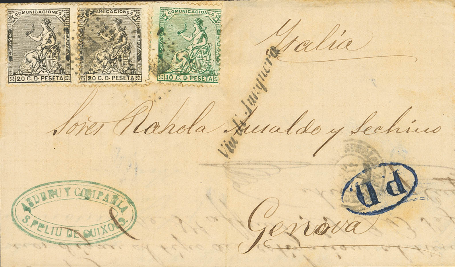 133, 134(2). 1874. 10 cts verde y 20 cts negro, dos sellos. SAN FELIU DE GUIXOLS a GENOVA (ITALIA), circulada por vía terrestre. En el frente marca VIA DI JUNQUERA. MAGNIFICA Y RARISIMA COMBINACION DE FRANQUEO PARA COMPLETAR LA TARIFA DE 200 MILS O 50 CTS A ITALIA DE JULIO DE 1868, ESPECIALMENTE CON DOS SELLOS DE 20 CTS, UNO DE LOS VALORES MAS RAROS DE LA SERIE EN CARTA.