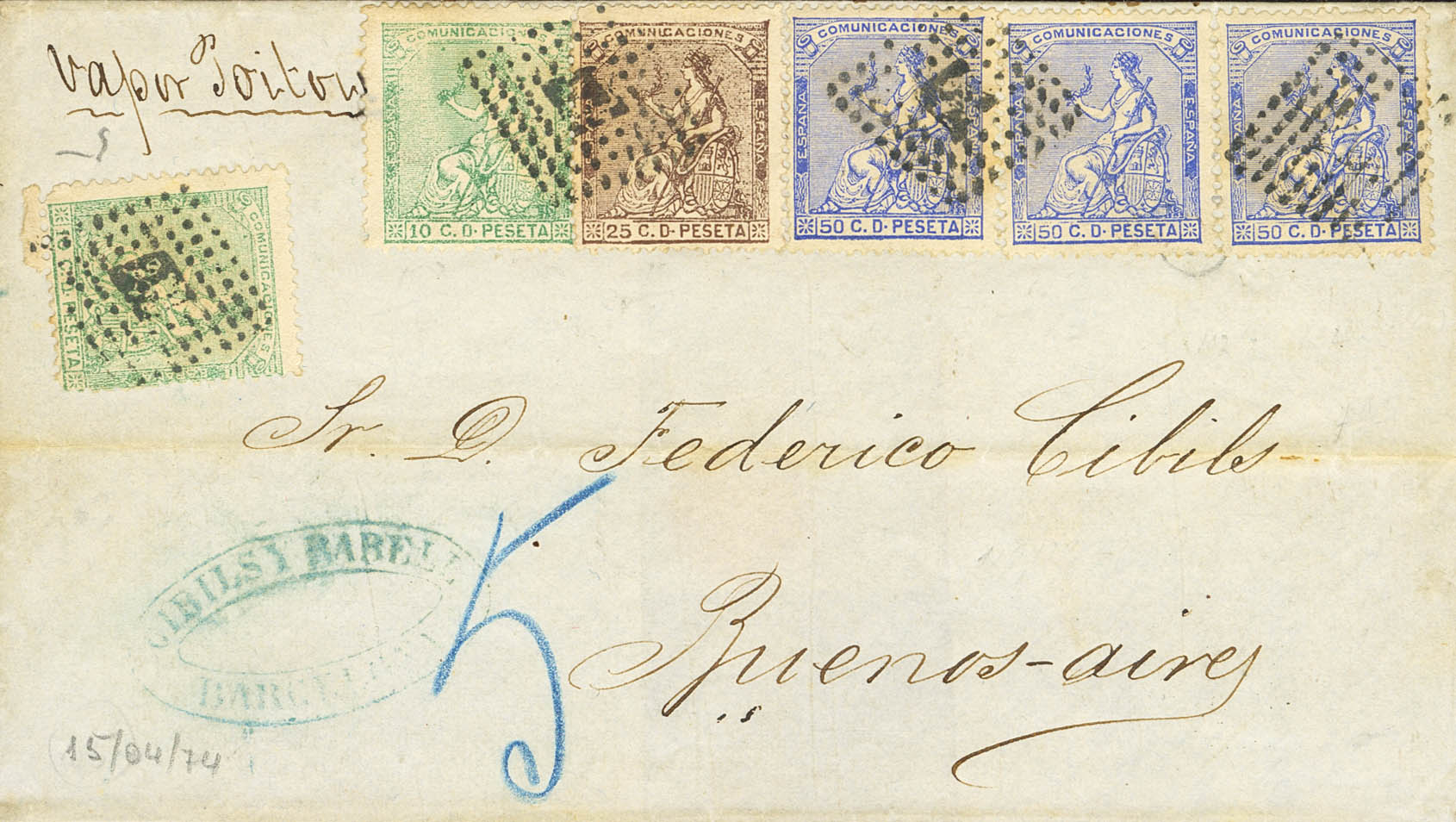 133(2), 135, 137(3). 1874. 10 cts verde, dos sellos, 25 cts castaño, un sello y 50 cts ultramar, tres sellos. BARCELONA a BUENOS AIRES (ARGENTINA). En el frente manuscrito "Vapor Portou". MAGNIFICA Y ESPECTACULAR Y RARISIMO FRANQUEO DE TRIPLE PORTE SEGUN TARIFA DE AGOSTO DE 1870, CARTA SINGULAR DEBIDO A LA COMBINACION DE BELLEZA Y RAREZA. Cert. CEM.