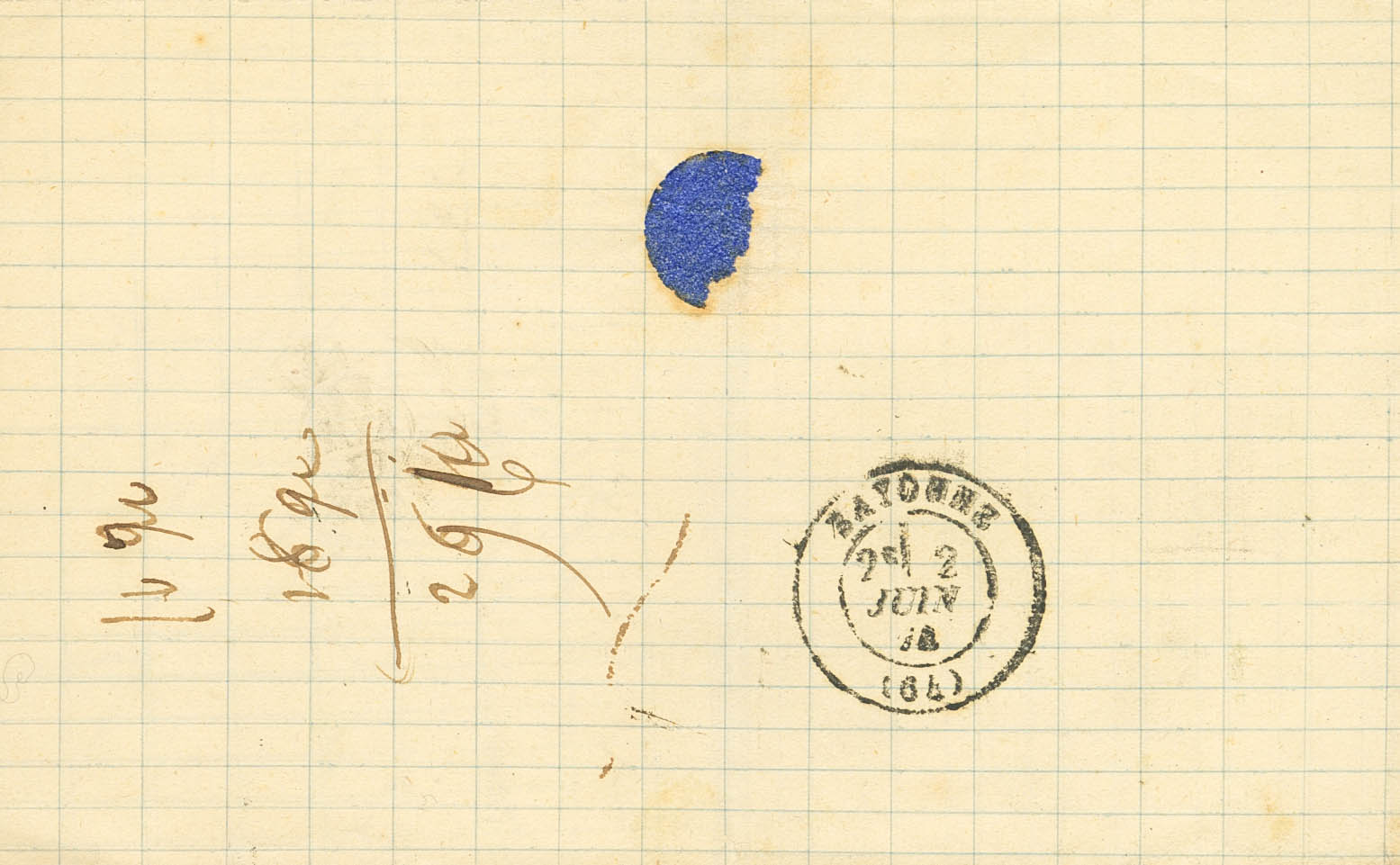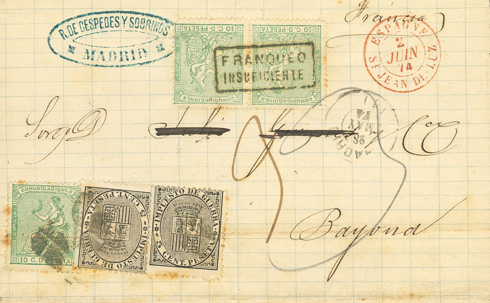 133(3), 141(2). 1874. 10 cts verde, tres sellos y 5 cts negro, dos sellos (doblez de archivo). MADRID a BAYONA (FRANCIA). Los sellos de impuesto de guerra no son considerados válidos para completar los 40 cts de la tarifa, por lo que se aplica la marca FRANQUEO / INSUFICIENTE y es tasada con "3" décimas. MAGNIFICA Y MUY RARA COMBINACION DE FRANQUEO.