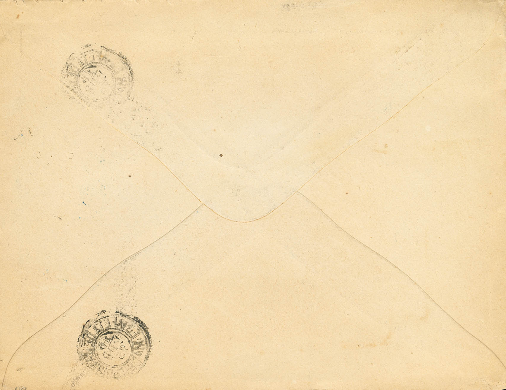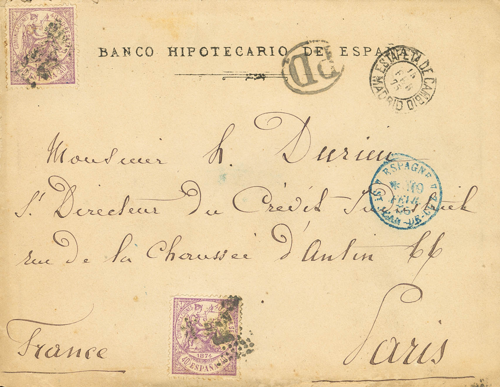 148(2). 1875. 40 cts violeta, dos sellos. MADRID a PARIS (FRANCIA). MAGNIFICA E INUSUAL FRANQUEO DE DOBLE PORTE.