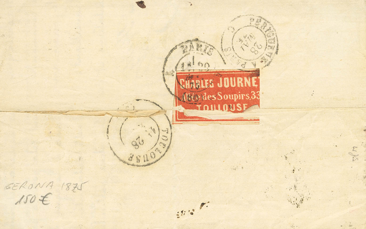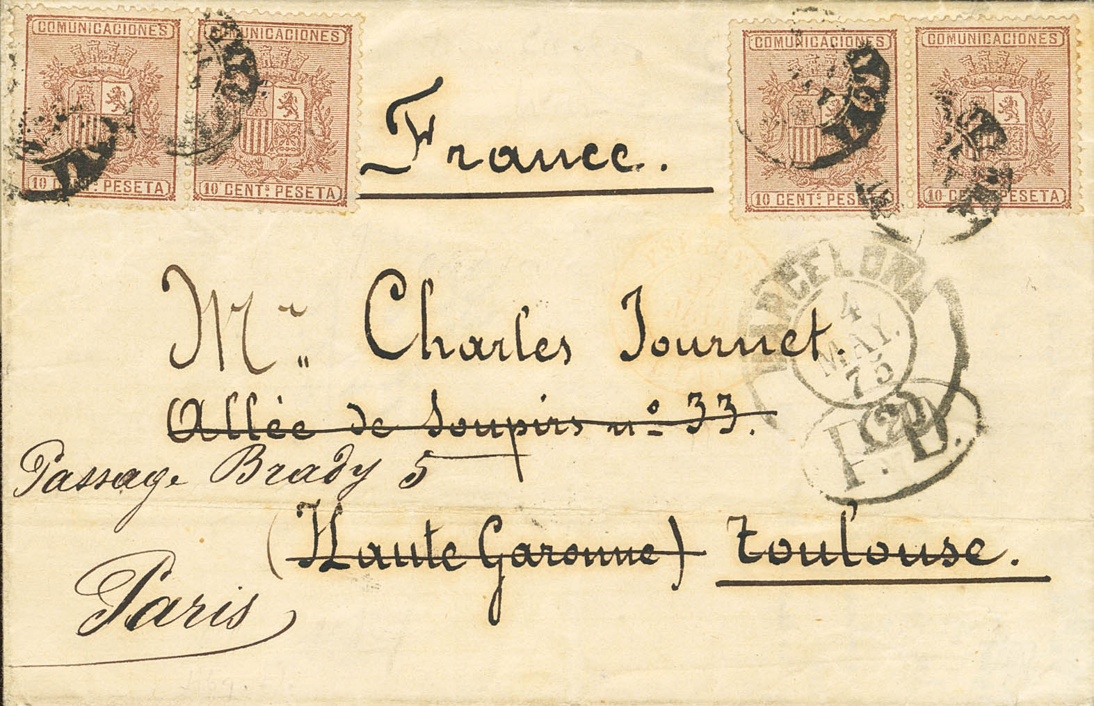 153(4). 1875. 10 cts castaño, cuatro sellos. GERONA a TOULOUSE (FRANCIA), reexpedida a PARIS y depositada en el correo de Barcelona, muy probablemente con motivo de las escaramuzas Carlistas en la ciudad de Gerona y los problemas ferroviarios originados por las mismas, con el objeto de evitar estos acontecimientos la carta de depositó en Barcelona. MAGNIFICA E INUSUAL RUTA.