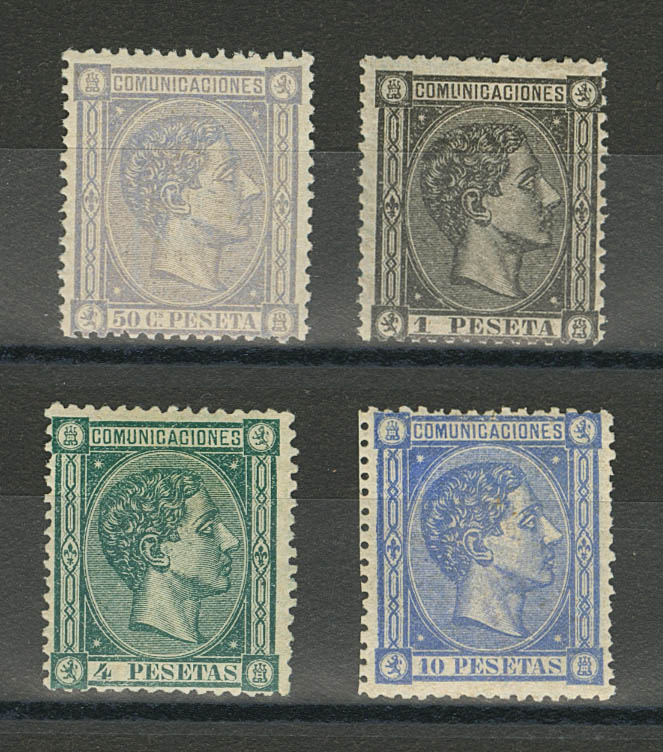 ★ 168, 169, 170, 171. 1875. 50 cts lila, 1 pts negro, 4 pts verde y 10 pts ultramar (centrajes habituales). BONITOS.