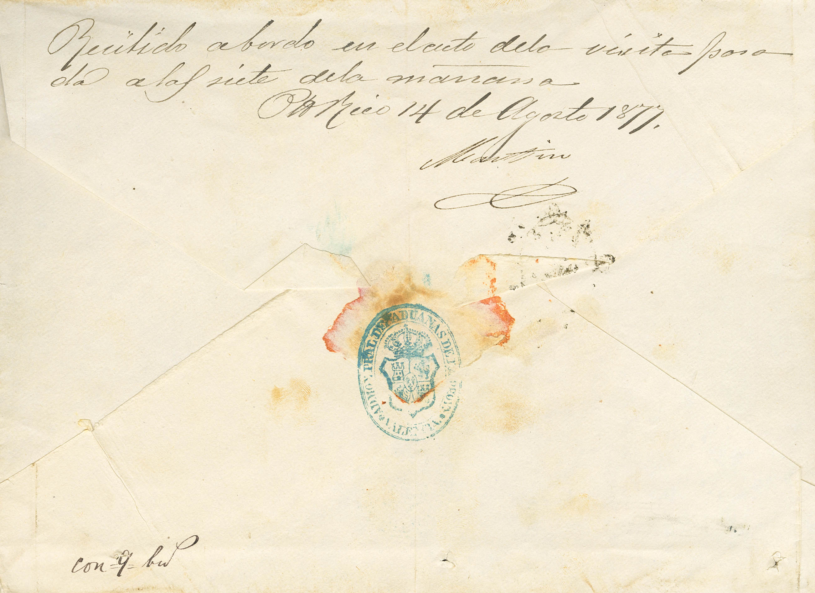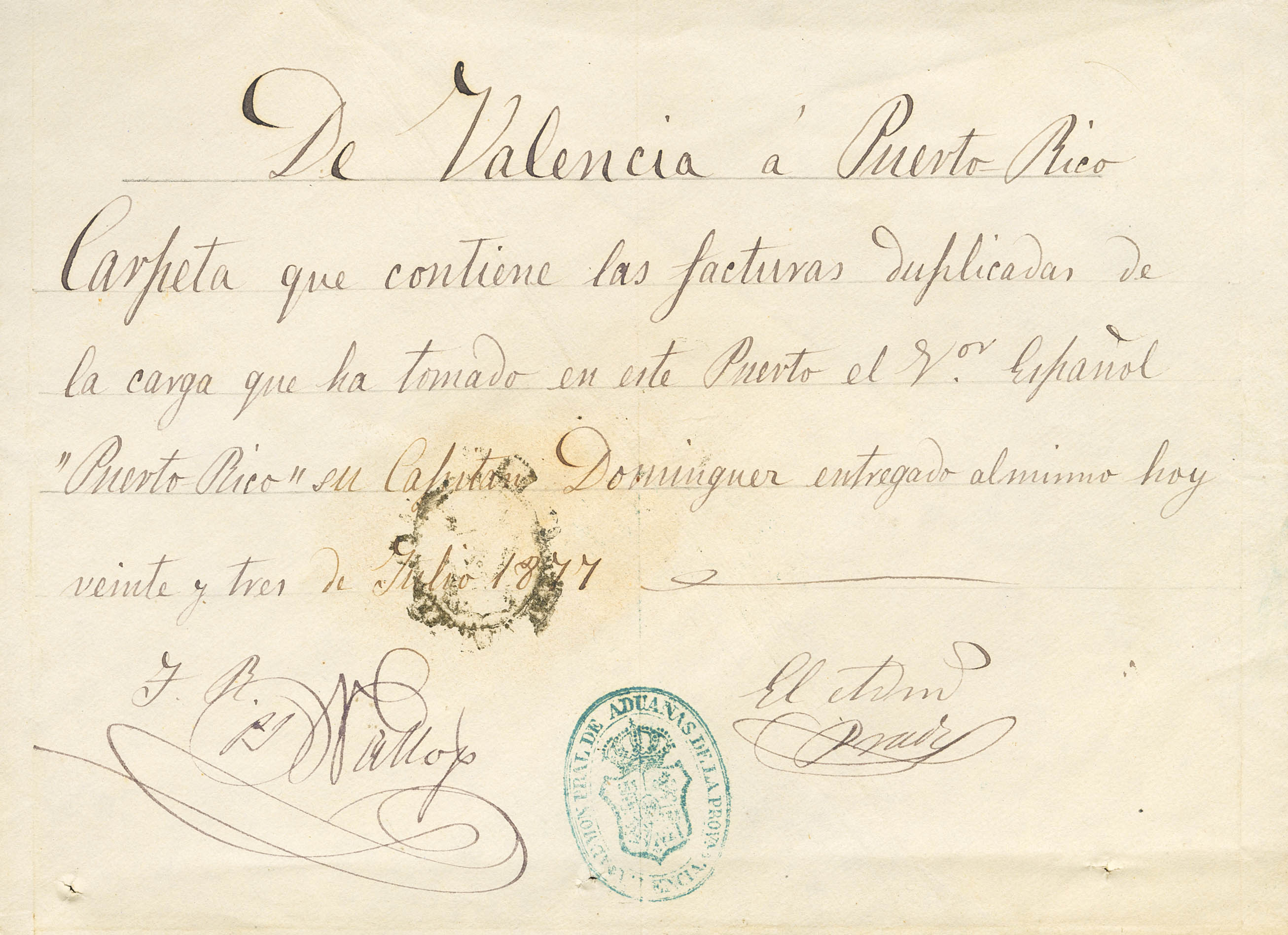 1877. Registro de Embarque de VALENCIA a PUERTO RICO. Marca ADMON PRAL DE ADUANAS DE LA PROVª / VALENCIA, en azul y manuscrito "Por Español Puerto Rico". MAGNIFICO Y RARO.
