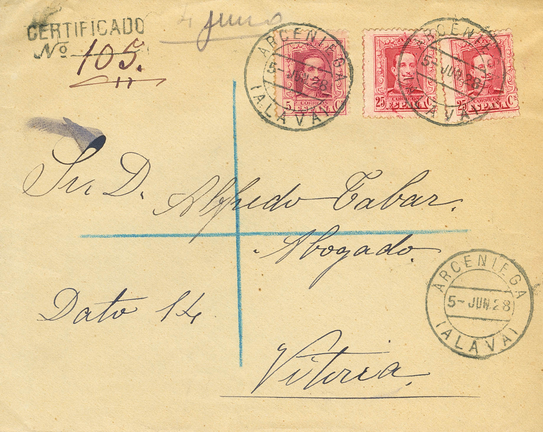 317A(2), 311. 1928. 5 cts y 25 cts, dos sellos. Certificado de ARCENIEGA (ALAVA) a VITORIA. Al dorso tránsito. MAGNIFICA.