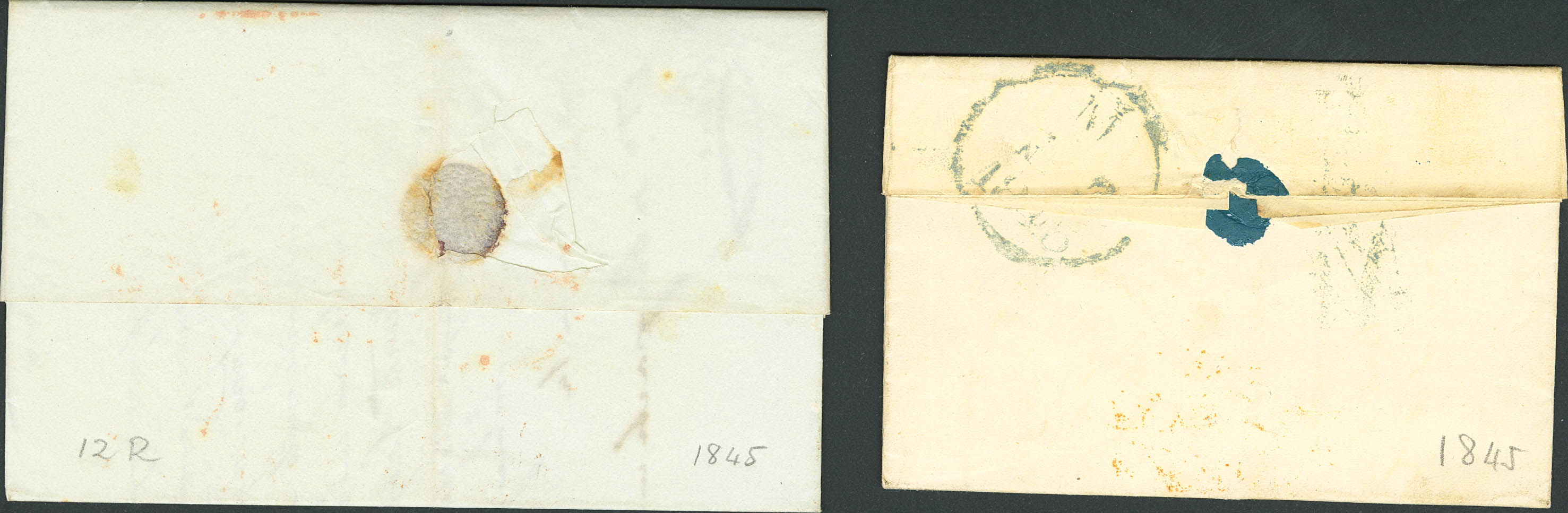 1845. Dos cartas dirigidas a MADRID y ambas con la marca "M" CORONADA, en azul y en rojo respectivamente y aplicadas a la llegada (P.E.18) edición 2004. MAGNIFICAS Y RARAS.