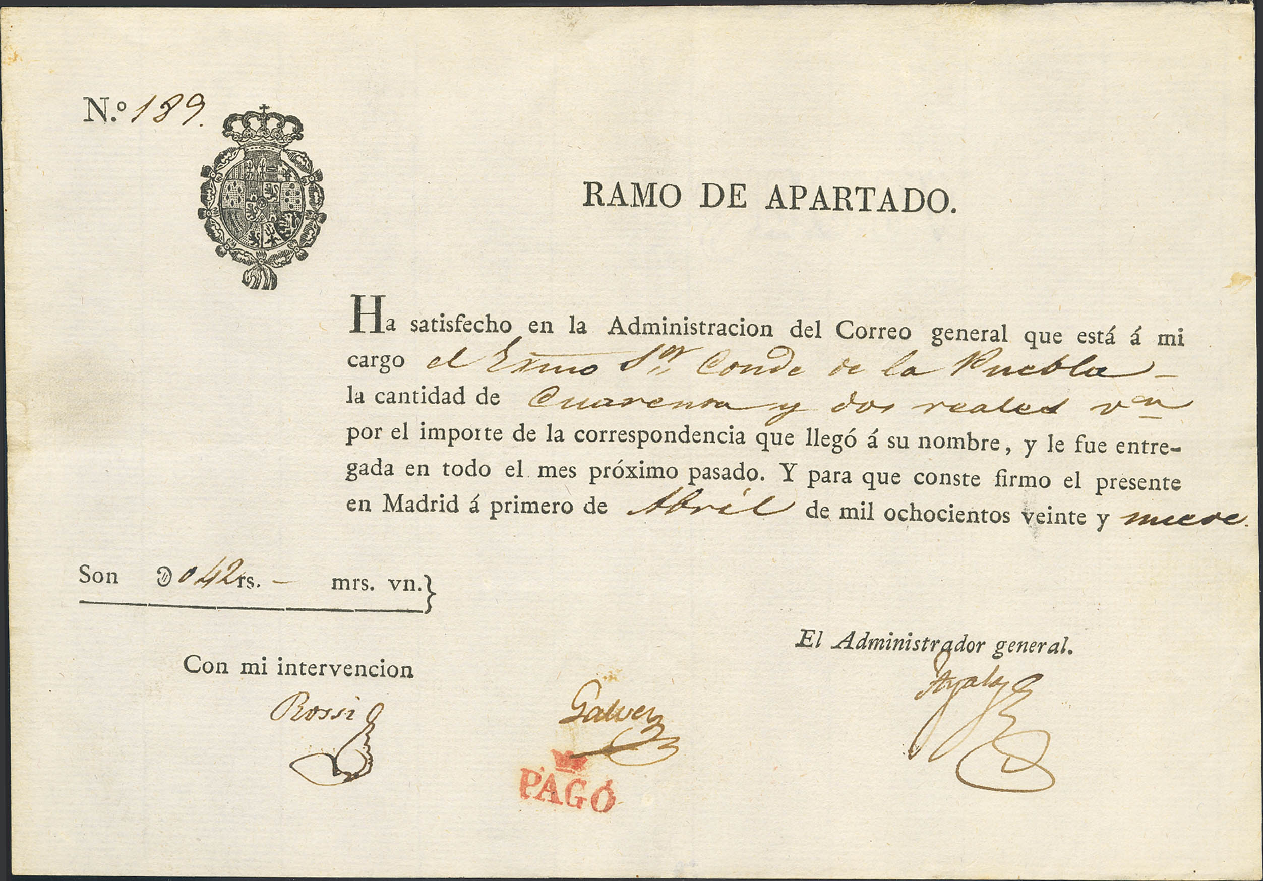 1829. Recibo de Apartado Postal y pago del Correo de la Administración de Madrid, marca coronada PAGO, en rojo. MAGNIFICO.