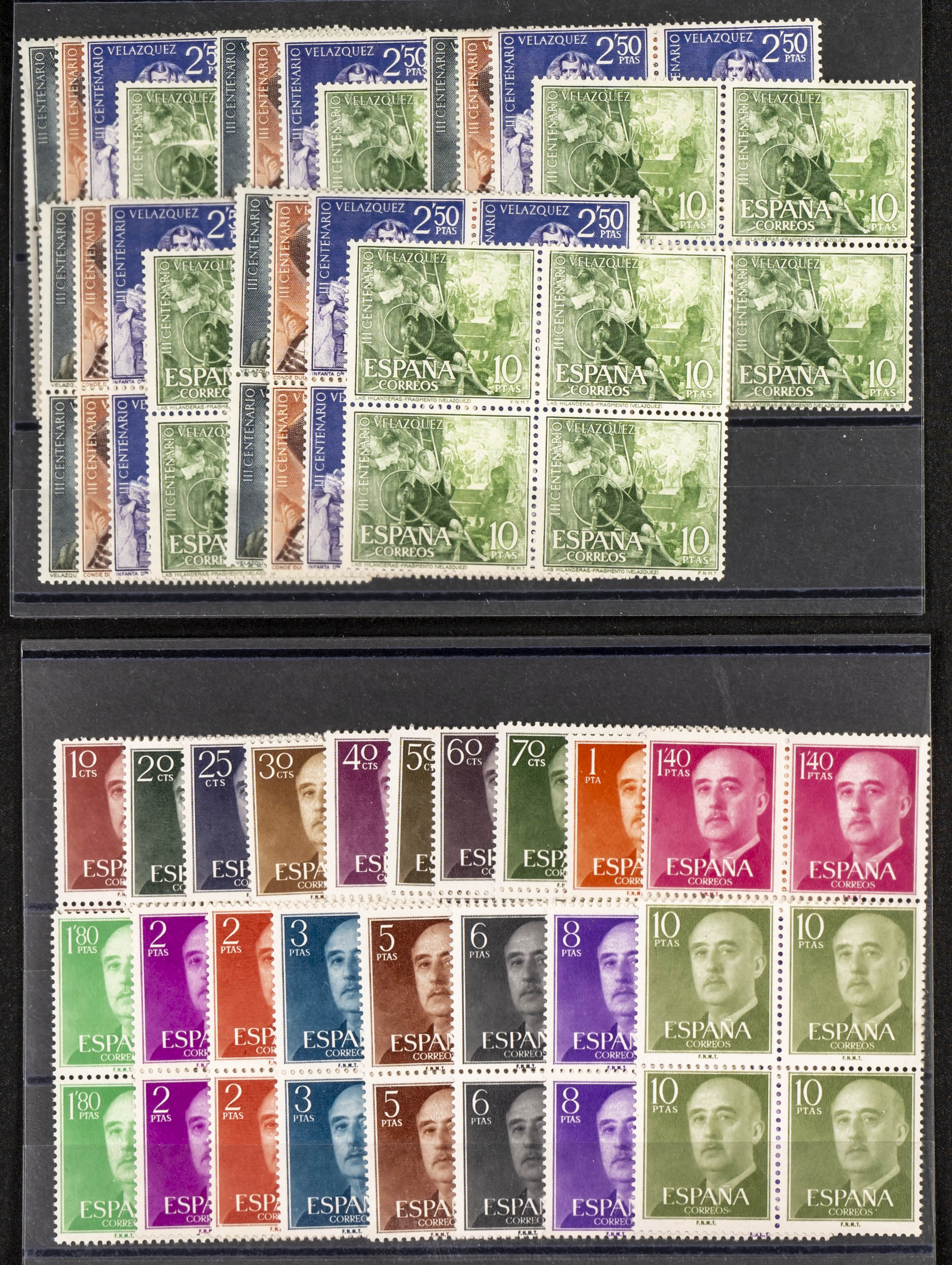 ★★ 1143/63(4), 1340/43(20). 1955. Cuatro series completas FRANCO y veinte series completas VELAZQUEZ (buena calidad en general). A EXAMINAR. Edifil 2025: 384 Euros