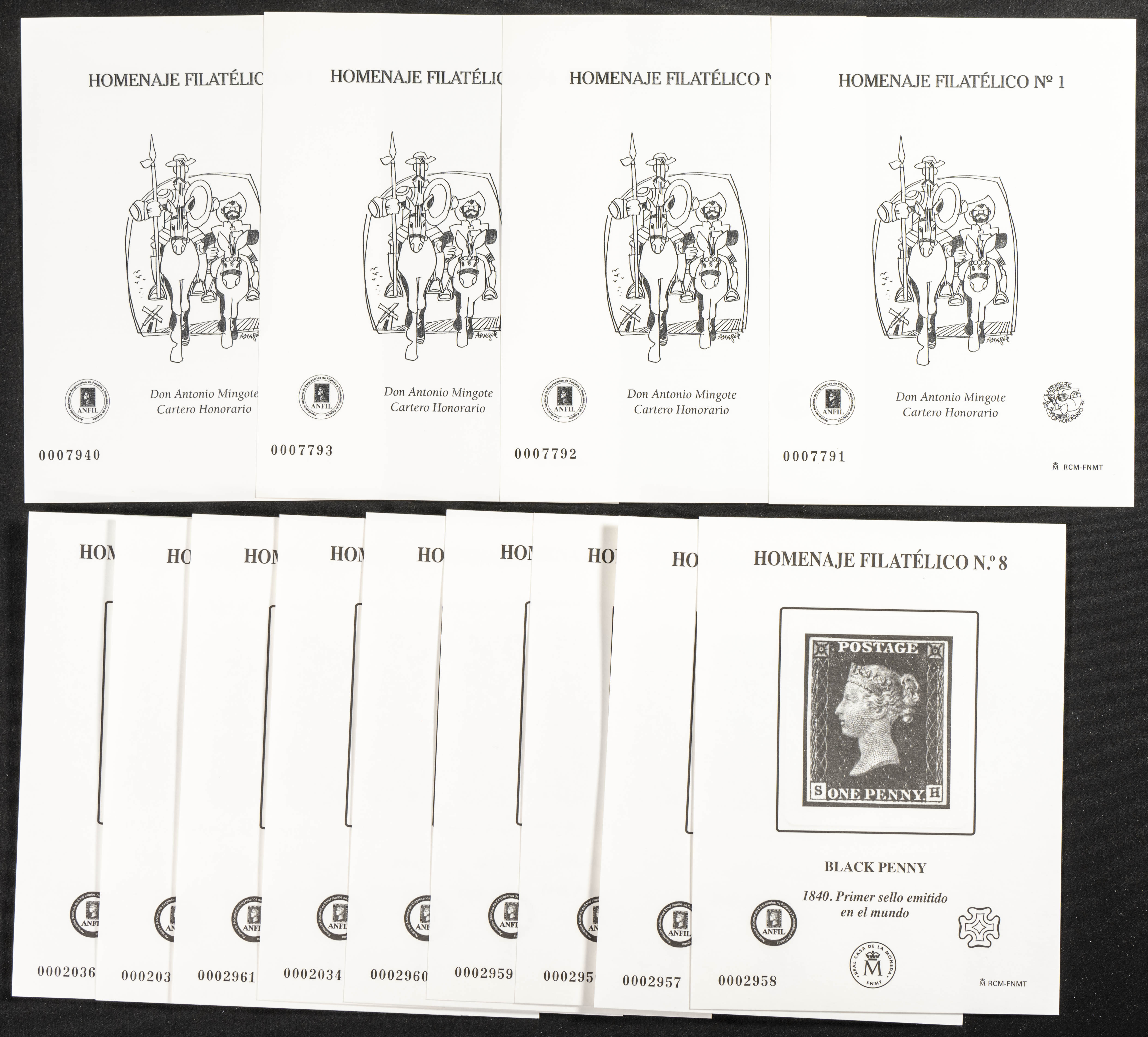 ★★ 1(4), 8(9). 2005. Conjunto de cuatro hojitas de Homenaje Filatélico Nº1 ANTONIO MINGOTE y nueve hojitas de Homenaje Filatélico Nº8 BLACK PENNY. MAGNIFICAS. Edifil 2025: 234 Euros