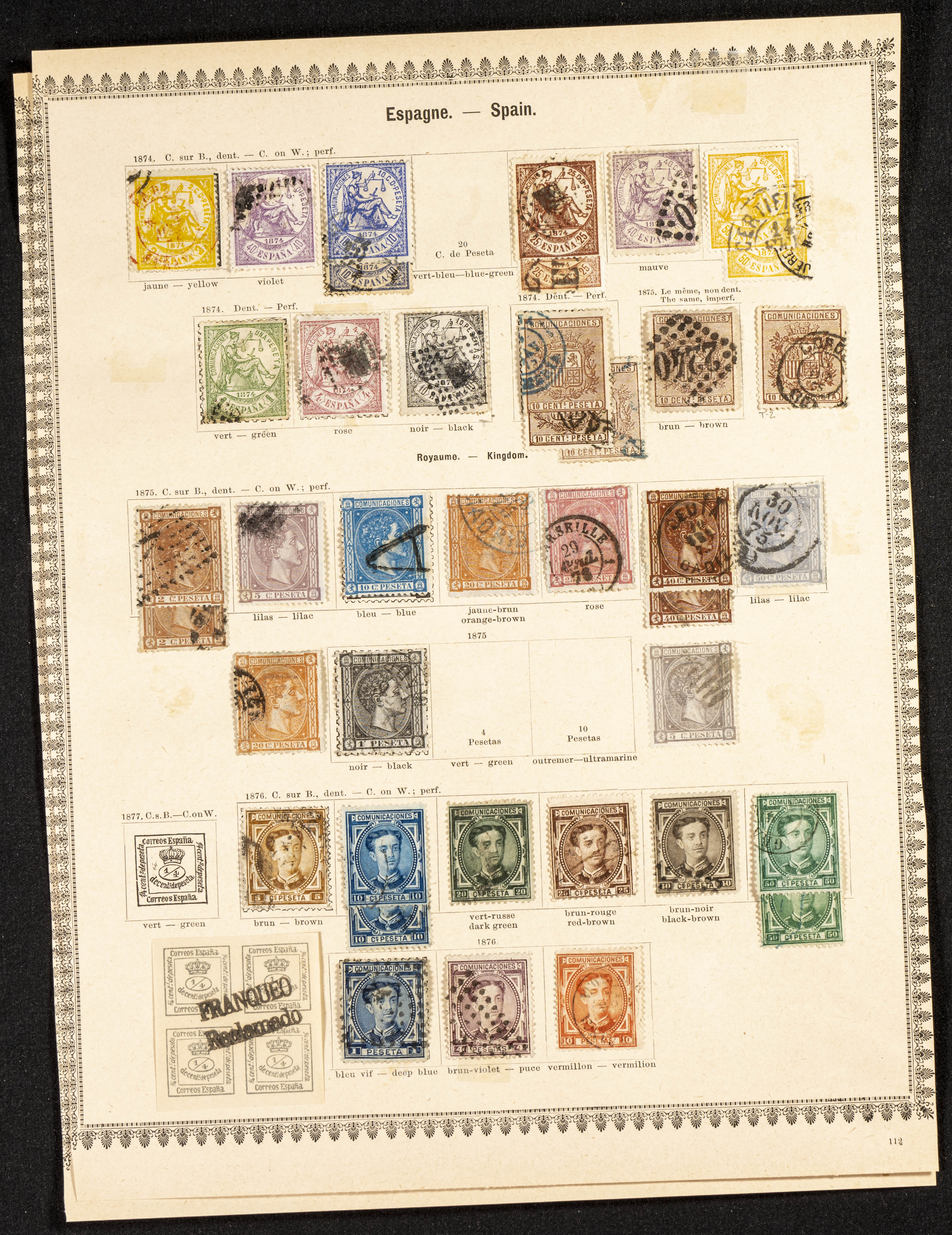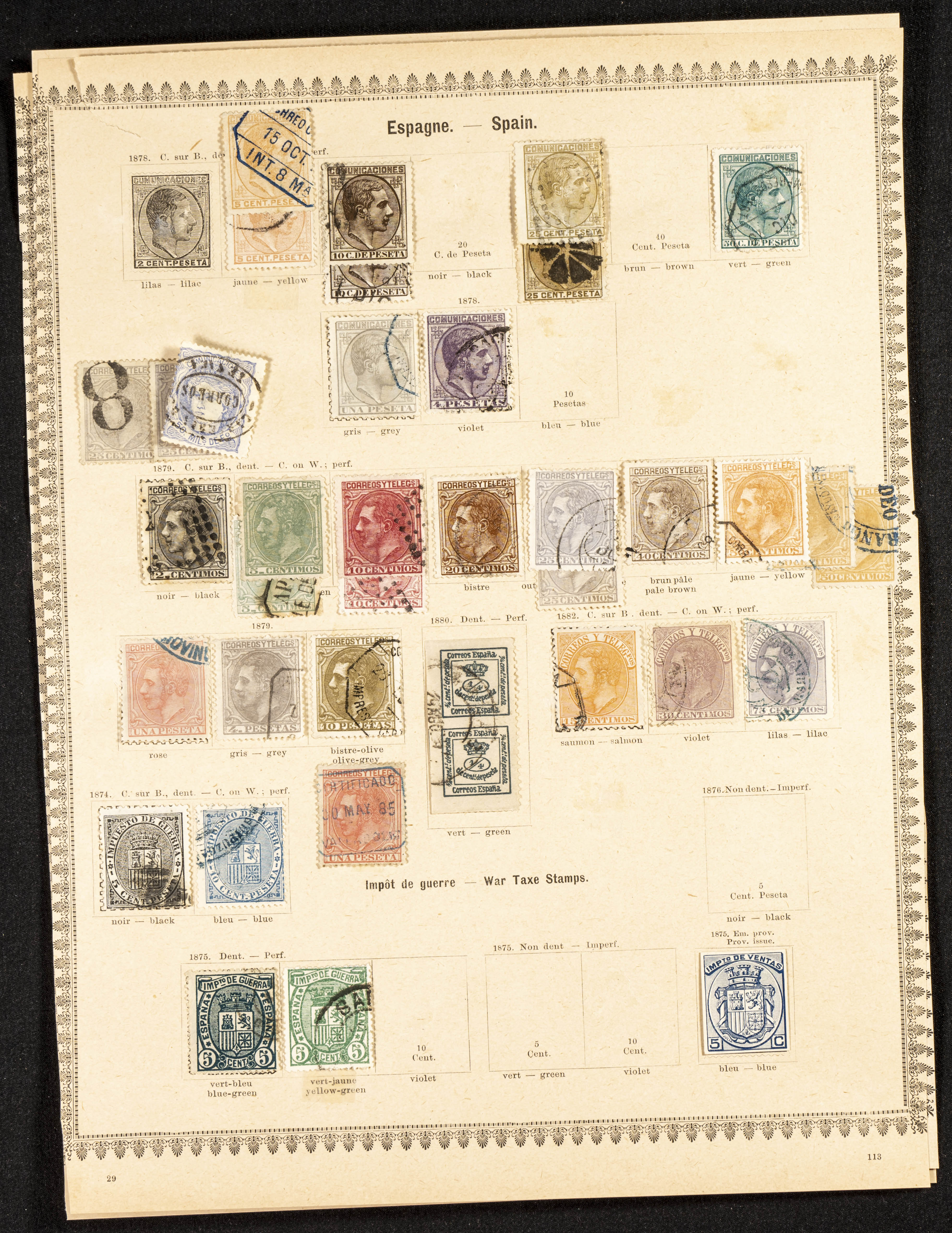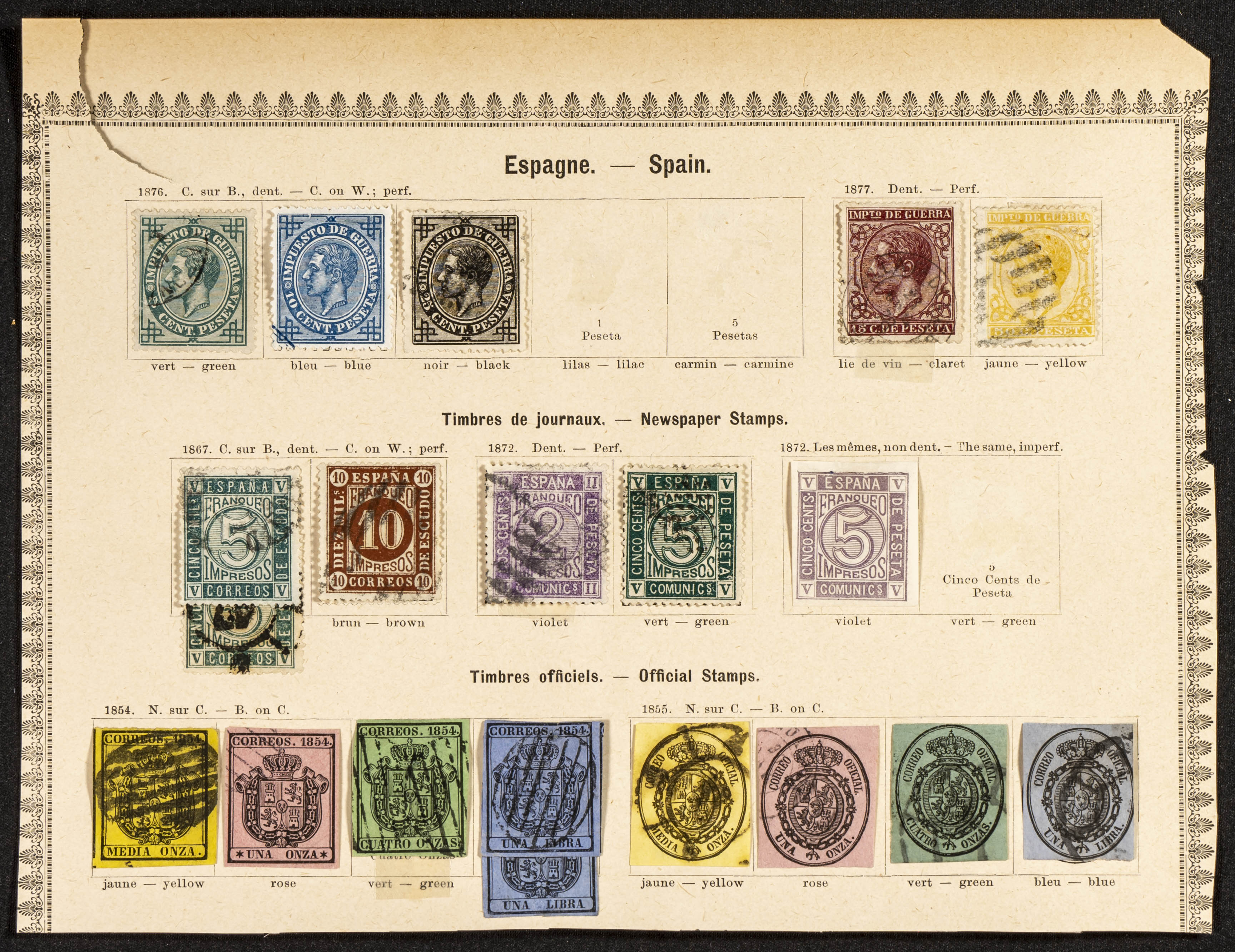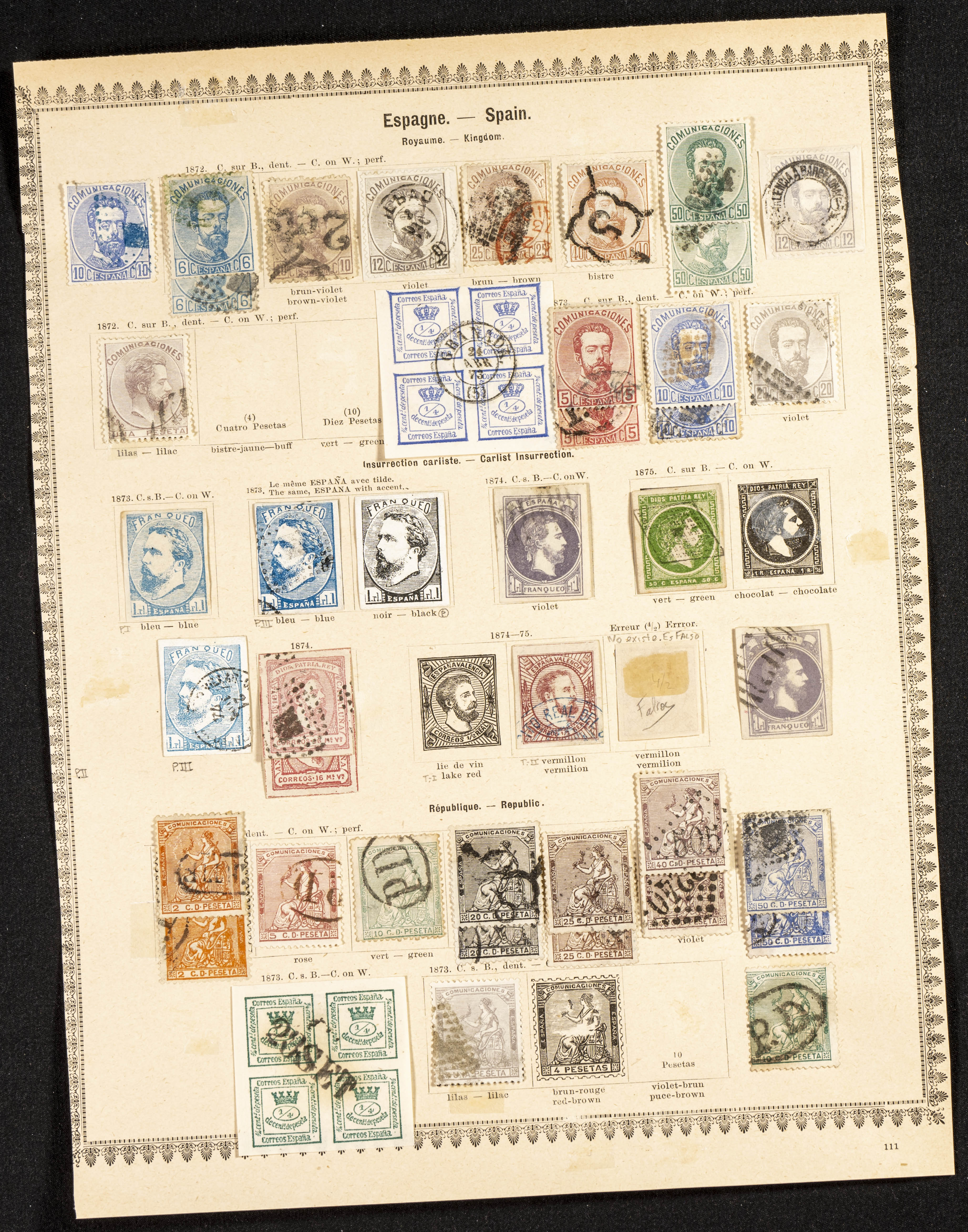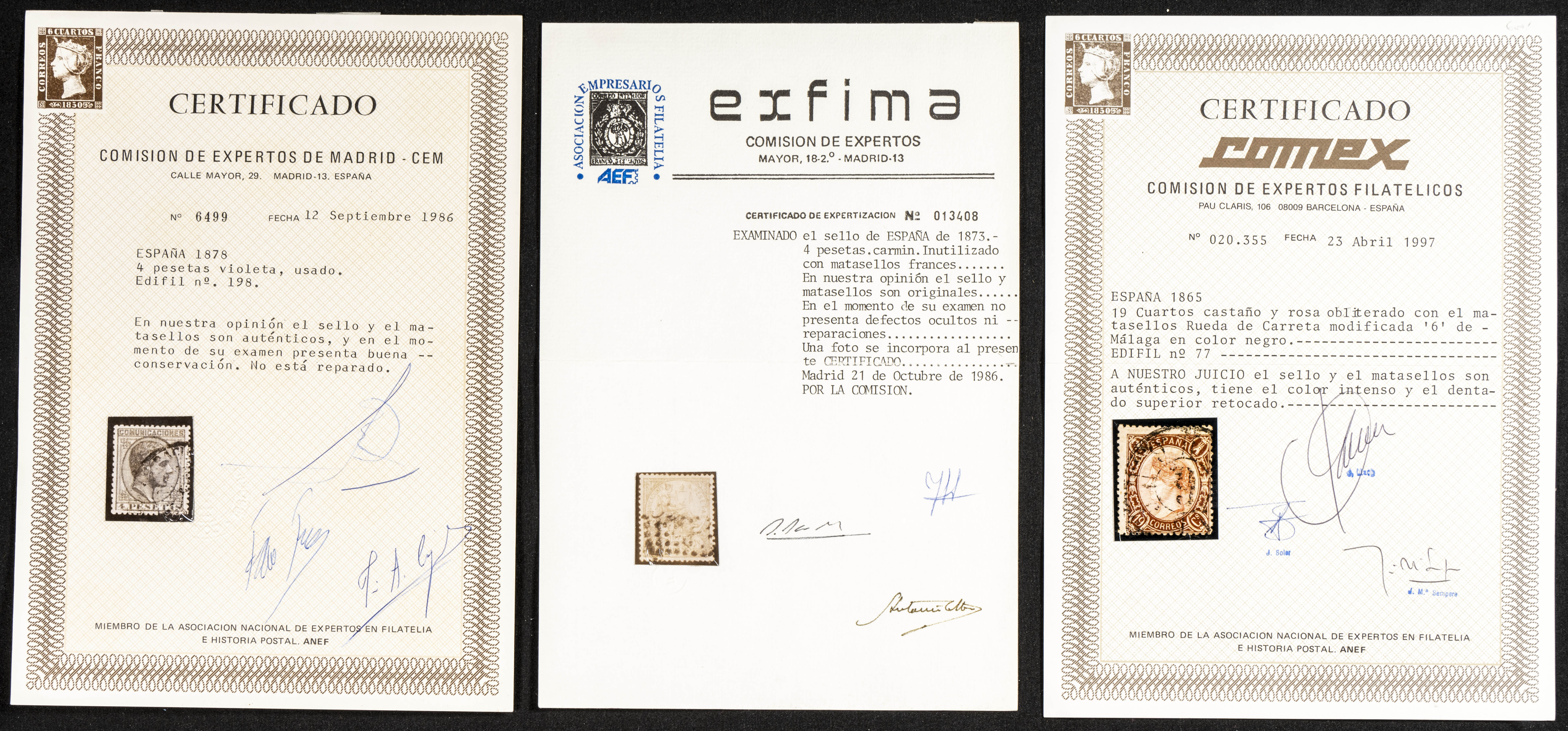 (★)/(1854ca). Interesante conjunto de sellos clásicos entre 1854 y 1882, en usado (hay alguno nuevo), por lo general buena calidad y matasellos limpios, alguno muy raro o poco habitual, destacando el 19 cuartos de 1865 dentado con certificado Comex, de 1866 y de 1870, 2 escudos azul de 1870, 1 real Carlista de 1873 nuevo (Edifil 156) y usado (dos sellos), además de una prueba en negro, 4 pts y 10 pts de 1874, 4 pts violeta de 1878 y 10 pts sepia de 1879 (algunos sellos con certificado y montados en hojas de álbum antiguas). ALTISIMO VALOR DE CATALOGO. IMPRESCINDIBLE EXAMINAR.