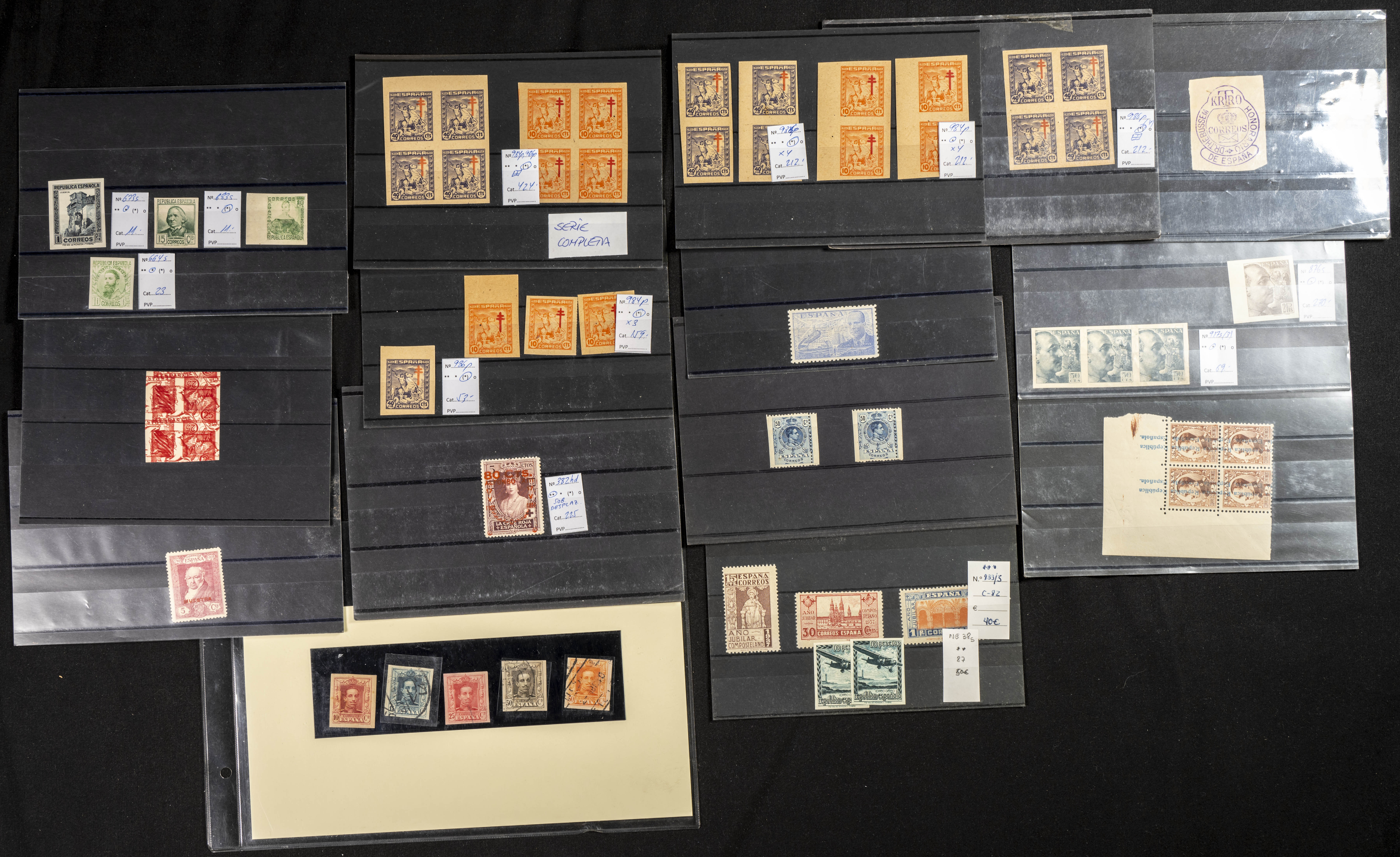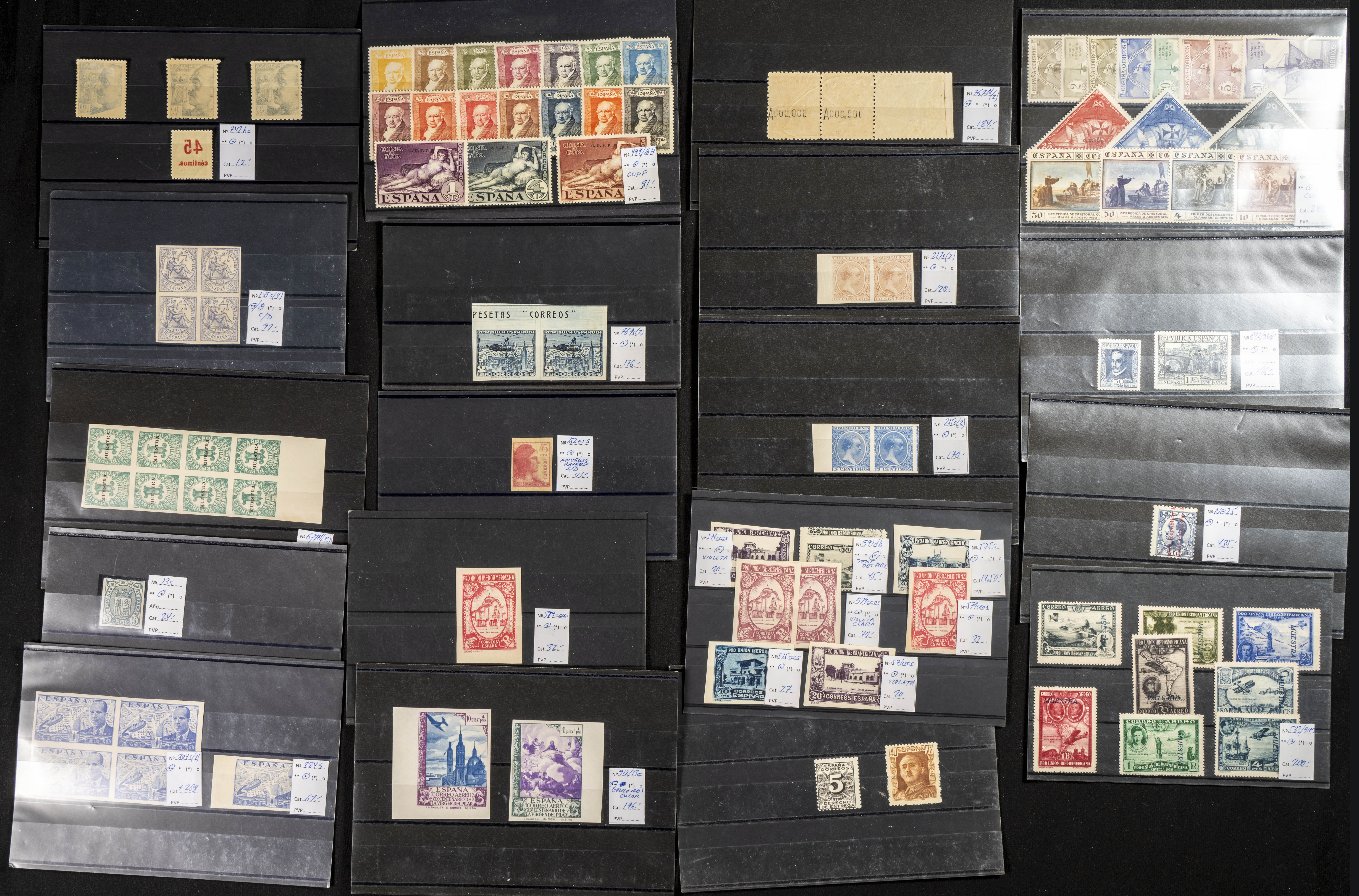 ★★/★(1874ca). Interesante conjunto de variedades del 1º Centenario entre 1874 y 1944, en nuevo y con algunos múltiplos, destacando dos parejas sin dentar del 5 cts azul y 10 cts castaño claro de Pelón, un sello no emitido del 40 cts de 1931 (NE25), una pareja sin dentar del Autogiro de 1938, series con sobrecarga CUPP, etc. IMPRESCINDIBLE EXAMINAR. Edifil 2020: +4.750 Euros