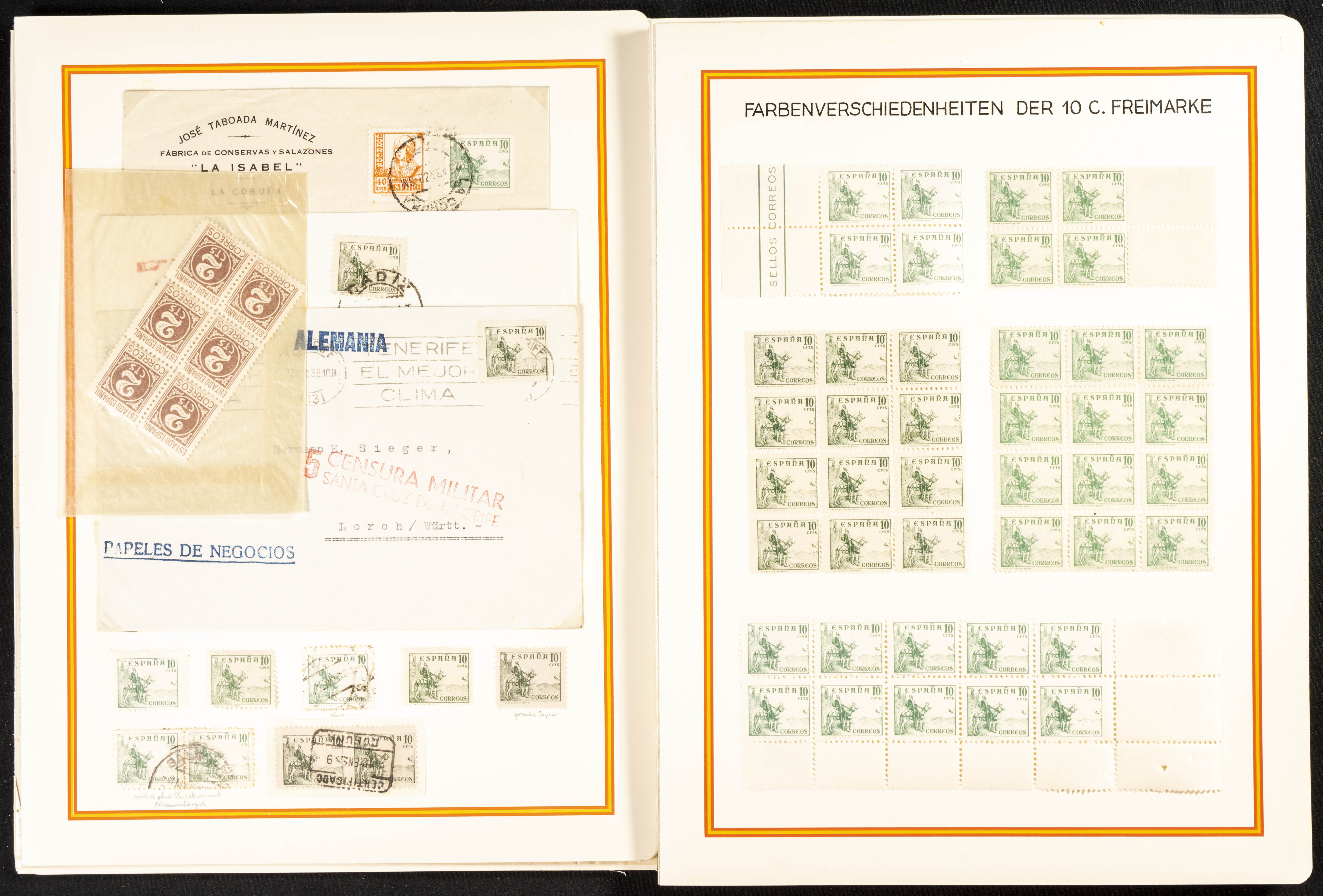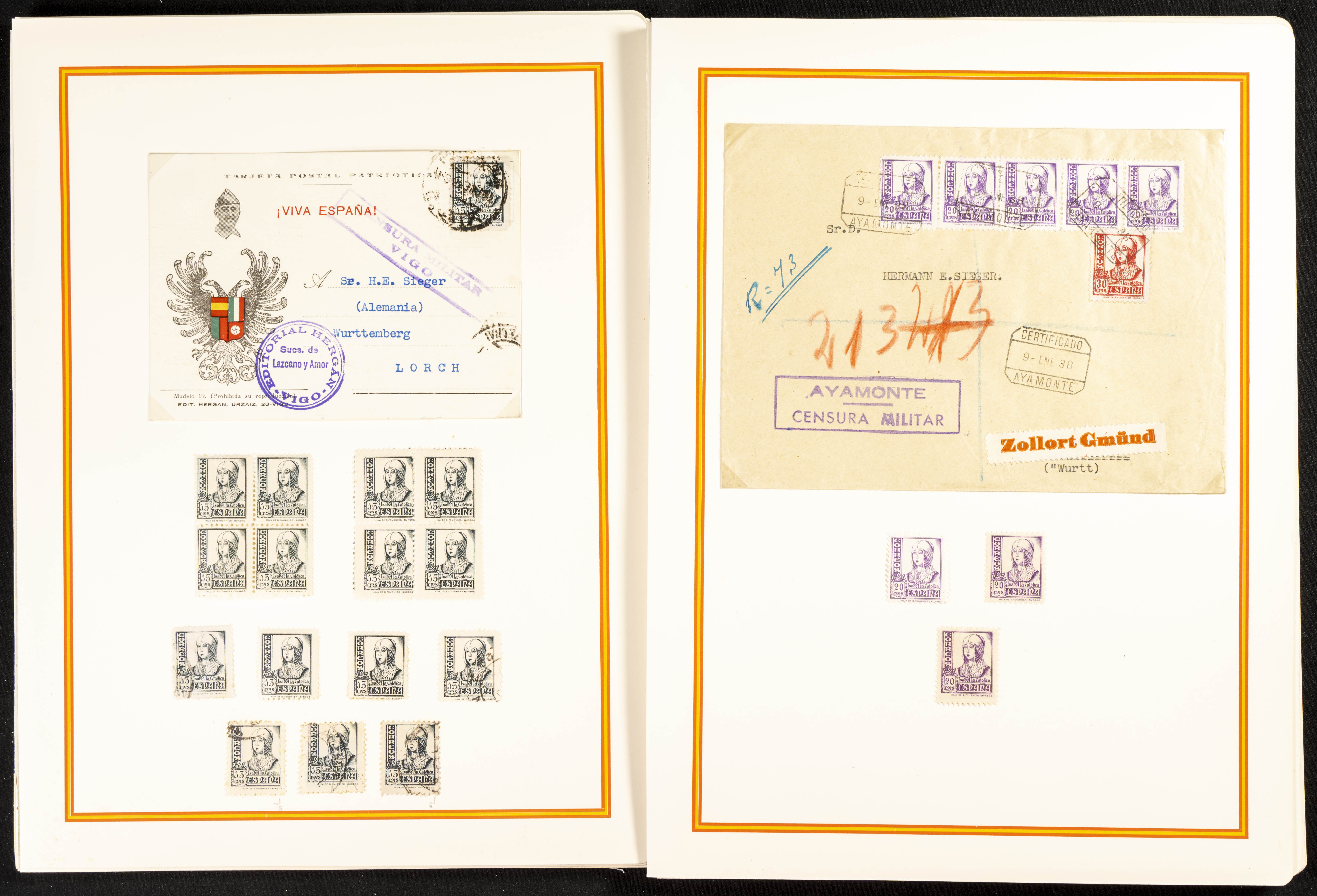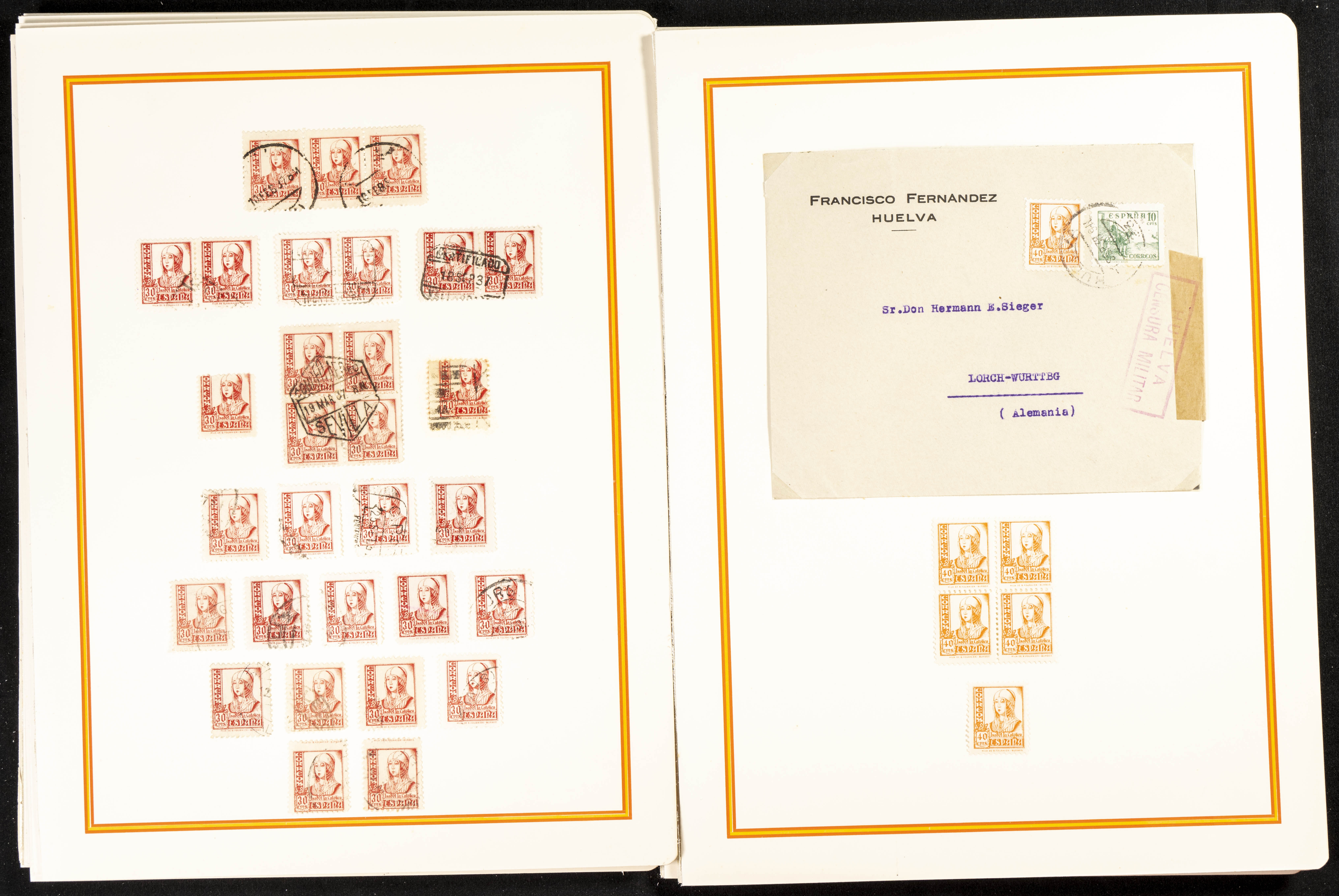 ★★/★1937. Interesante conjunto de la emisión de Cifras, Cid e Isabel, en nuevo (algún sello usado) con variedades, bloques de cuatro y más grandes y más de treinta cartas, la mayor parte certificadas, incluye la rara variedad pie de imprenta a la izquierda en el 30 cts, así como algunos sellos y cartas del 20 cts castaño (Pegaso) Urgente. ALTO VALOR DE CATALOGO. IMPRESCINDIBLE EXAMINAR.