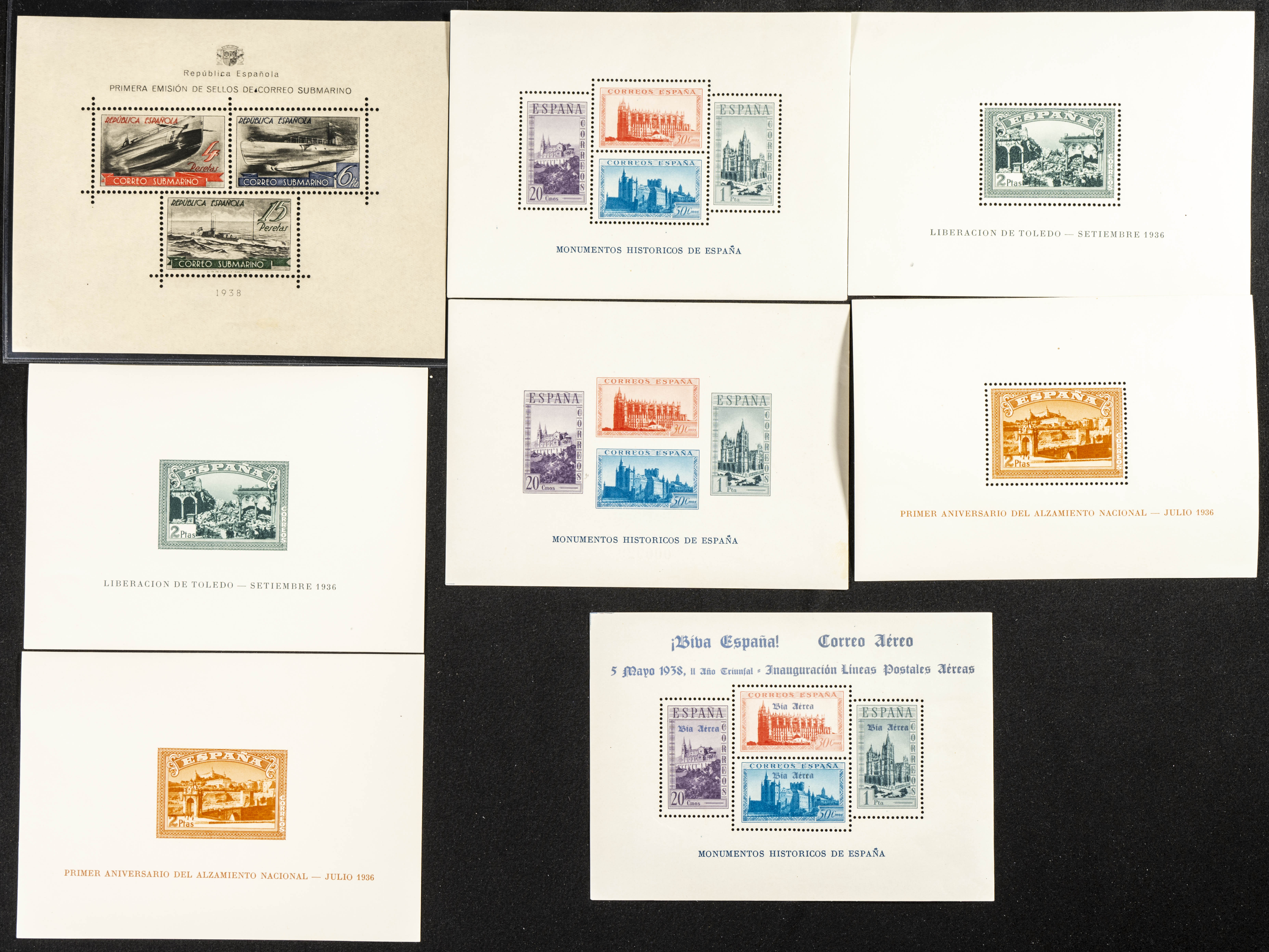 ★★/★ 781, 836/39, 847/48. 1938. Conjunto de hojas bloque de 1938 con fijasellos (sellos sin fijasellos) de Submarino, Toledo (dentada y sin dentar) y Monumentos (dentada y sin dentar), incluye una hoja bloque con sobrecarga VIA AEREA, en azul de Burgos. MAGNIFICAS. Edifil 2025: 1.602 Euros