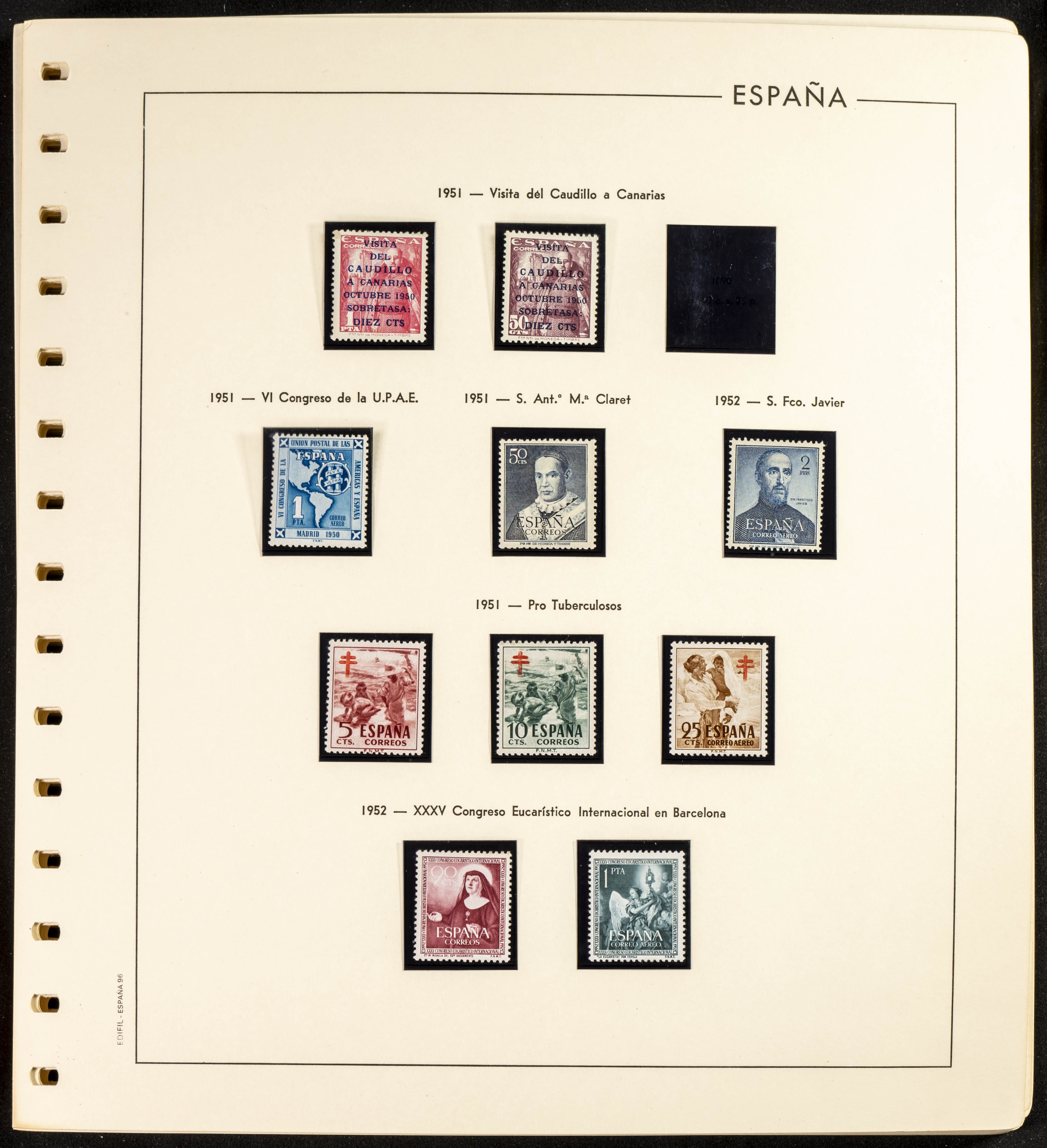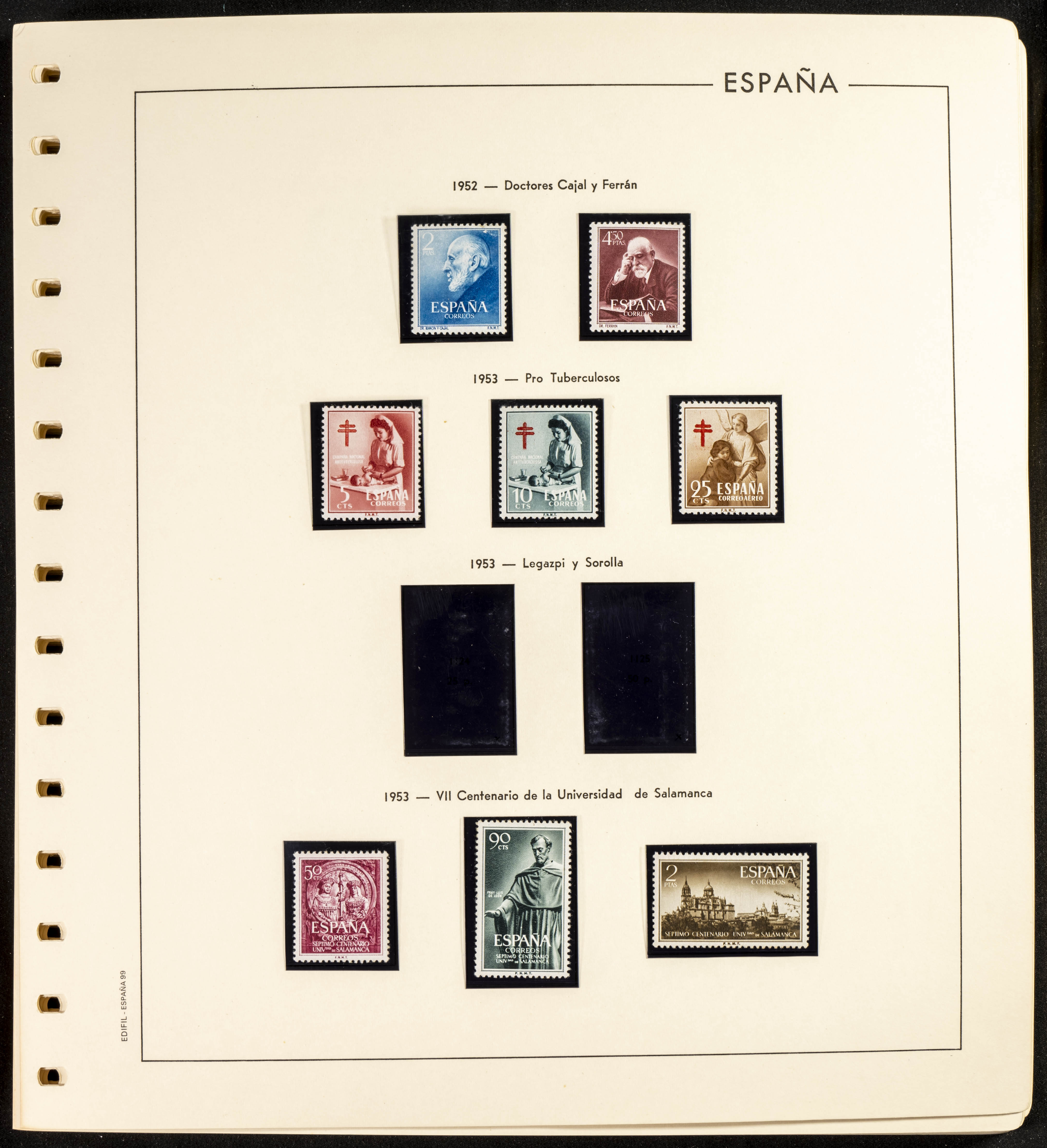 ★★(1950ca). Colección completa desde 1950 a 1999, en nuevo sin fijasellos, a falta de las series clave, algún puntito de óxido en las series de mediana importancia, se incluye alguna Prueba de Lujo y otras piezas interesantes complementarias, además duplicado entre 1990 y 1997 (montada en álbumes Edifil de piel). IMPRESCINDIBLE EXAMINAR.