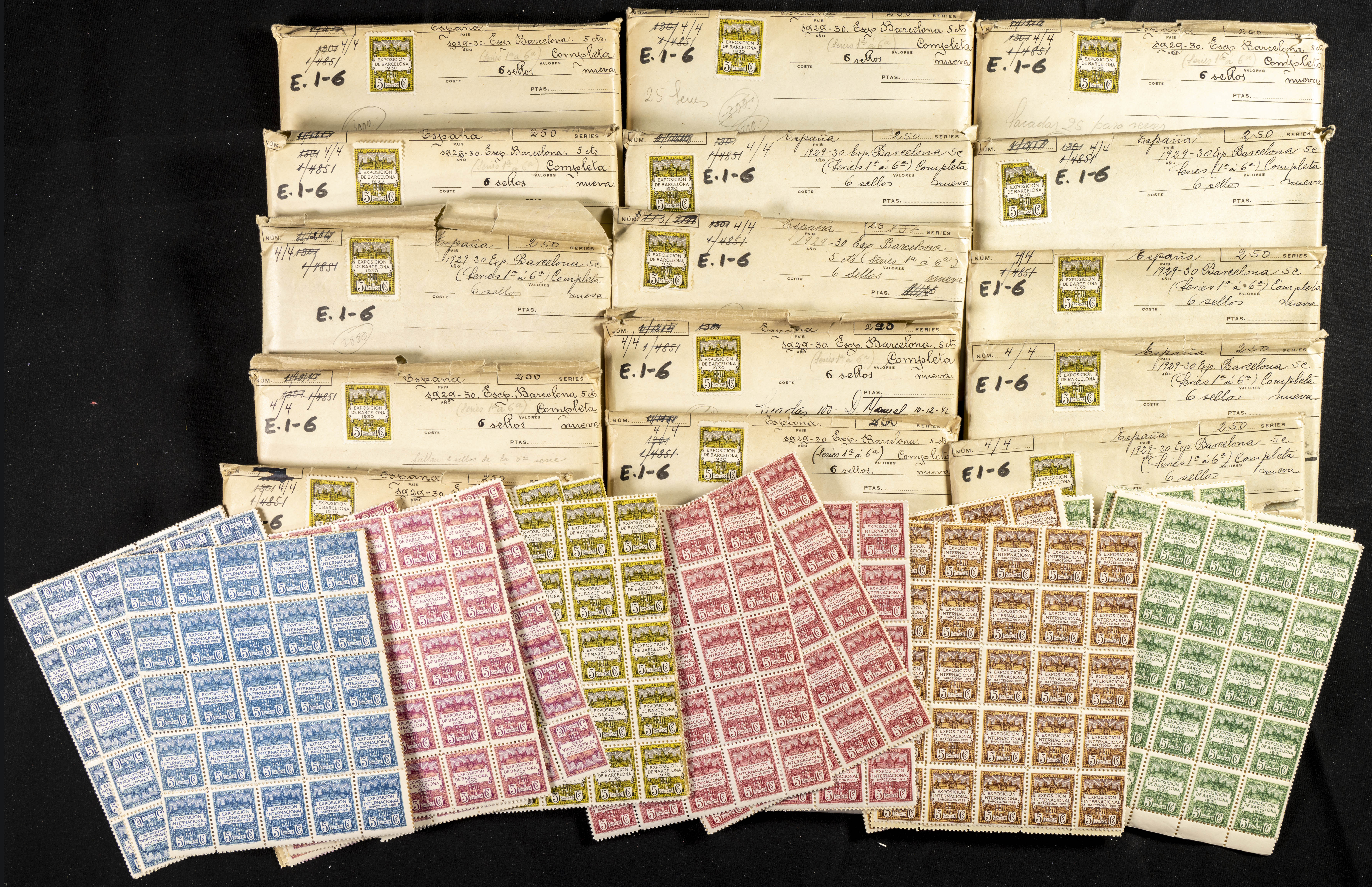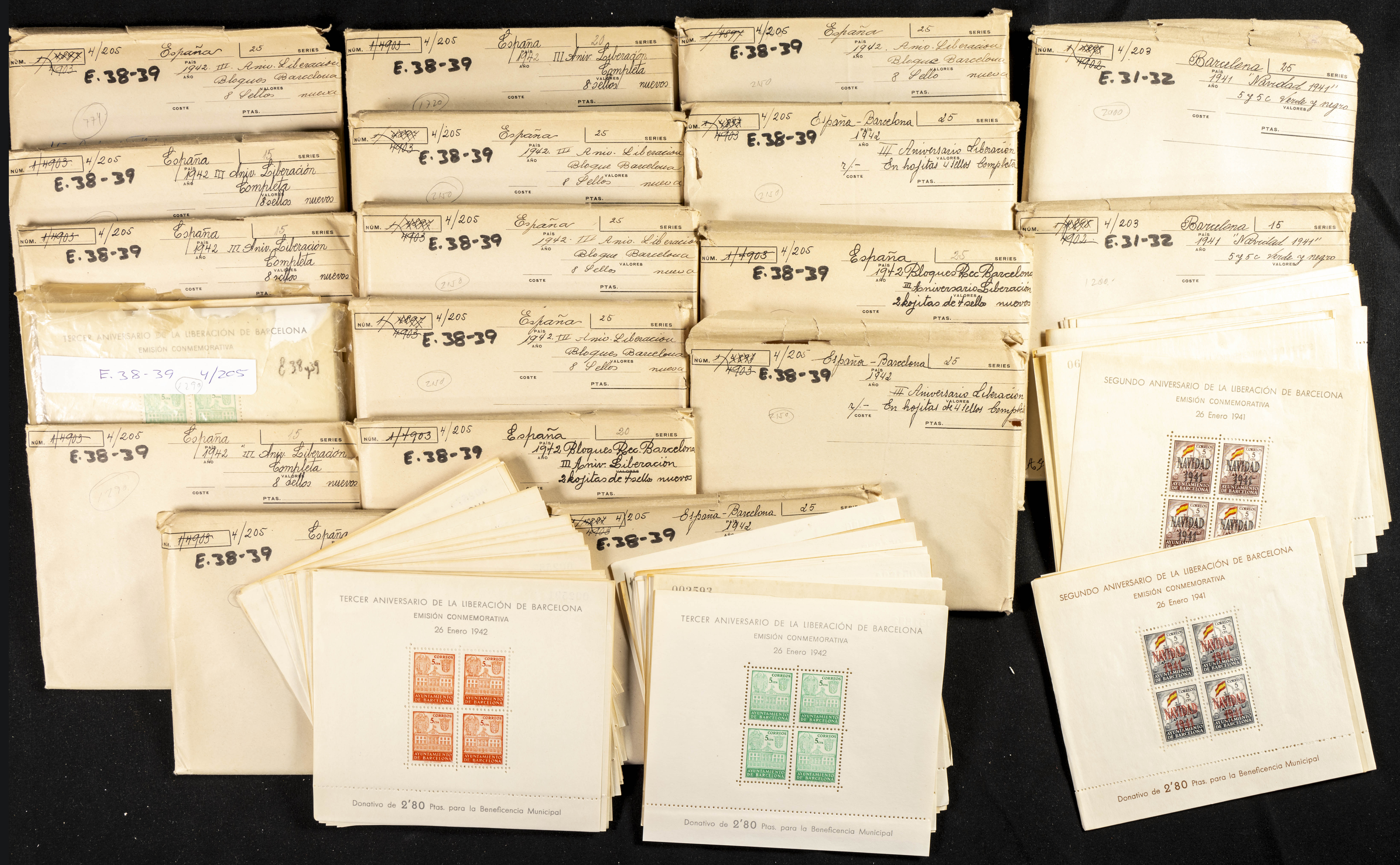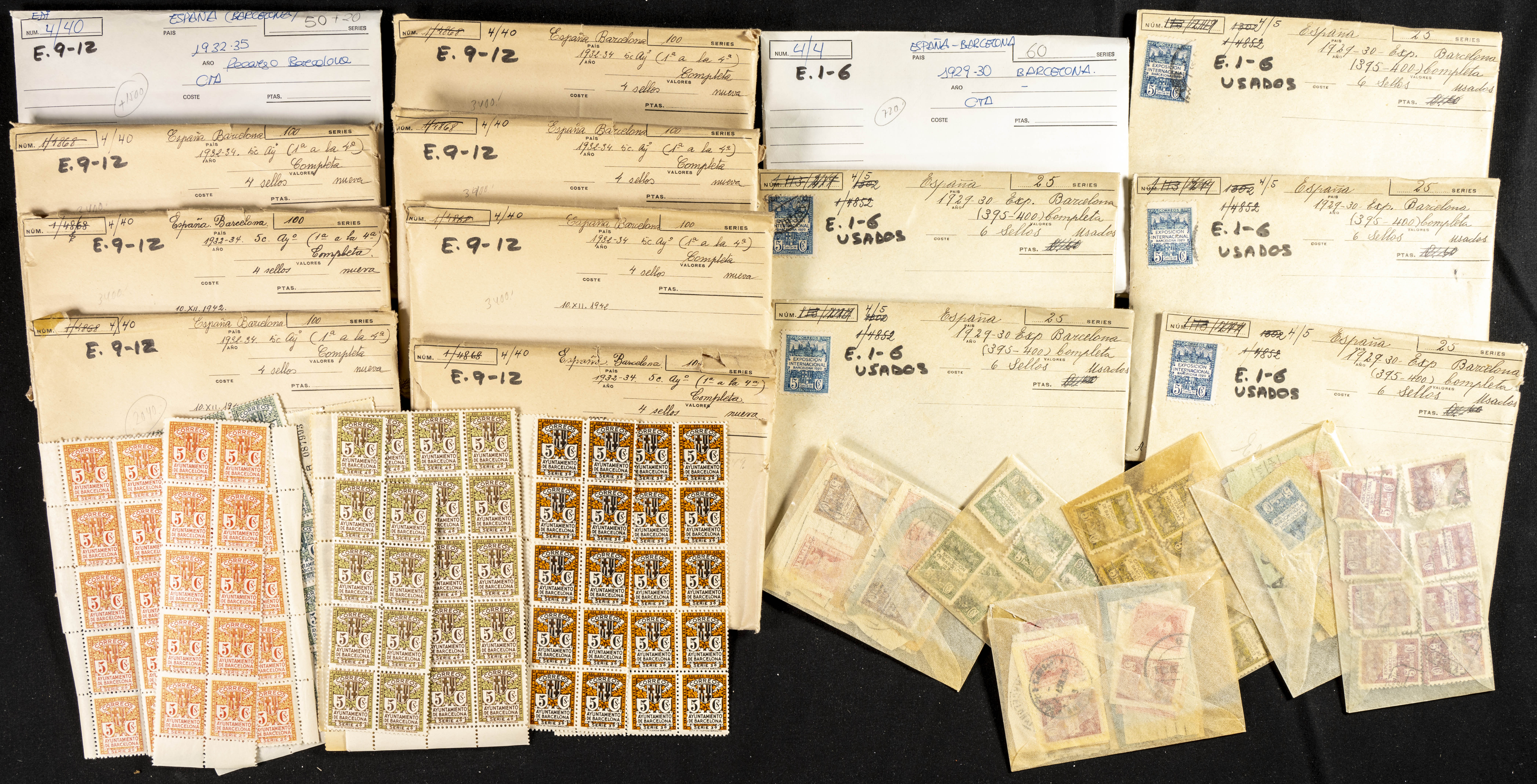 ★★/★(1928ca). Interesantísimo conjunto-stock de comerciante de varios miles de series completas (1928-1932) y juegos completos de hojas bloque (1941-1942) del Ayuntamiento de Barcelona, en nuevo y la mayoría sin fijasellos y organizado en sobres. IMPRESCINDIBLE EXAMINAR. Edifil 2025: ++90.000 Euros