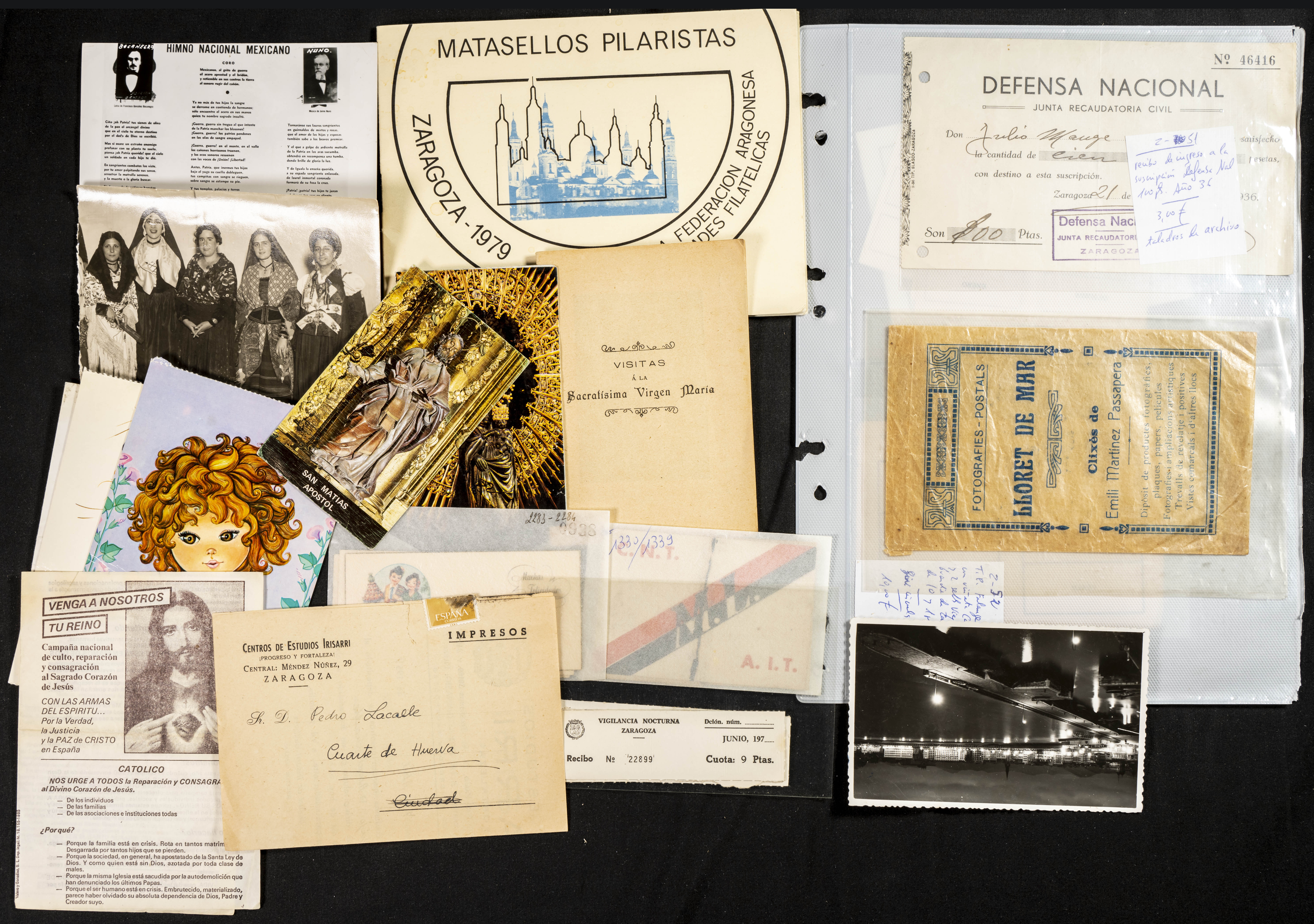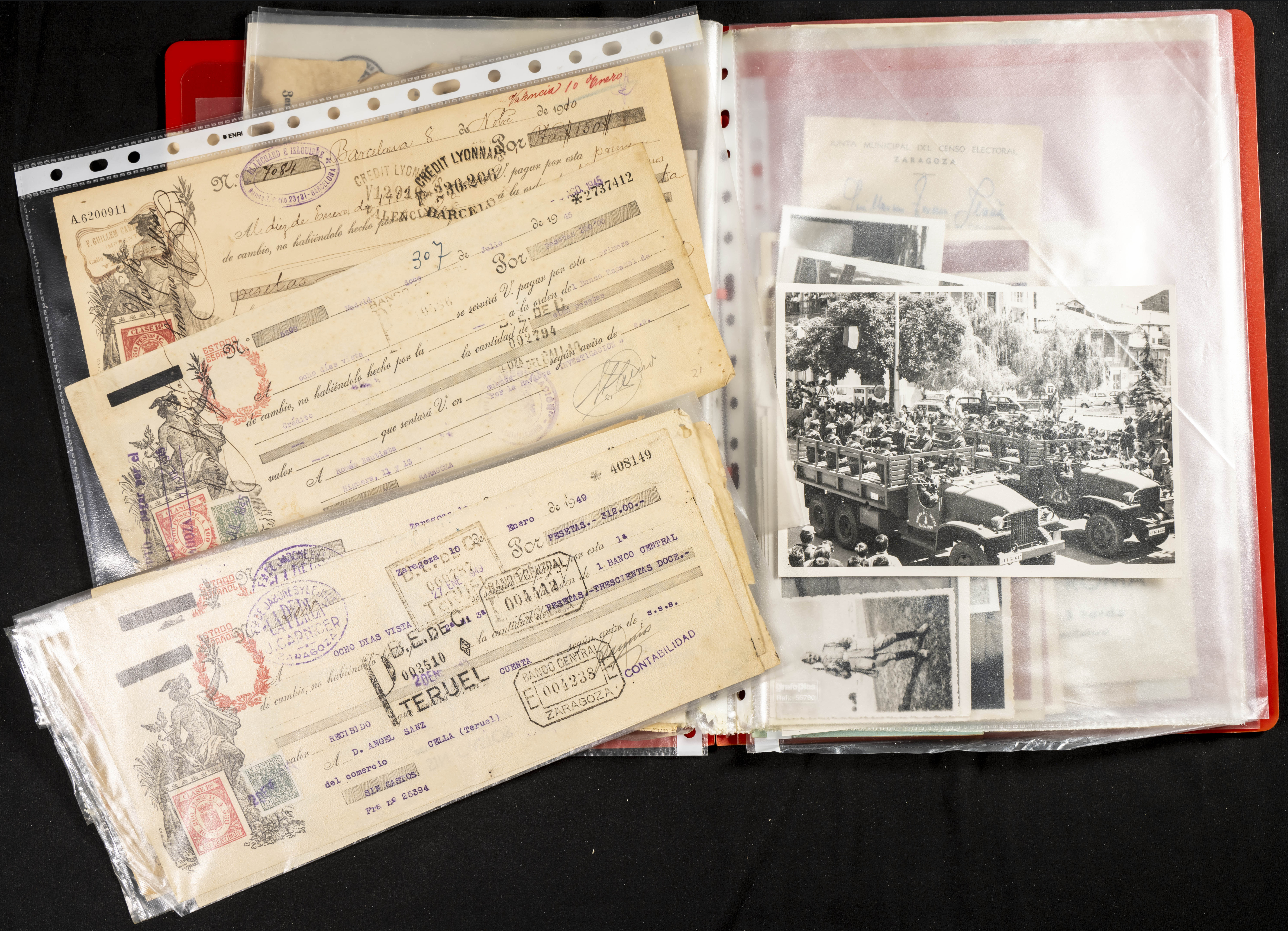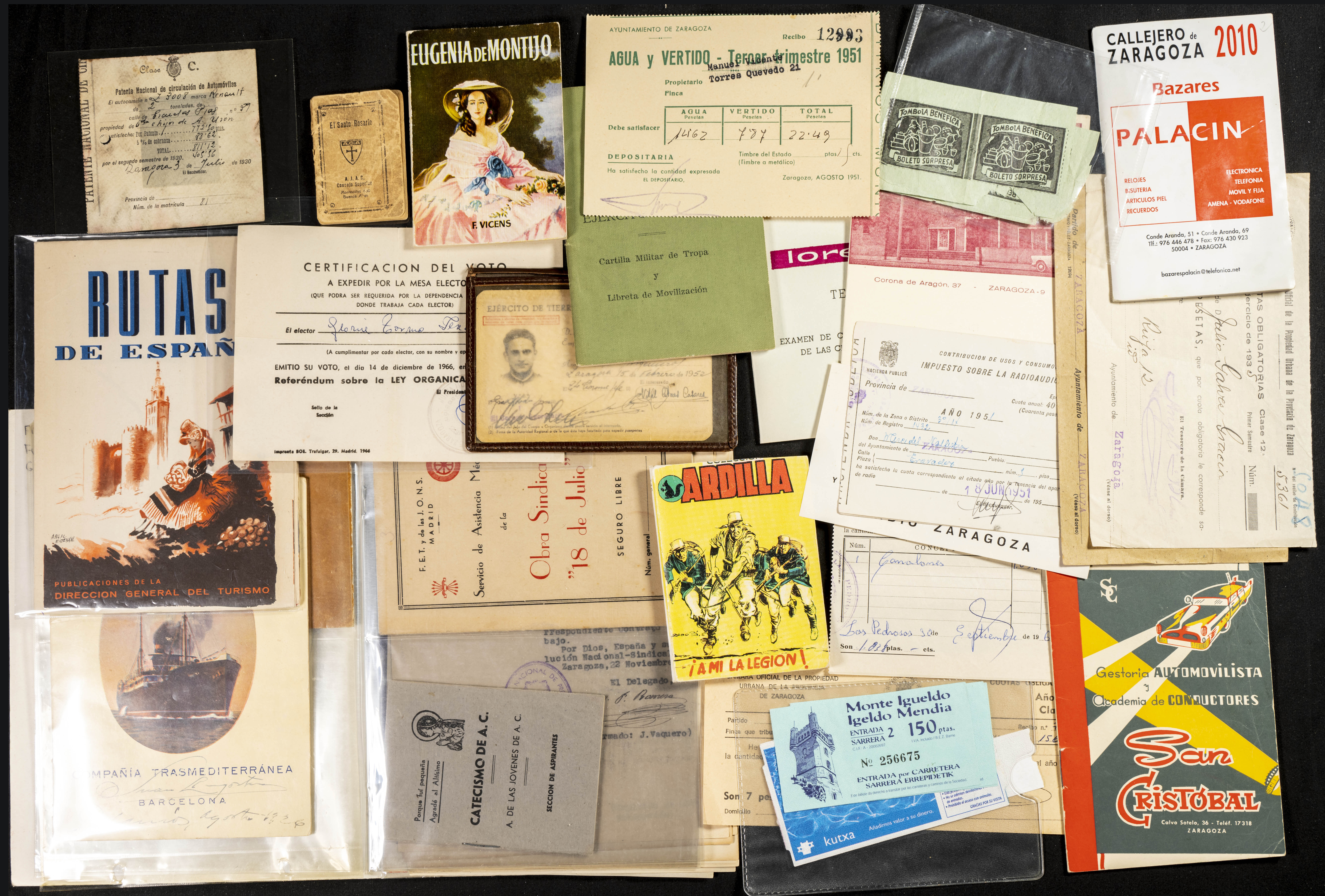 (1880ca). Conjunto de cientos de documentos (Recibos, Facturas, Folletos, Acciones, Fiscales, Cheques, Fotografías, Tarjetas Postales, Entradas, etc), relacionados con la ciudad de Zaragoza (algunos de Huesca y Teruel) y comprendidos entre 1880 y 1990. A EXAMINAR.