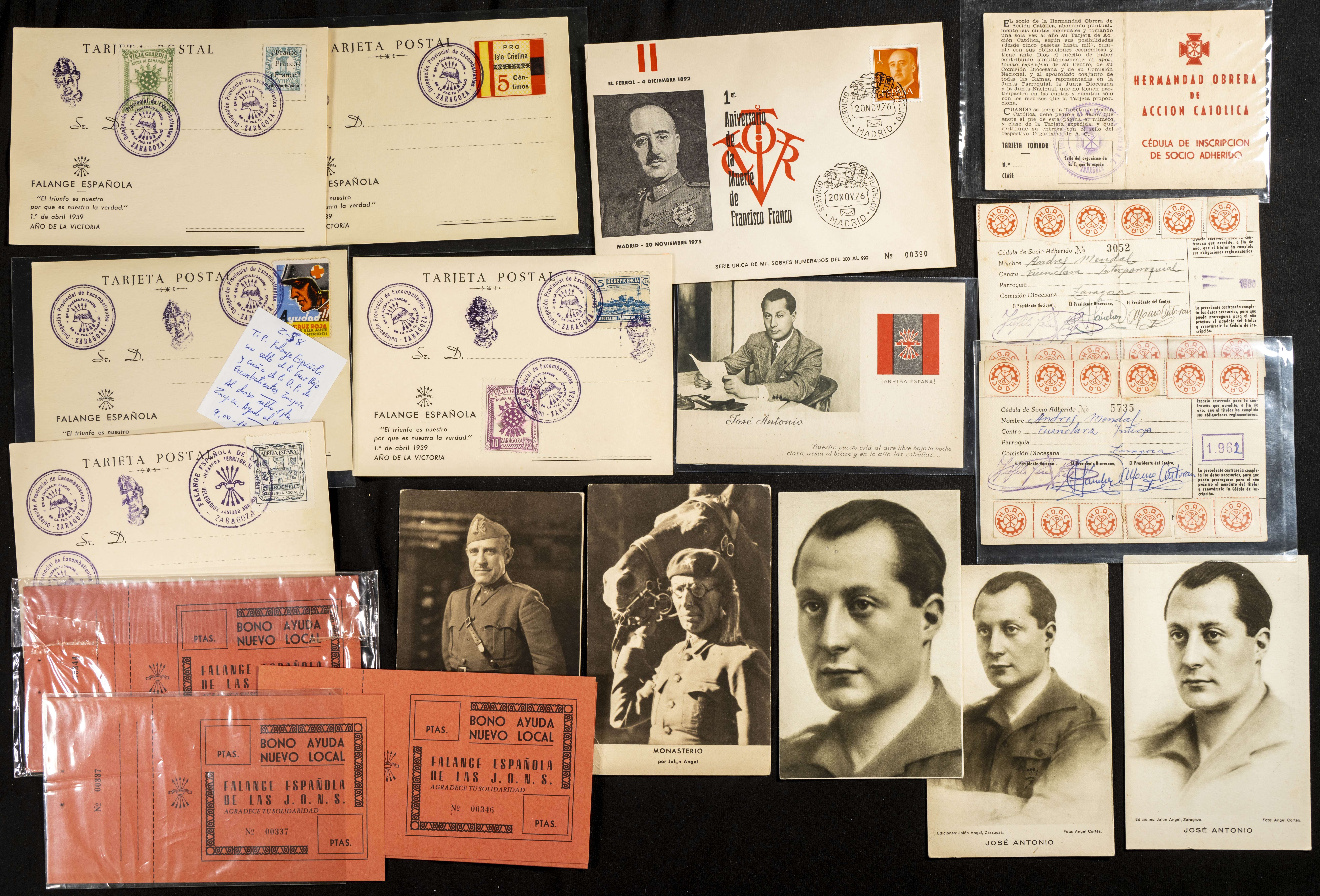 ★★/★(1937ca). Interesante conjunto de sellos Locales Benéficos de Falange, la mayoría nuevos e incluyendo tarjetas postales de Combatientes y enfermera de TEOK, varios formularios de Bono-Ayuda de Falange Española de las J.O.N.S. y varias hojas bloque (dentadas y sin dentar) Pro-Requetés nuevas. A EXAMINAR.
