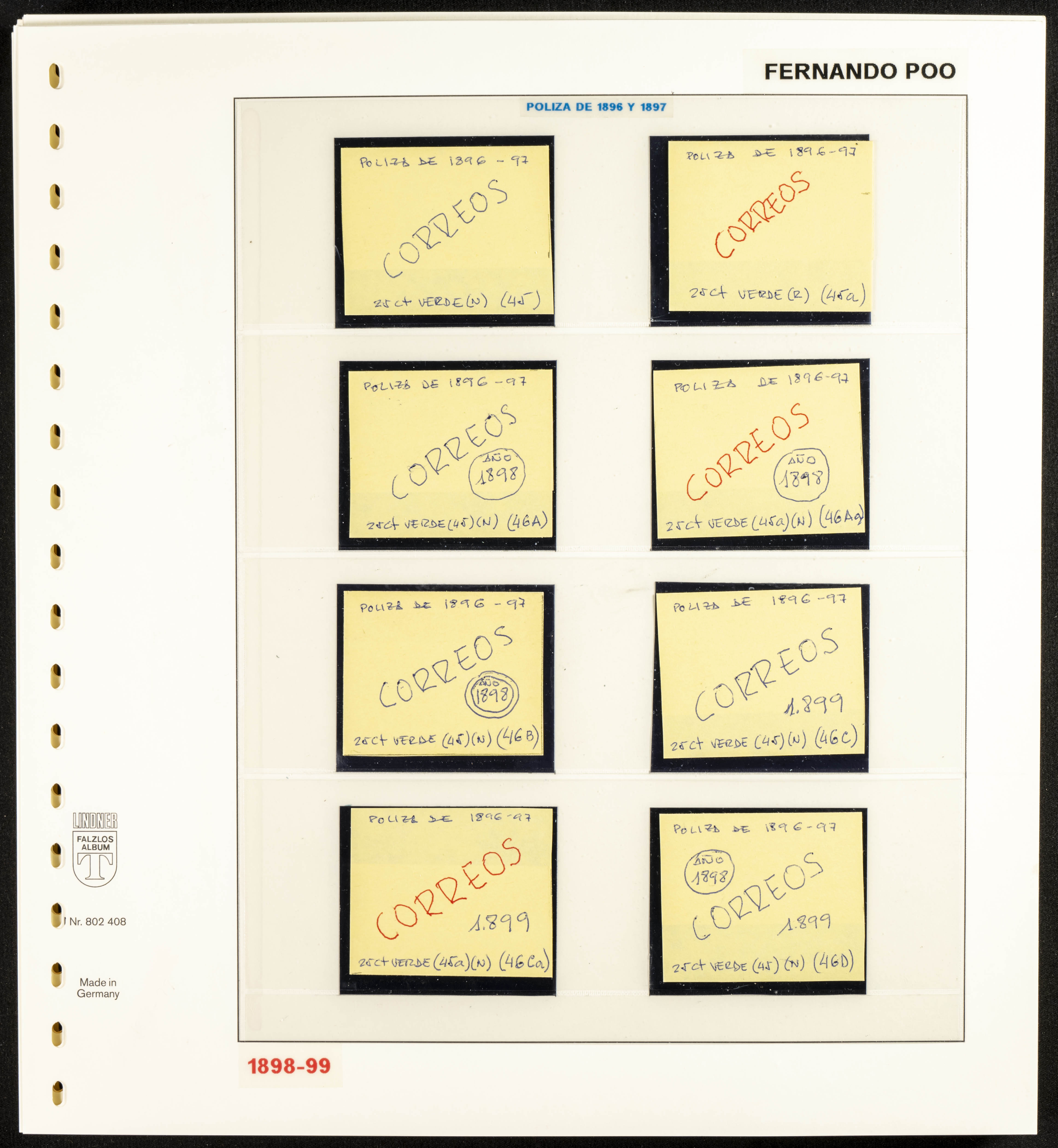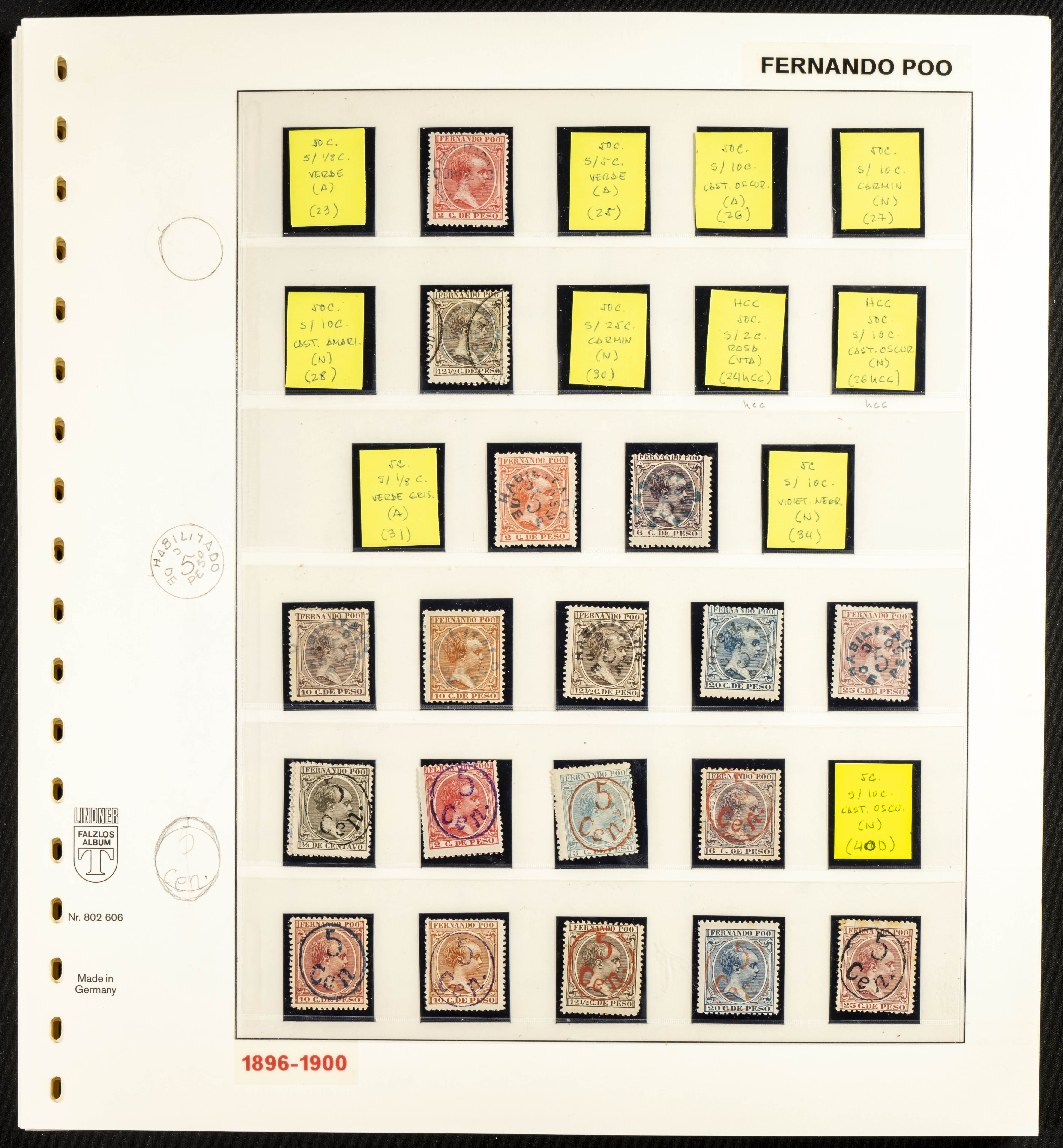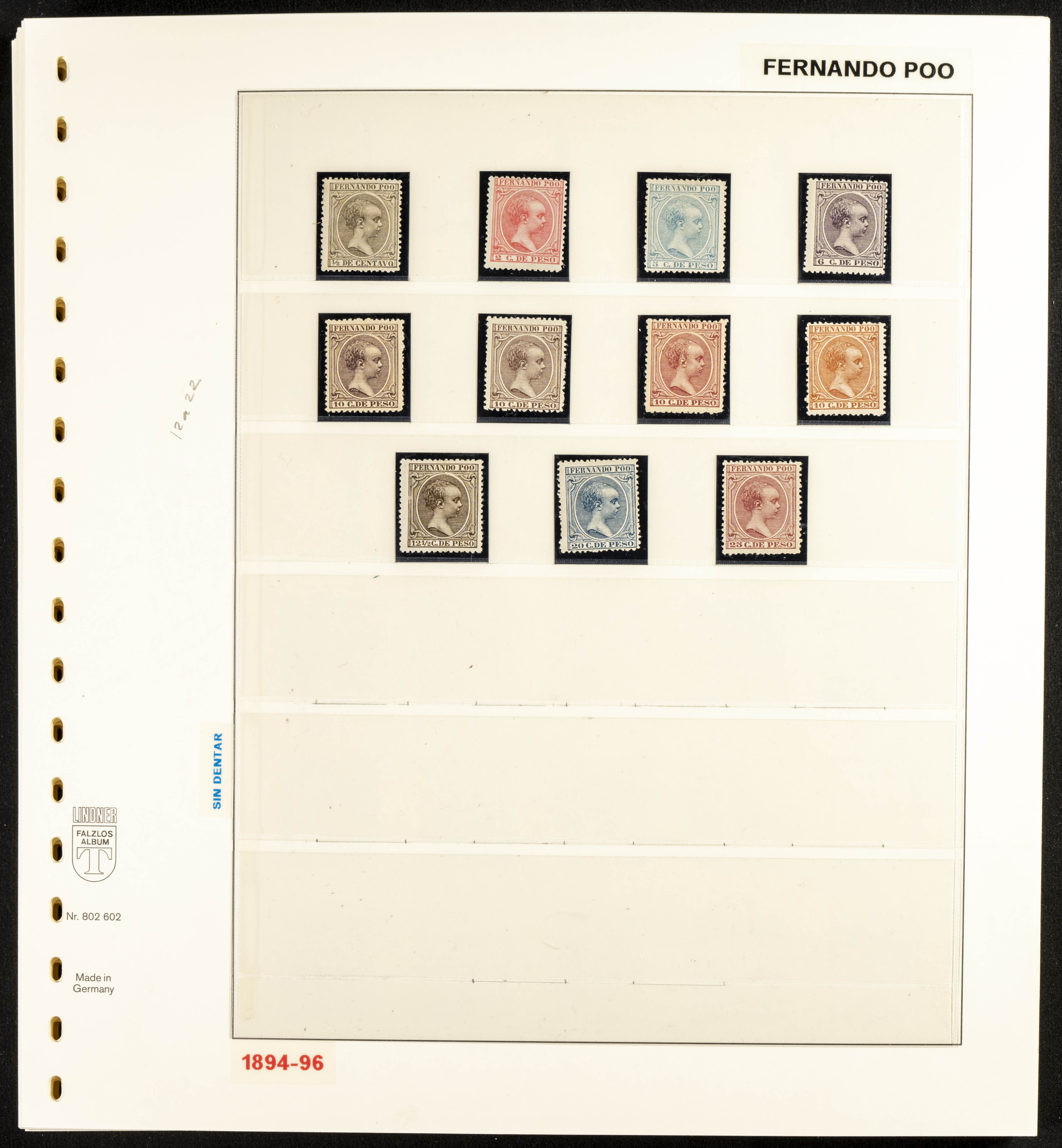 ★★/★(1868ca). Espectacular y muy completa colección de Colonias Españolas de Africa, en nuevo y con numerosas series sin fijasellos, incluye la mayoría de los sellos o series clave de cada Colonia destacando Fernando Poo 1868 20 cts castaño, sobrecargados de 1896, series de tipo infante, primera de Elobey y alguna póliza, Cabo Juby casi completo con alguna sin dentar, Ifni completo, Guinea muy completo, con numeraciones A000000, Muestras y destacando la serie en pareja con dos sobrecargas de 1911, Río de Oro casi completo con series de 1905, 1908 y 1911, Sahara con la mayoría de Dromedarios sobrecargadas y Franco de 1941, Marruecos muy completo con la mayoría de las series, alguna sin dentar y Tánger prácticamente completo. IMPRESCINDIBLE EXAMINAR.