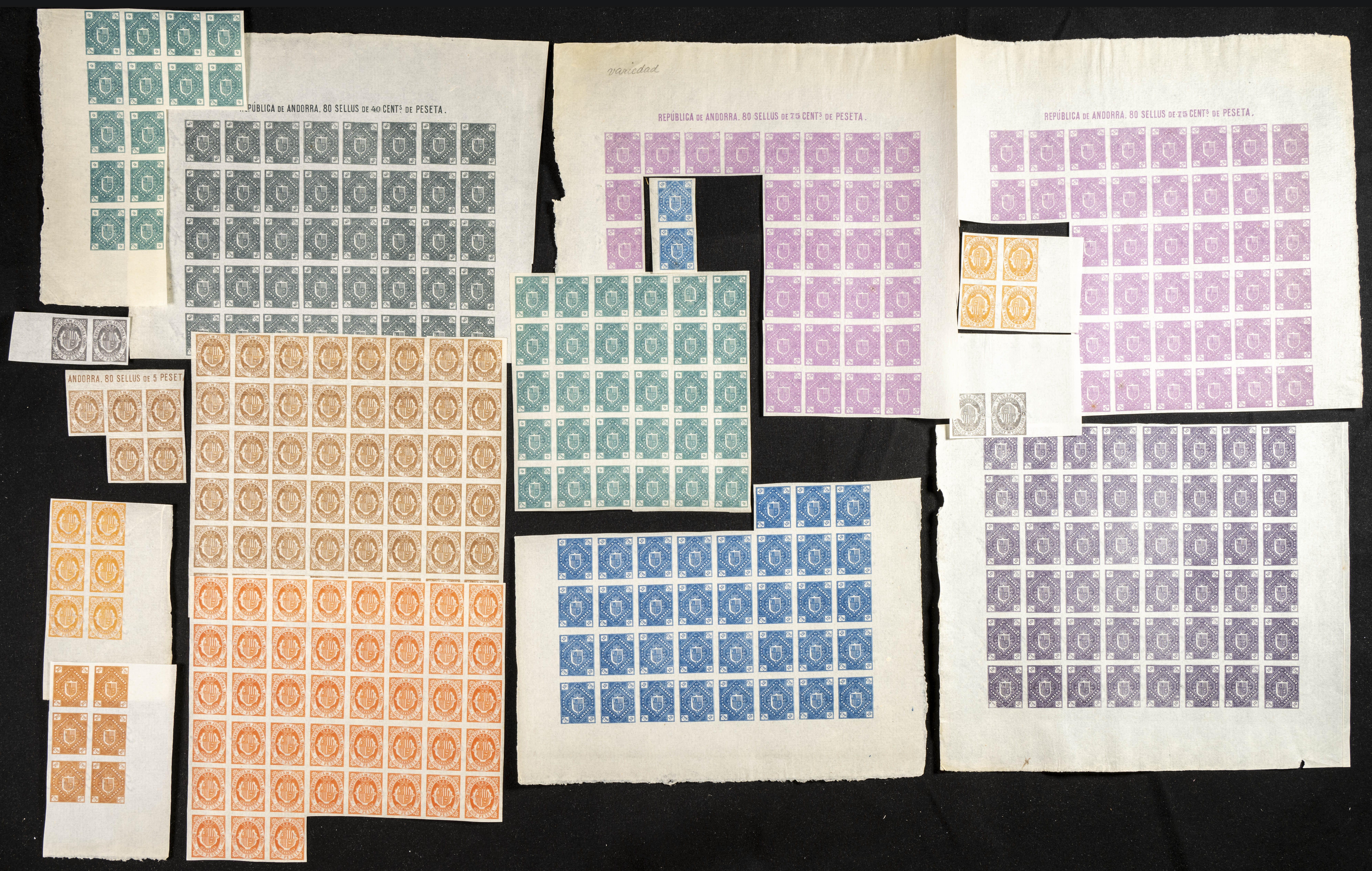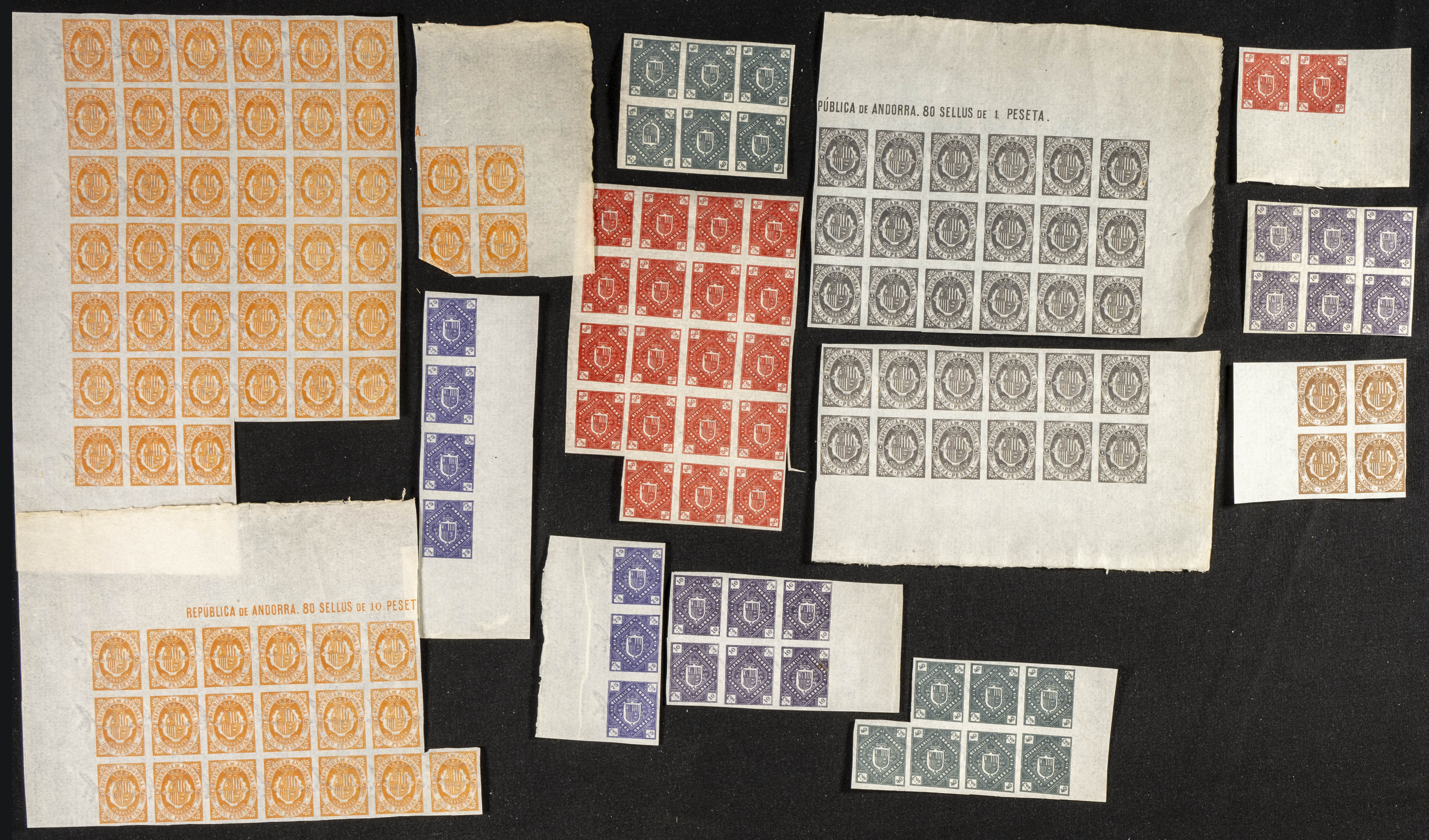 ★/(★)1896. Conjunto de varios cientos de sellos sueltos o en bloques de la primera emisión no emitida sin dentar de Andorra Española de 1896, se pueden componer varias series sólo a falta del 25 cts castaño. ALTO VALOR DE CATALOGO. A EXAMINAR.