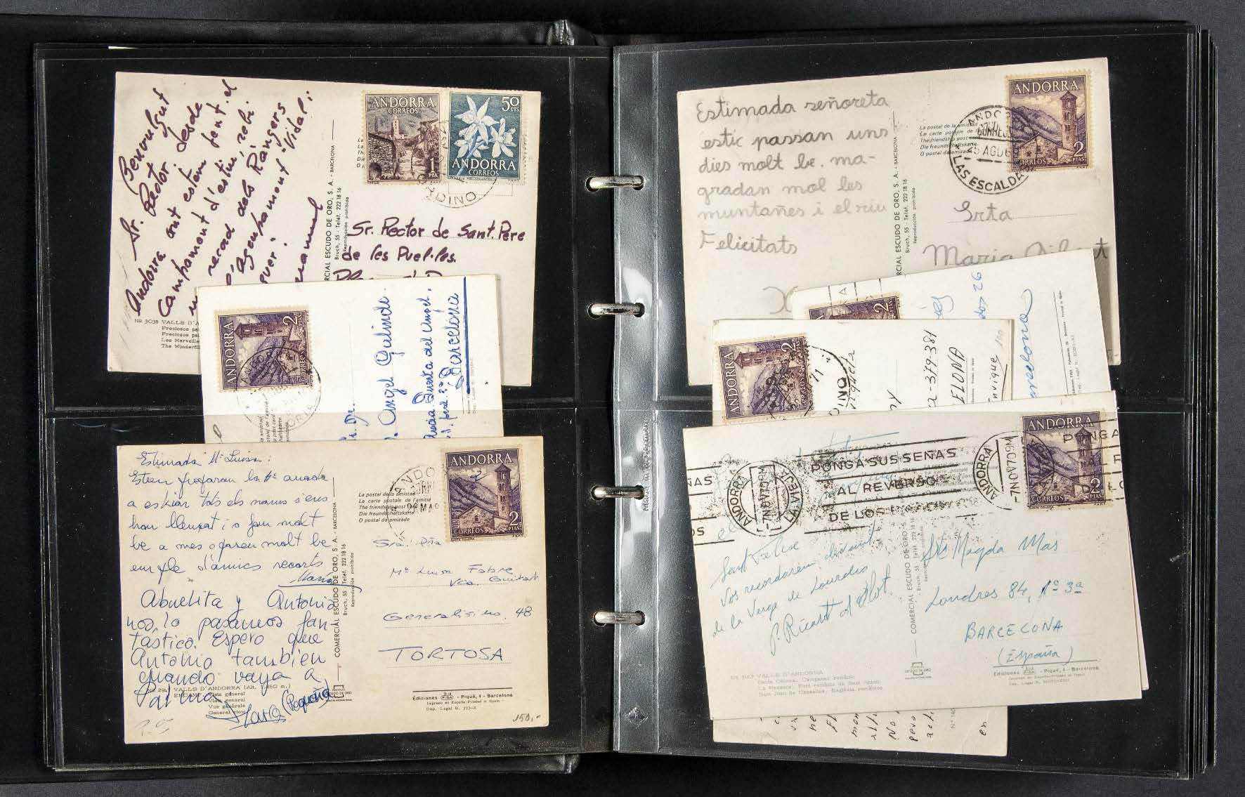 (1952ca). Interesante conjunto de más de doscientas tarjetas postales circuladas desde Andorra y franqueadas con sellos españoles y andorranos entre 1952 y 1988, algunas con sellos del Correo Francés. A EXAMINAR.