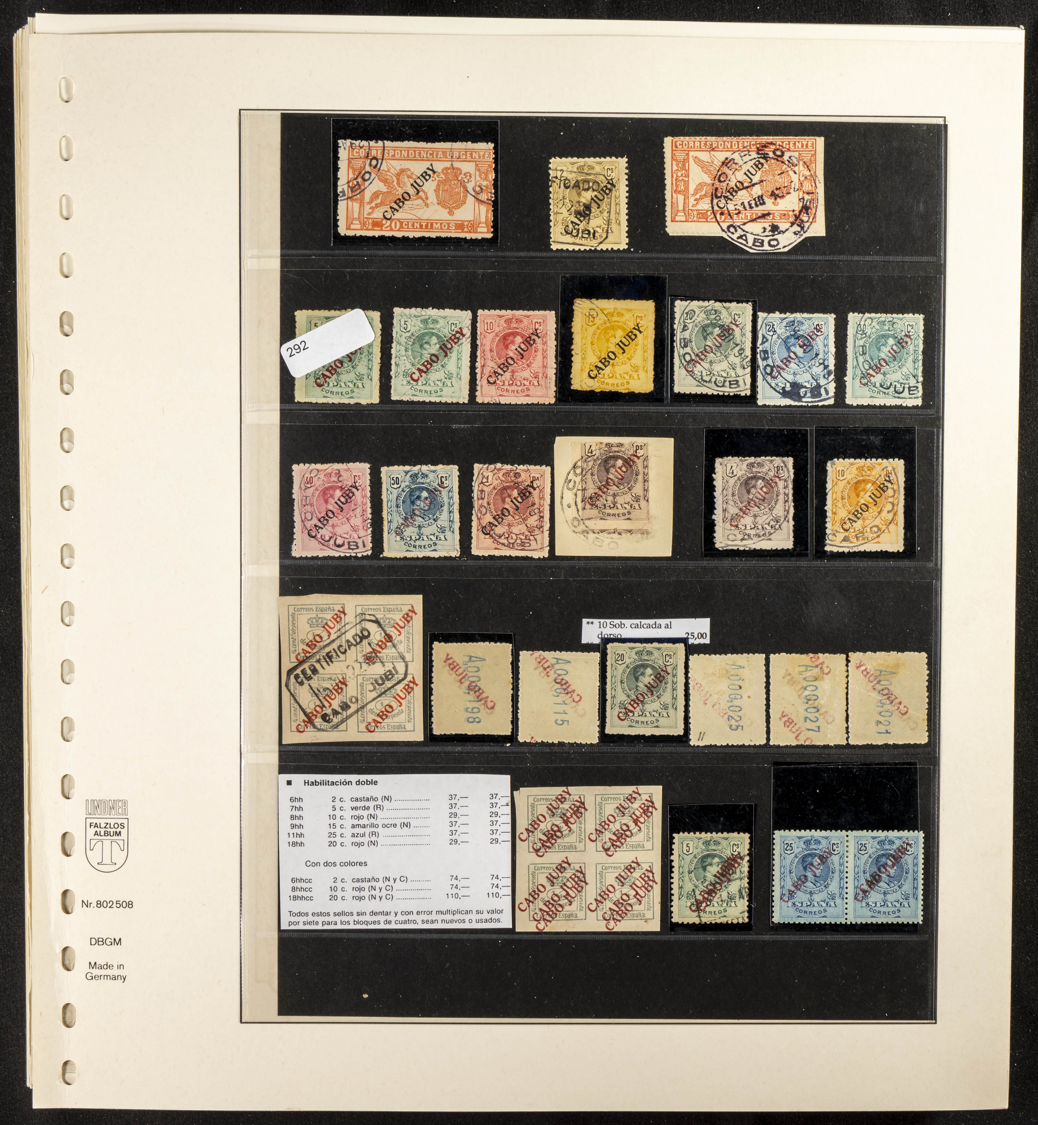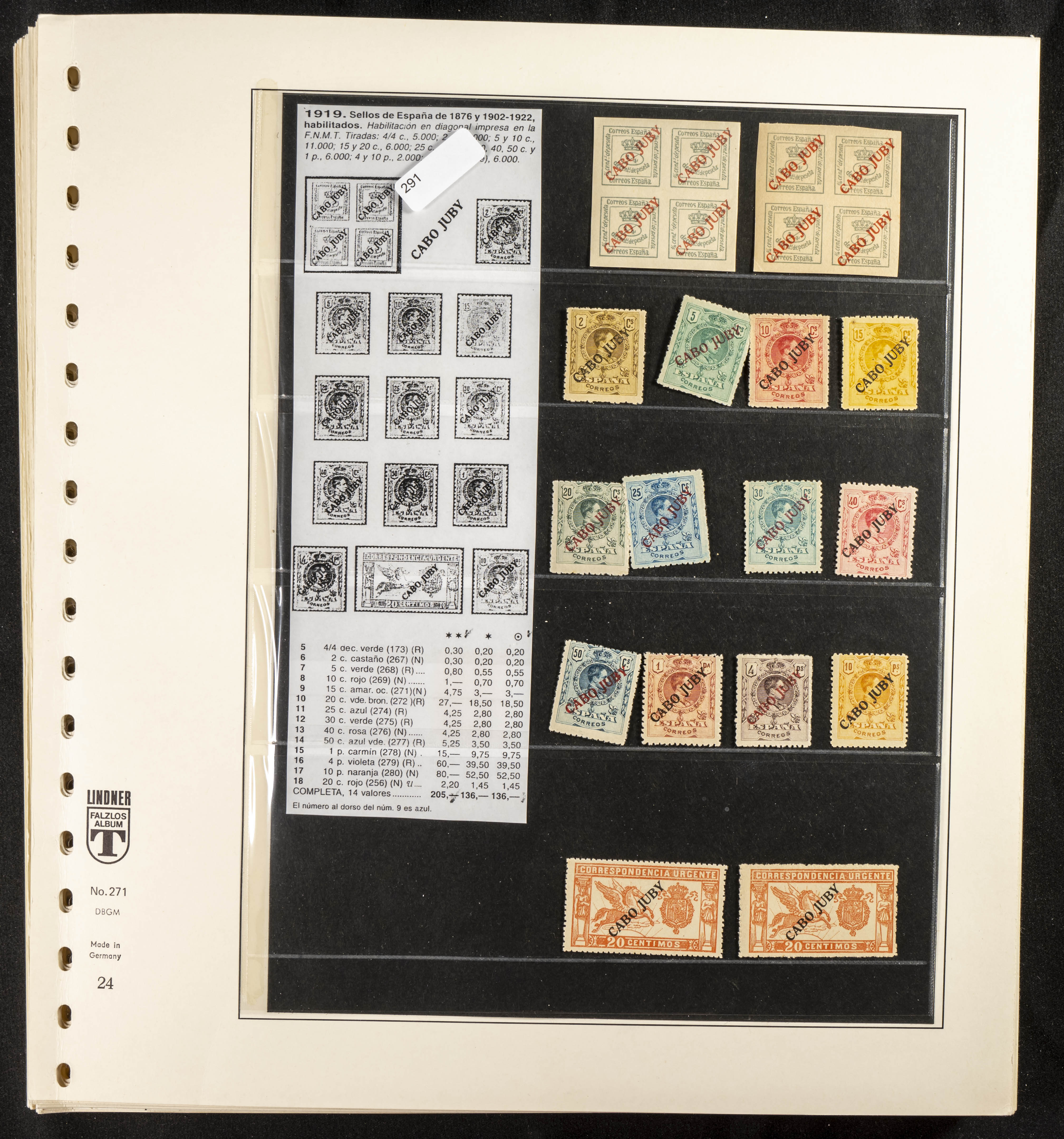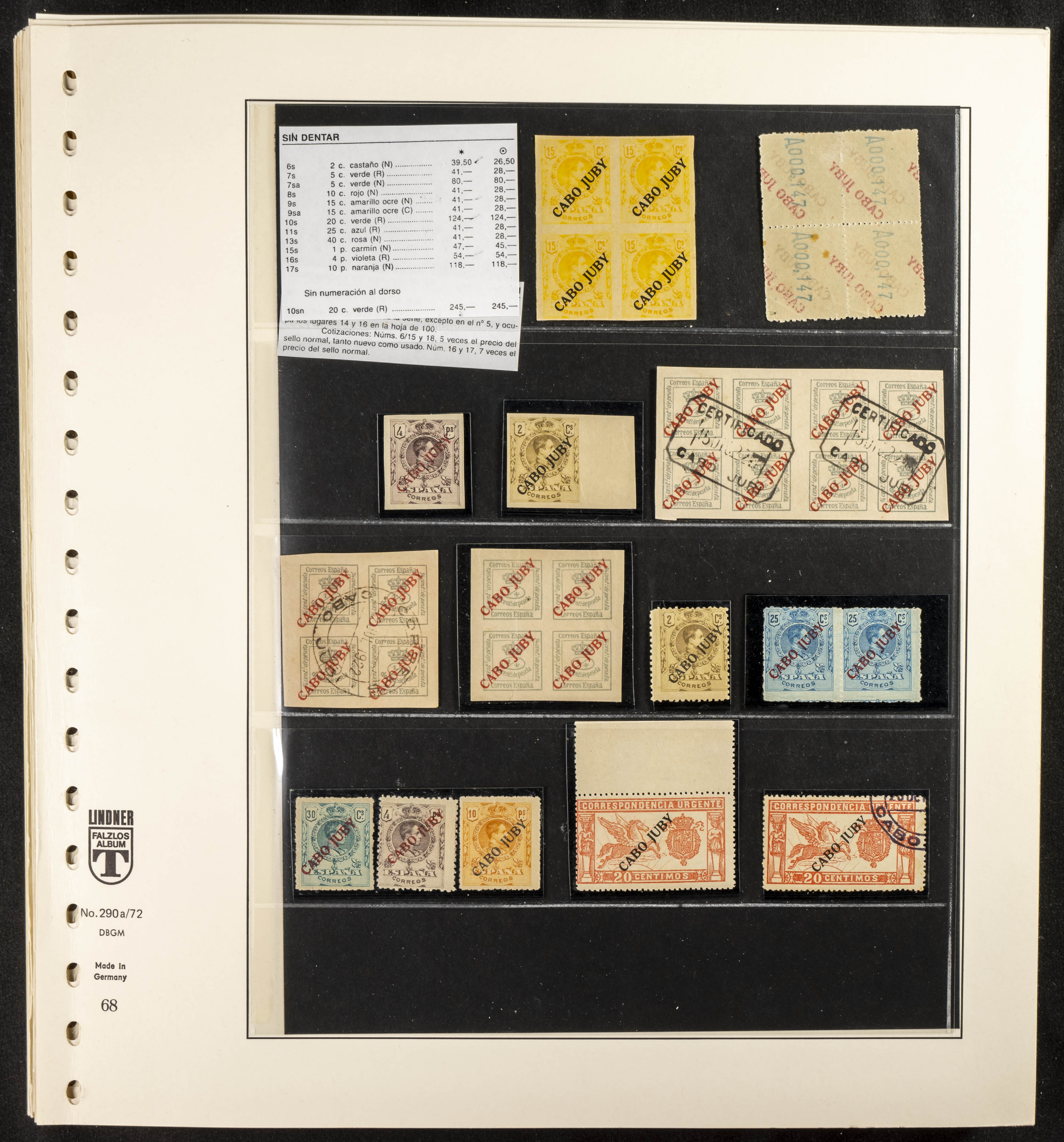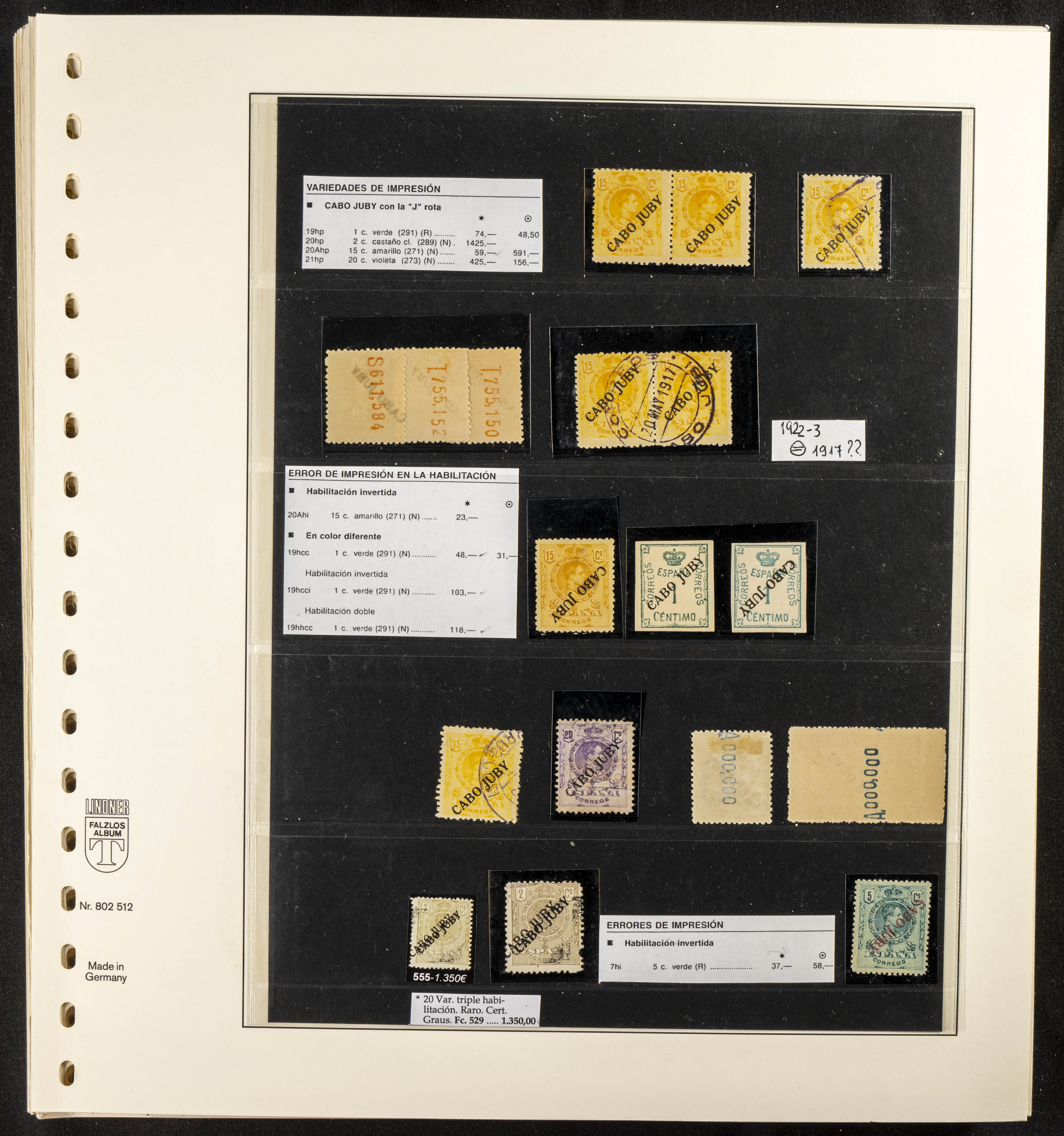 ★/(1919ca). Interesantísima y muy completa colección de Cabo Juby entre 1919 y 1948, en nuevo y usado e incluyendo numerosas variedades (sin dentar, ceros, "J" corta, sobrecargas dobles e invertidas, taladros muestra, etc), así como cartas circuladas. ALTISIMO VALOR DE CATALOGO. IMPRESCINDIBLE EXAMINAR. Edifil 2018: +10.000 Euros