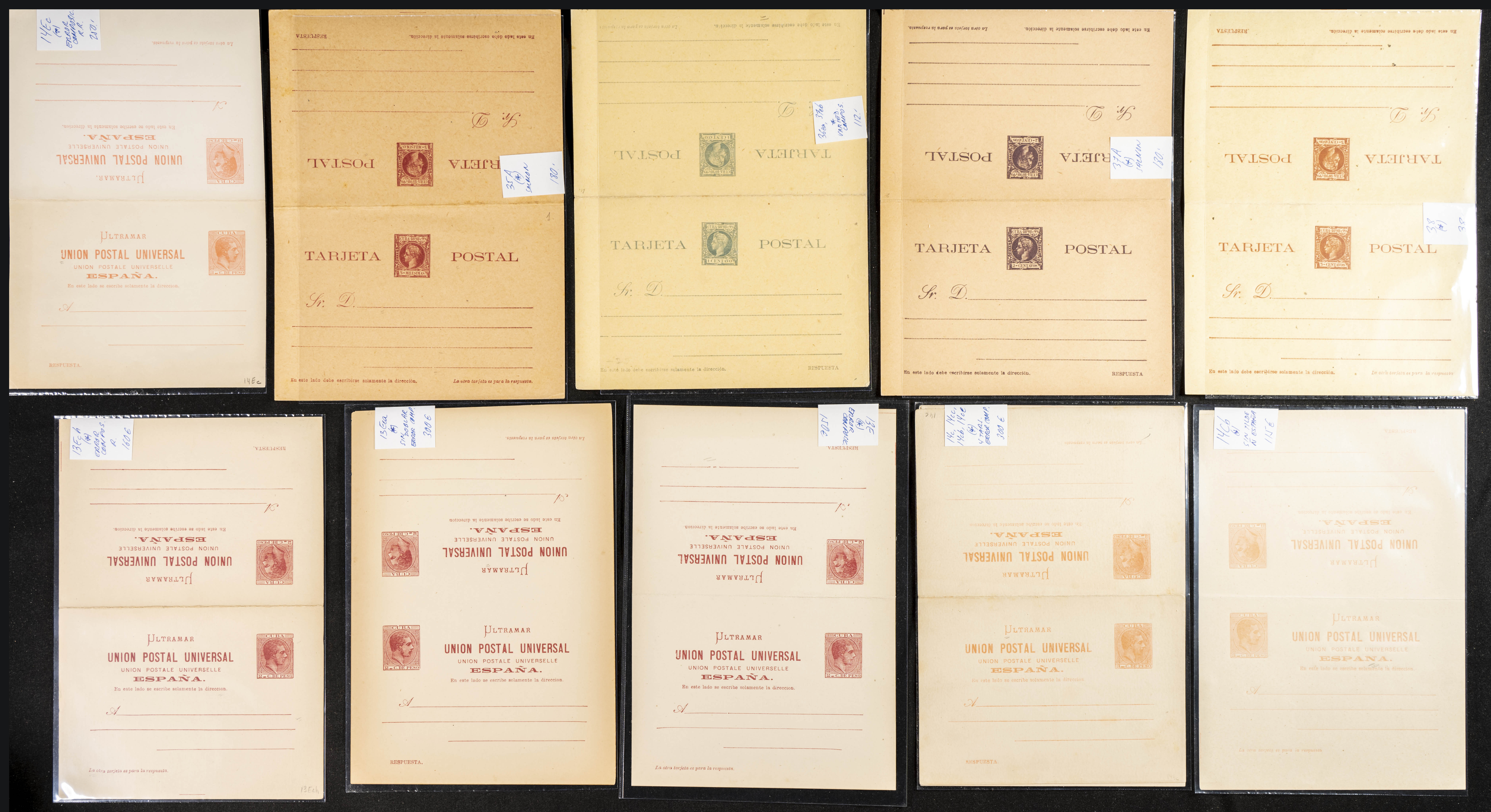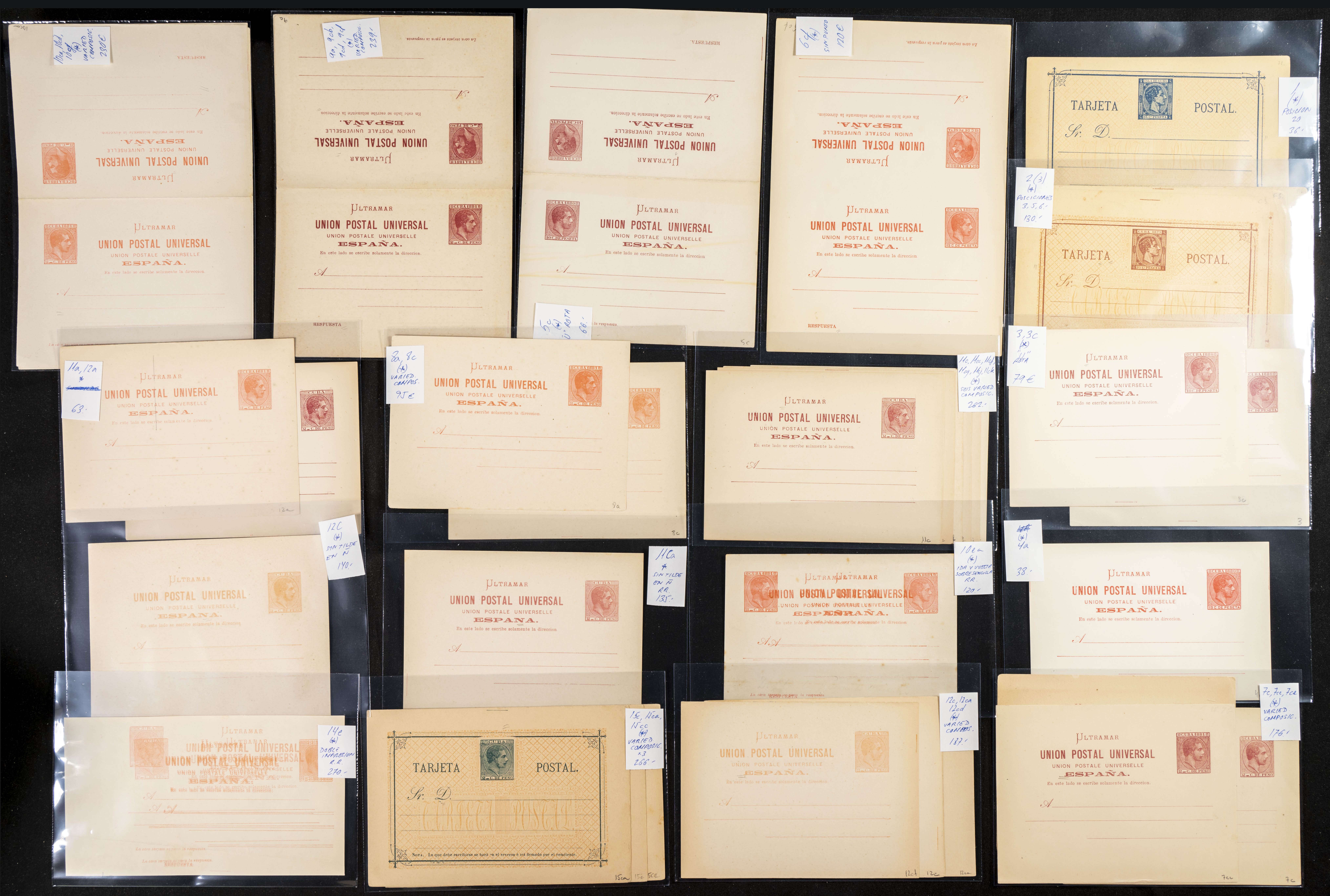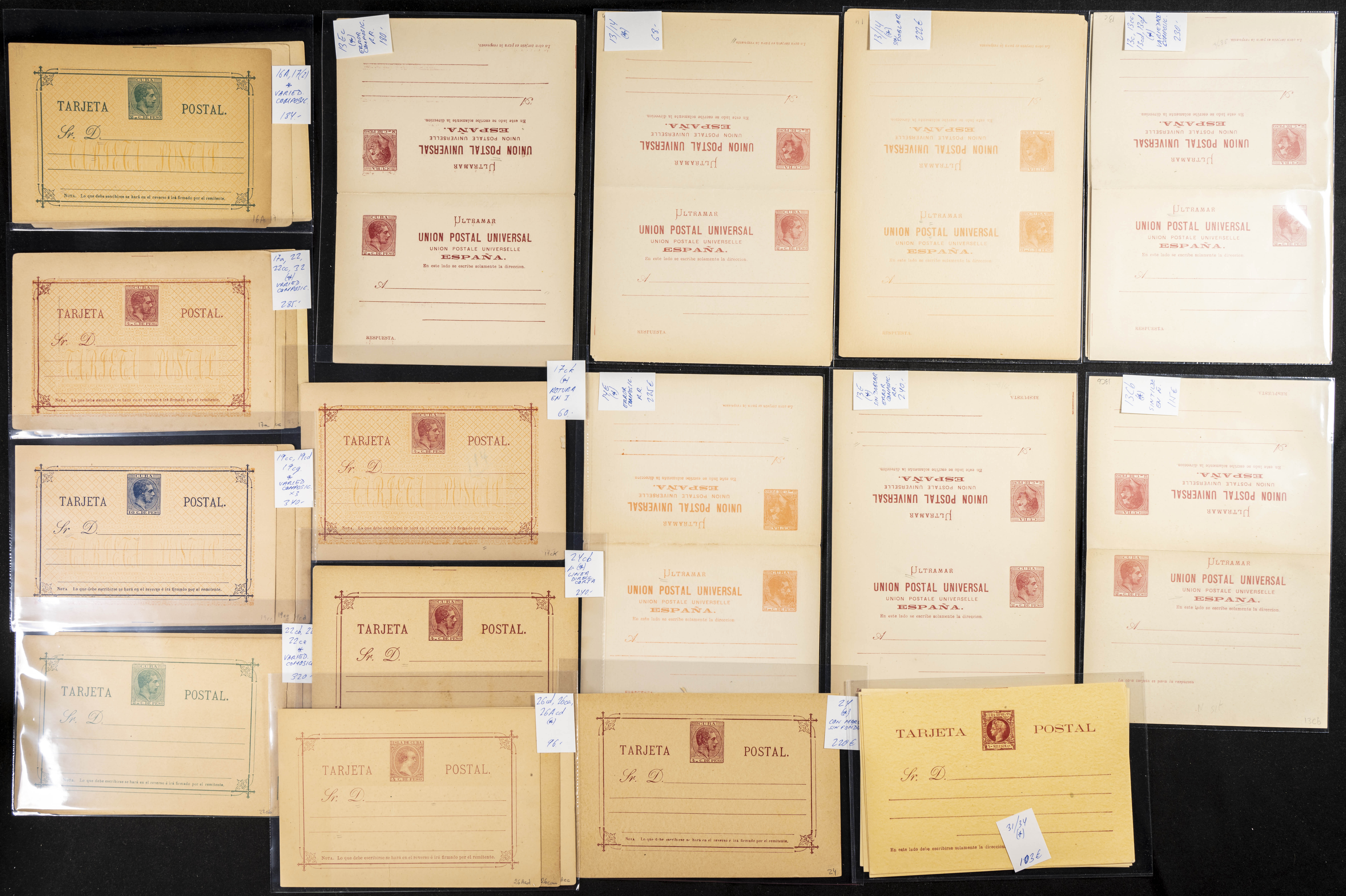 (★)(1878ca). Interesante conjunto-colección de Tarjetas Entero Postales de Cuba entre 1878 y 1898, en nuevo y con variedades diversas (errores de composición, variedades de composición, cartulina diferente, doble impresión, etc), algunas muy raras. A EXAMINAR. Edifil 2019: 7.565 Euros