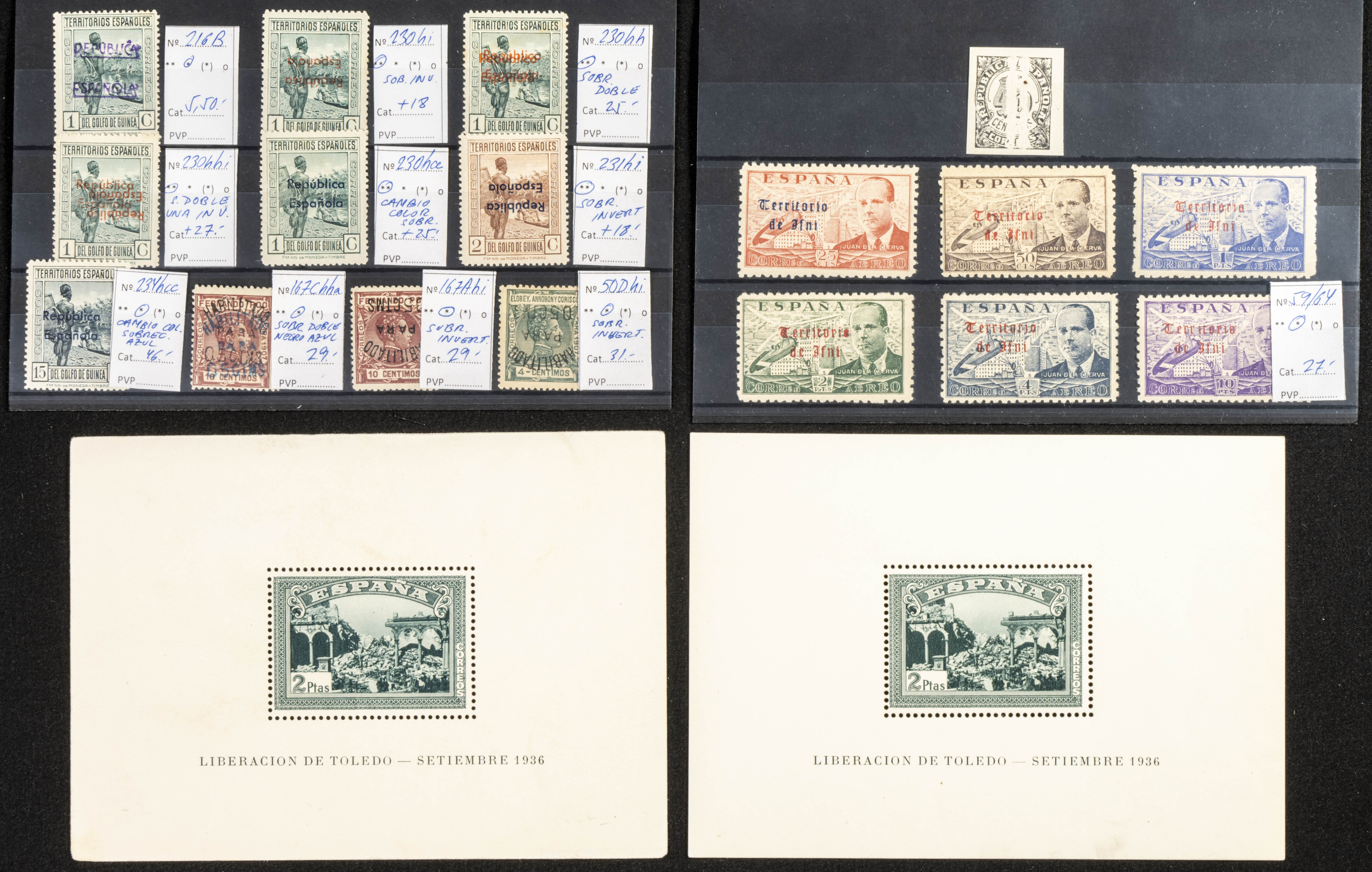 ★★/★(1931ca). Conjunto de variedades de sobrecarga de Elobey, Fernando Poo y Guinea, en nuevo e incluye una serie completa de Ifni, una prueba limada de 45 cts de España (Cifras no emitida) y dos hojas bloque de Toledo de 2 pts verde (arruguitas). A EXAMINAR. Edifil 2018: +350 Euros