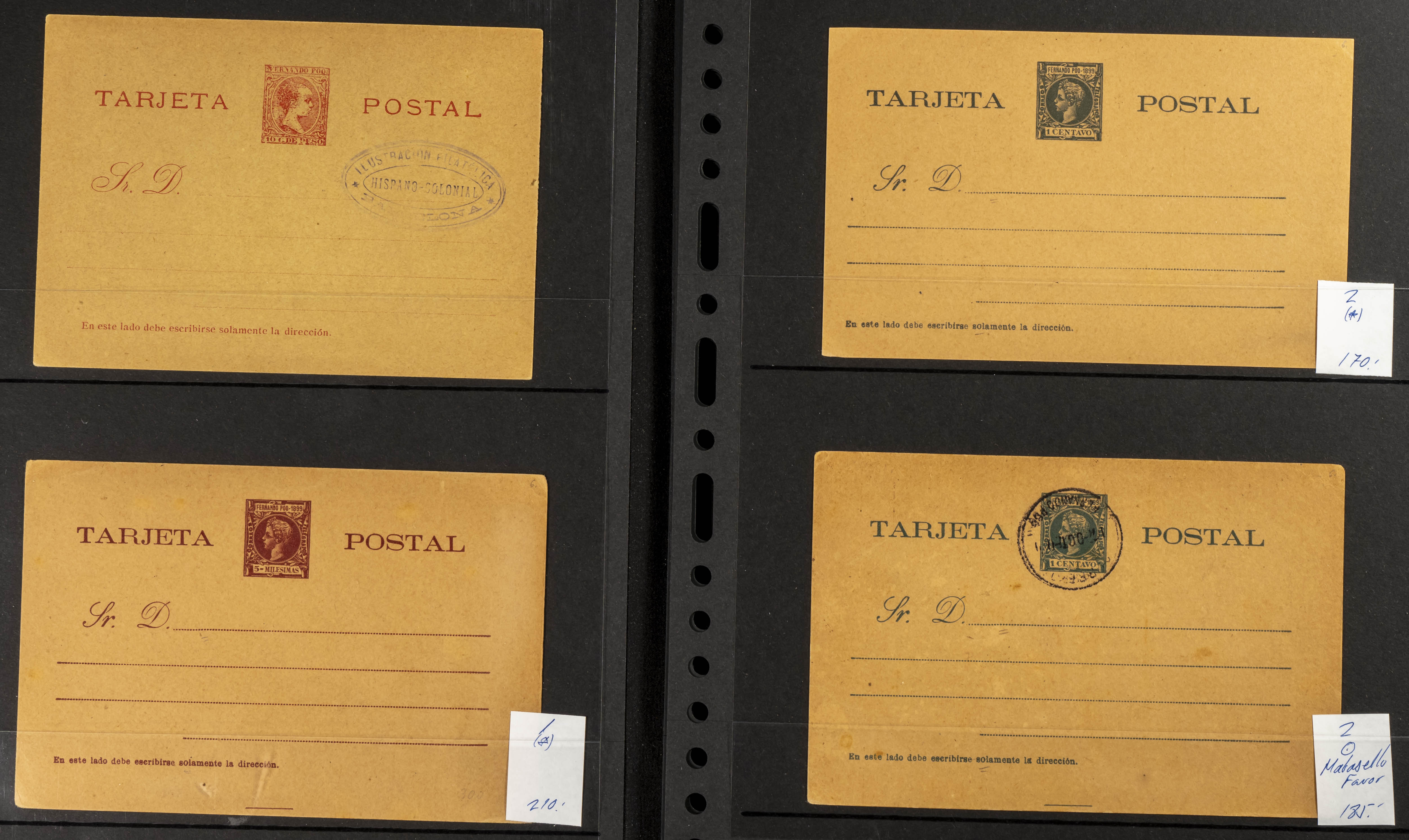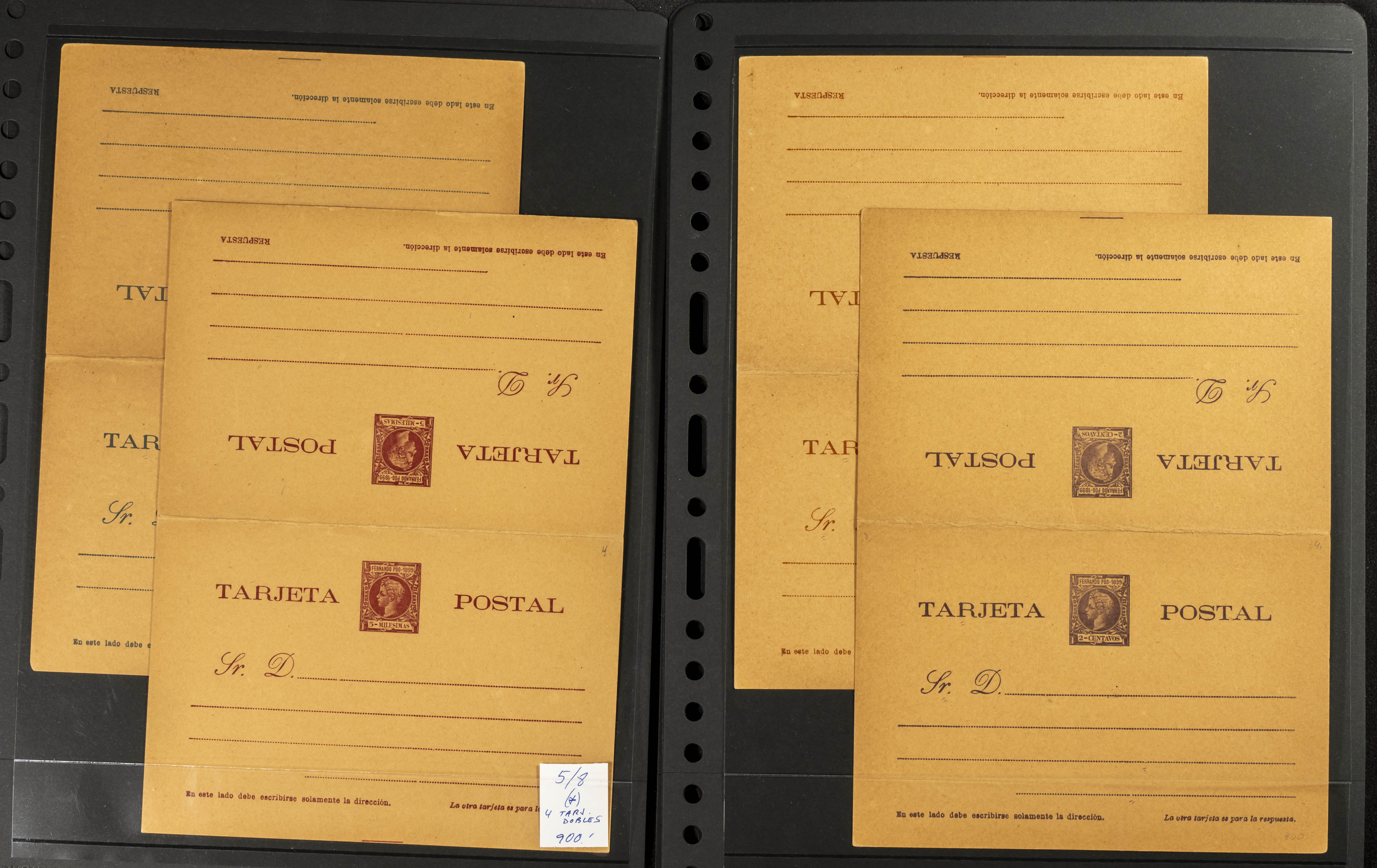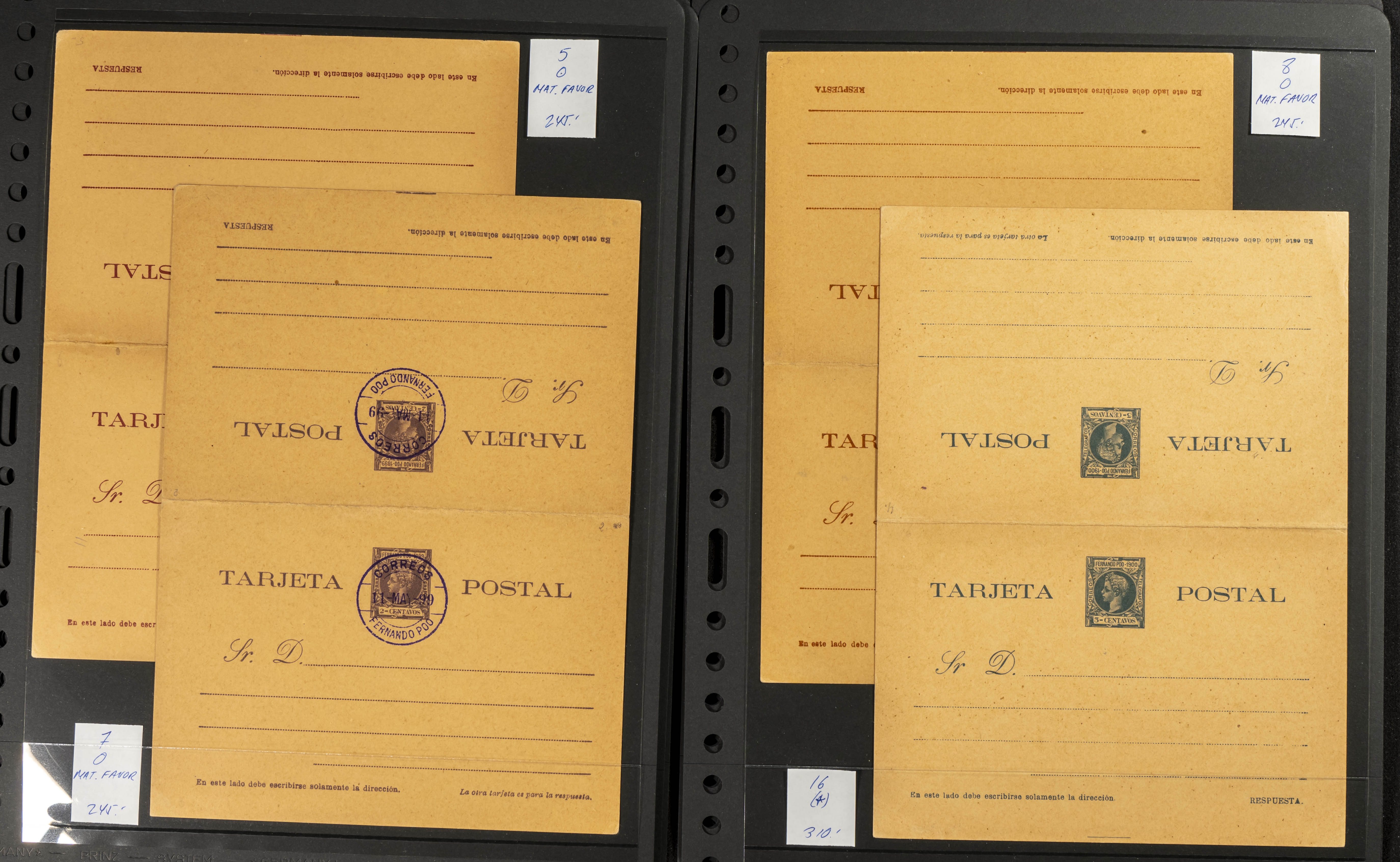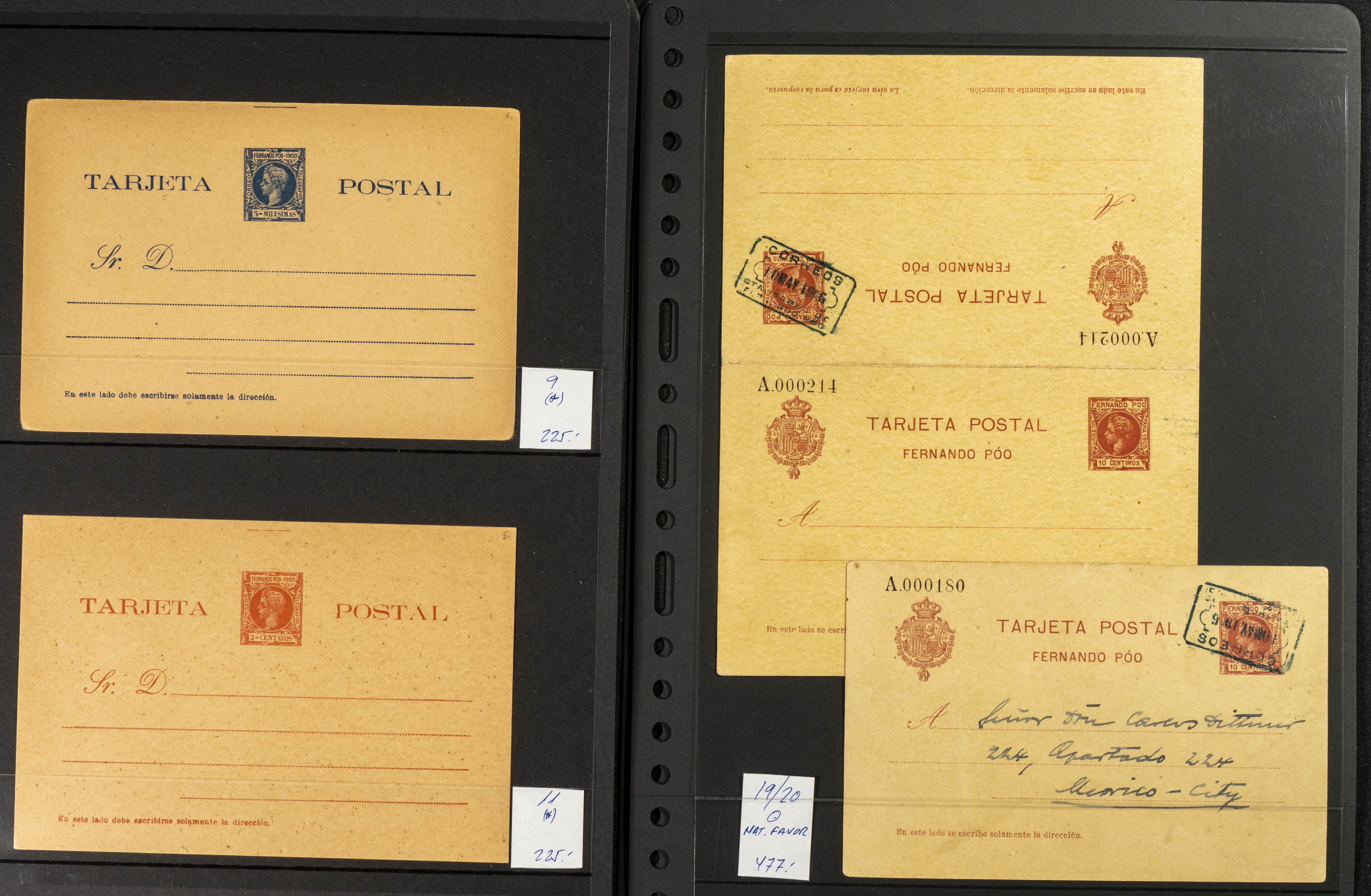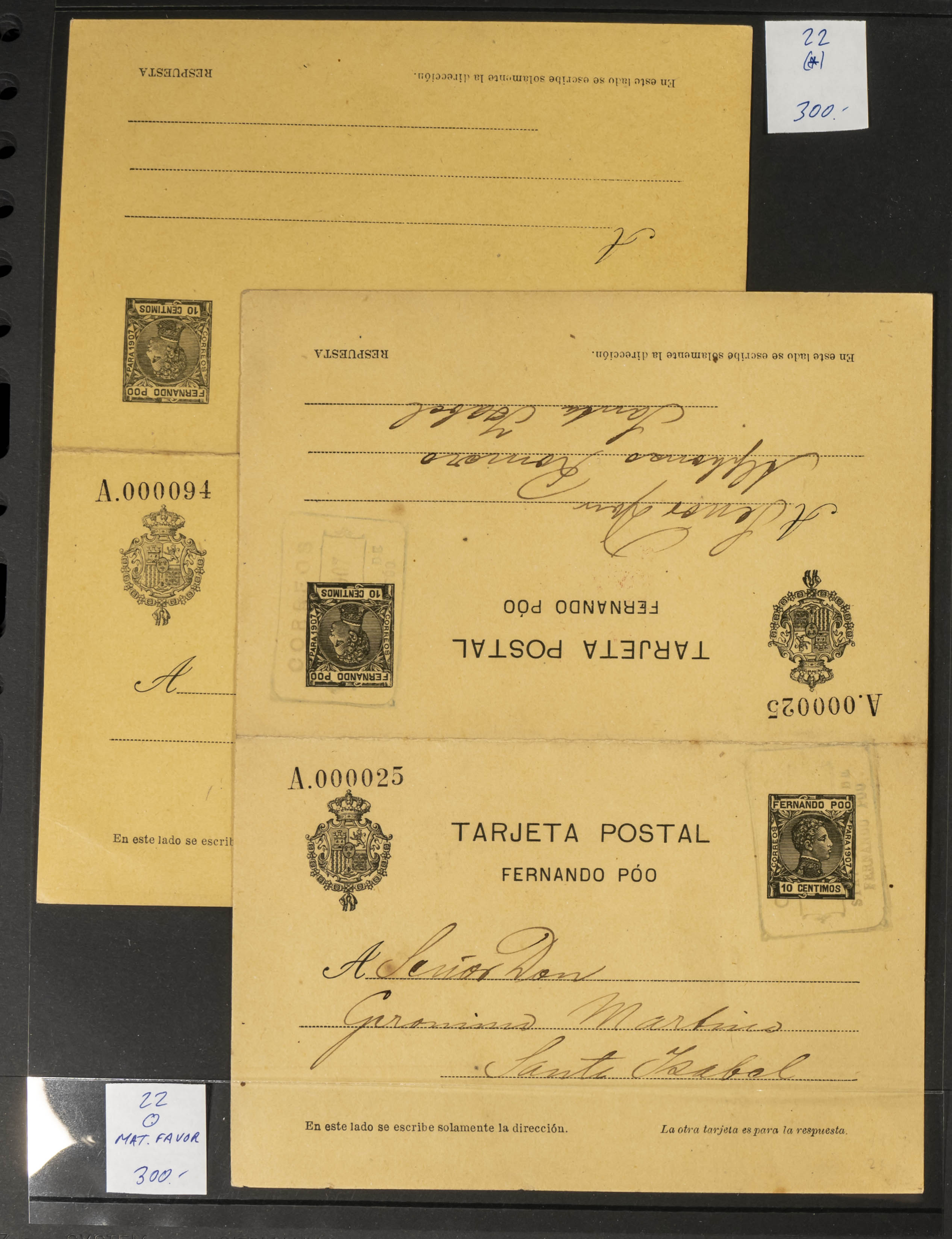 (★)/1899. Interesante conjunto-colección de Tarjetas Entero Postales de Fernando Poo entre 1899 y 1907, en nuevo y usado (la mayoría con matasello de favor), incluye un juego completo de tarjetas de ida y vuelta de 1899 (Edifil 5/8) y la tarjeta de fantasía del 10 cts rojo de Pelón realizada por la Ilustración Filatélica de Barcelona. MAGNIFICO Y RARO CONJUNTO. Edifil 2019: 4.037 Euros