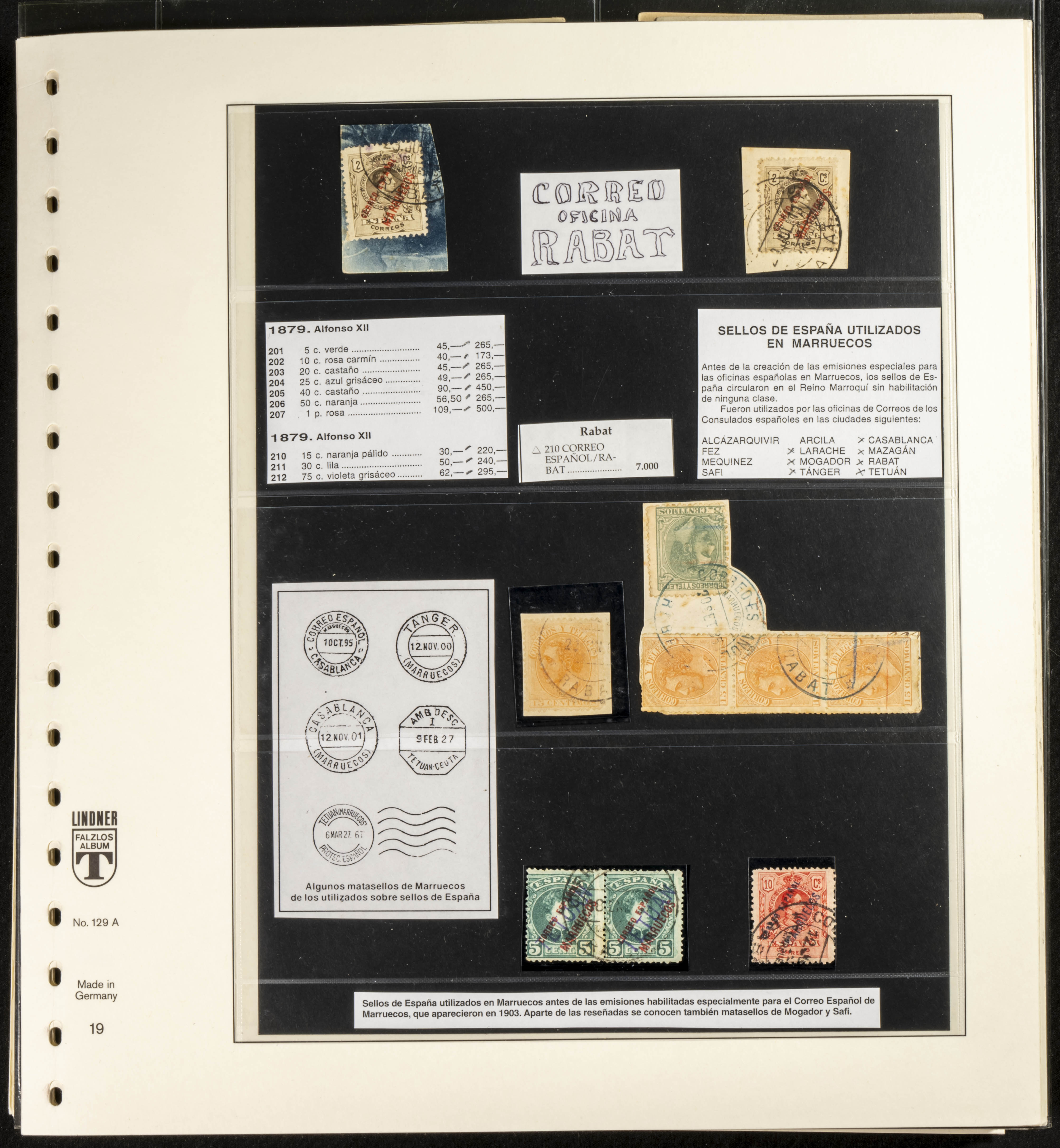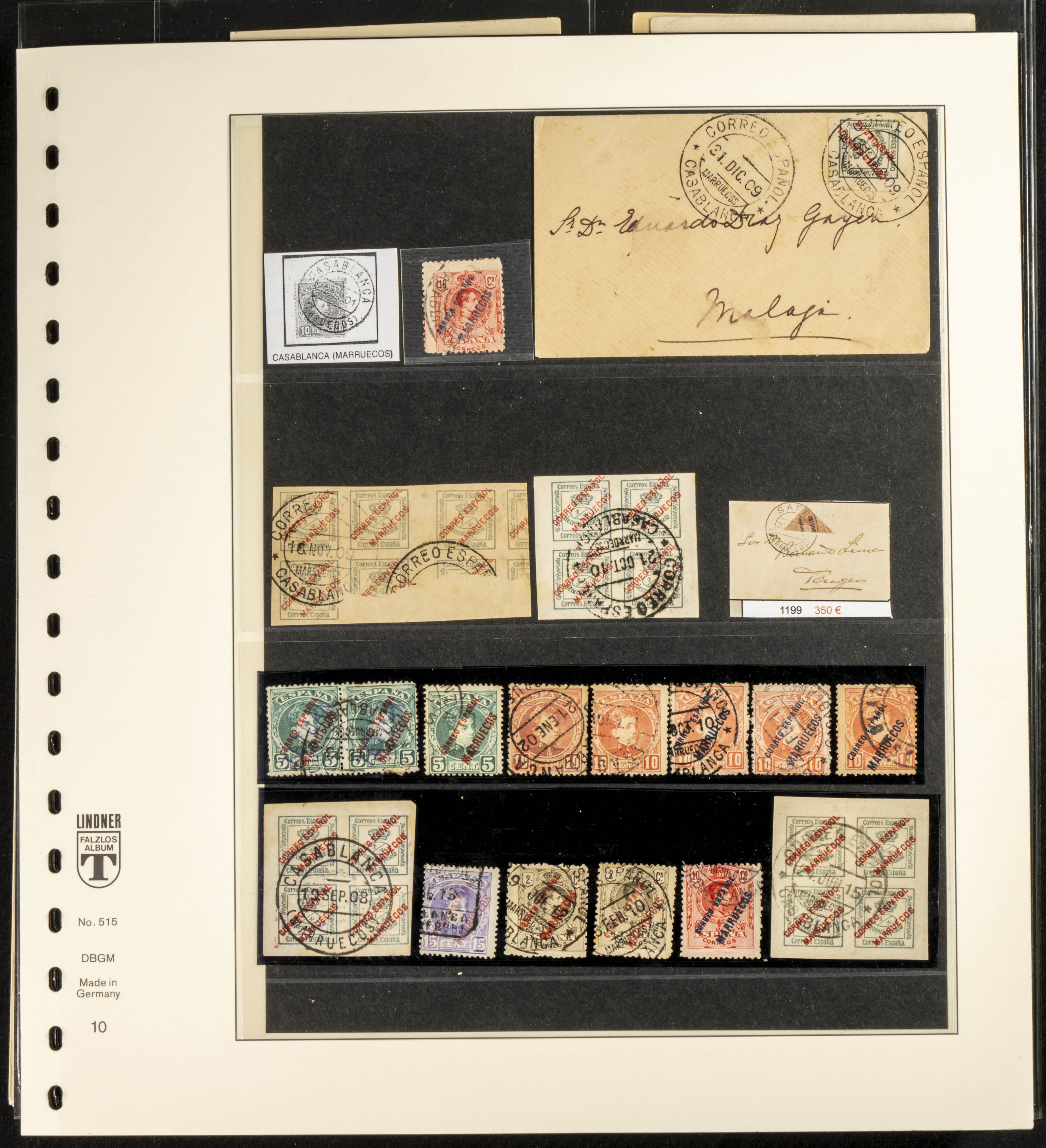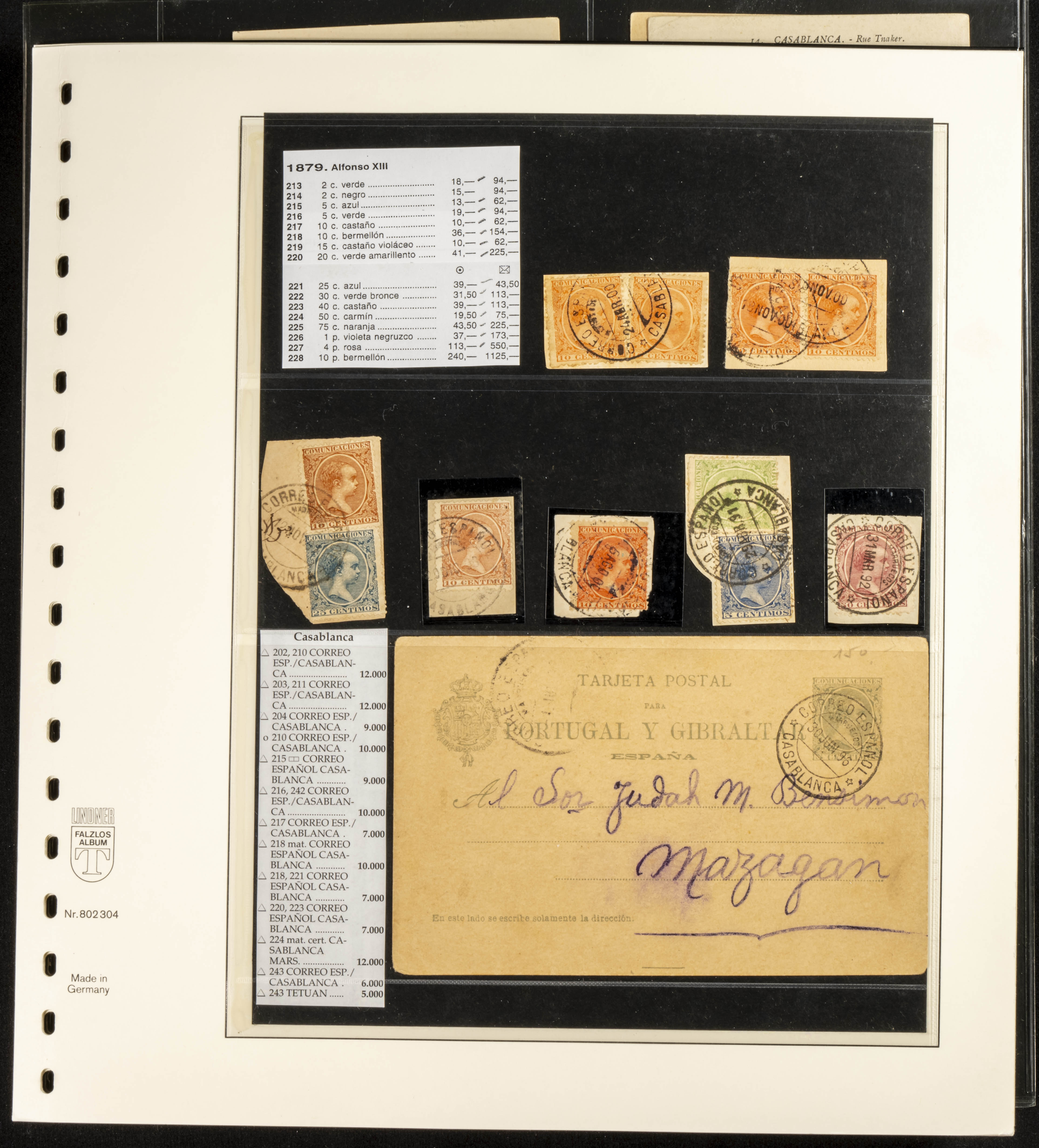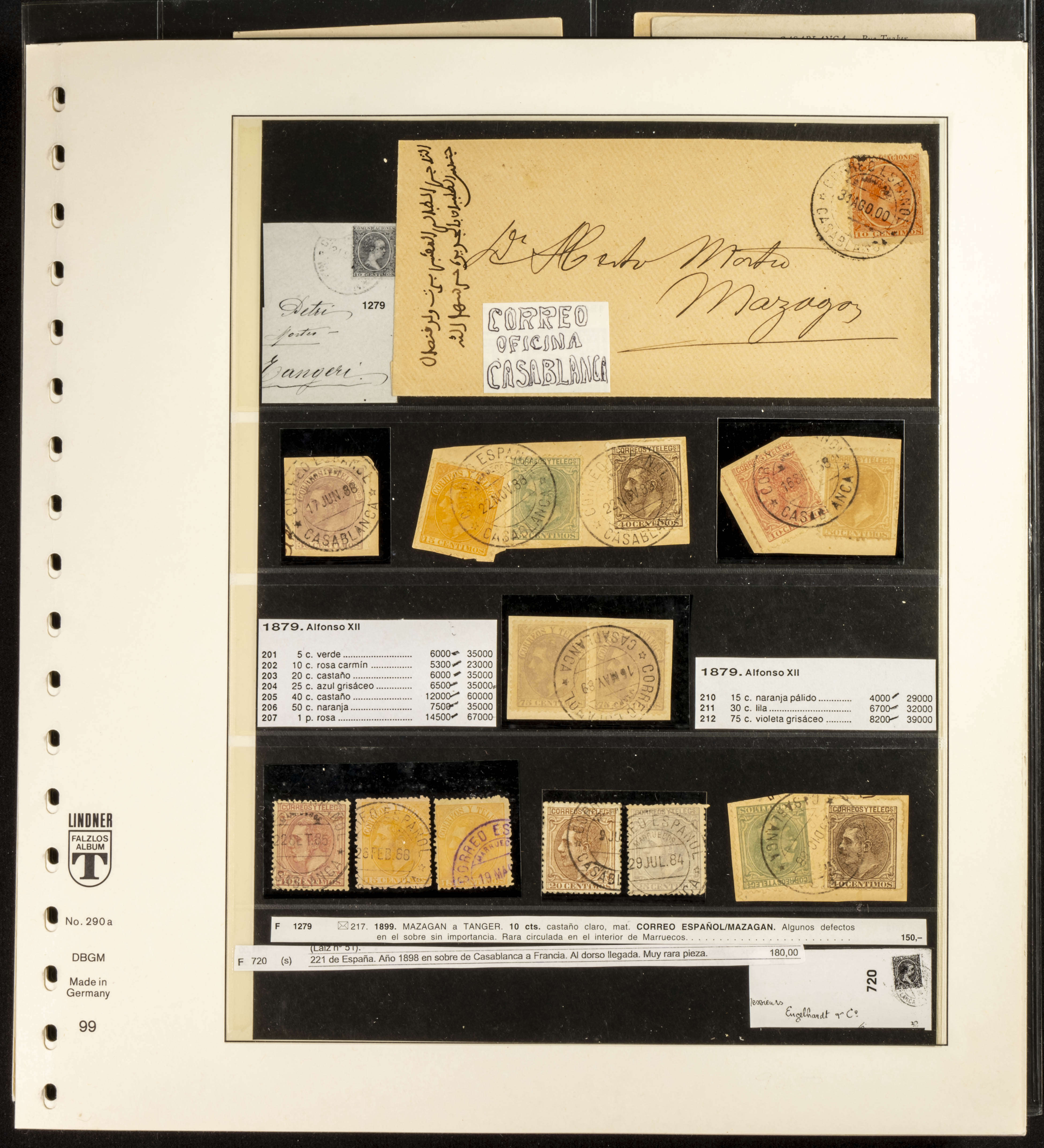 (1884ca). Espectacular colección Historia Postal y cientos de sellos usados de Marruecos entre 1884 y 1956, organizado por orden cronológico y en algún caso por matasellos de poblaciones, destaca una gran representación de las emisiones de Alfonso XII y XIII con matasellos del Correo Español, más de doscientas sesenta cartas circuladas (algún Sobre de Primer Día y Enteros Postales), más de cien tarjetas postales, la mayoría circuladas, cientos de fragmentos, primeras emisiones de Alfonso XIII con sobrecarga TETUAN, un gran número de sellos con matasellos especiales o de poblaciones pequeñas, algunos muy raros, etc. MAGNIFICO Y MUY ESPECIALIZADO CONJUNTO DE SOBRESALIENTE INTERES.