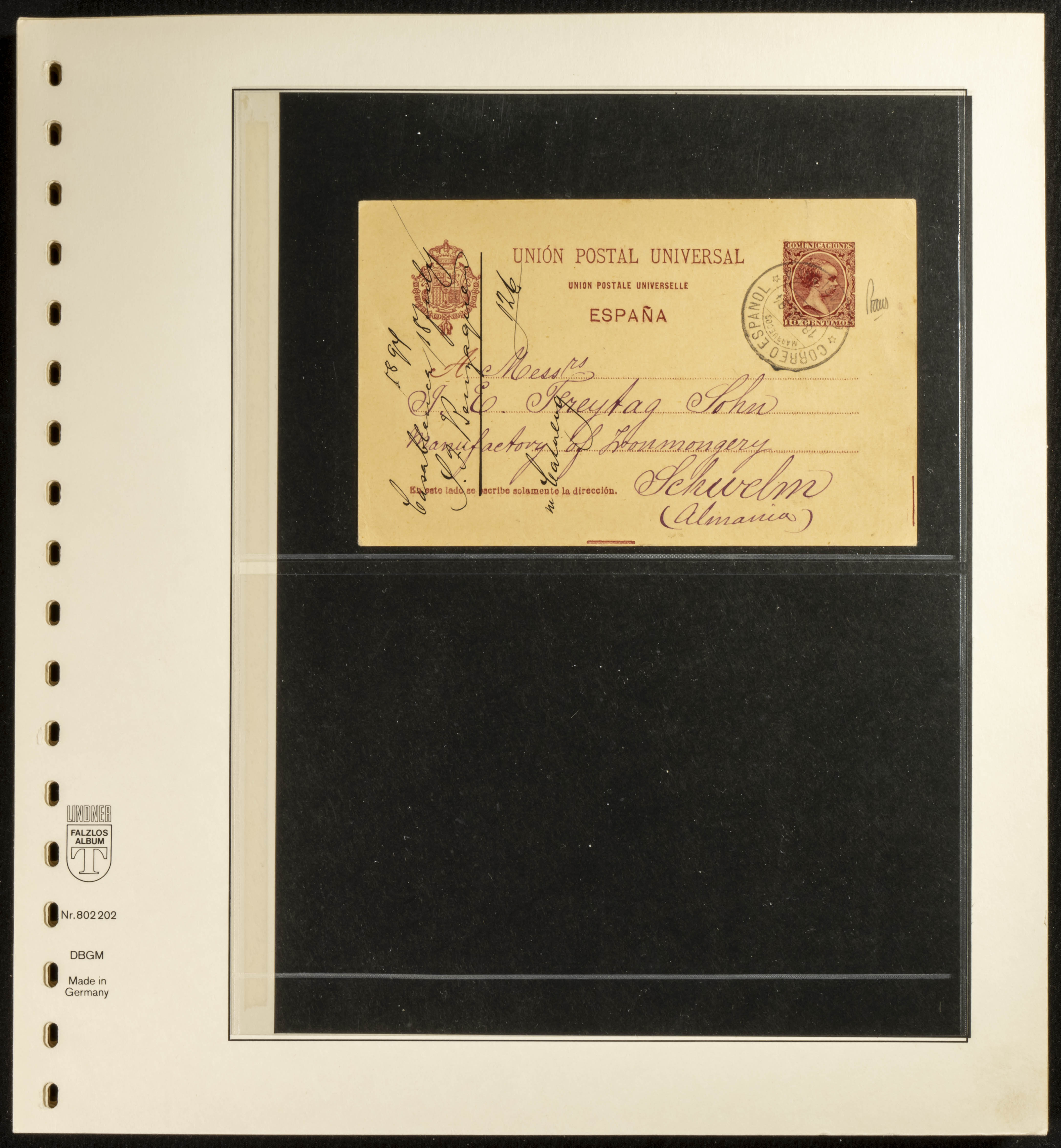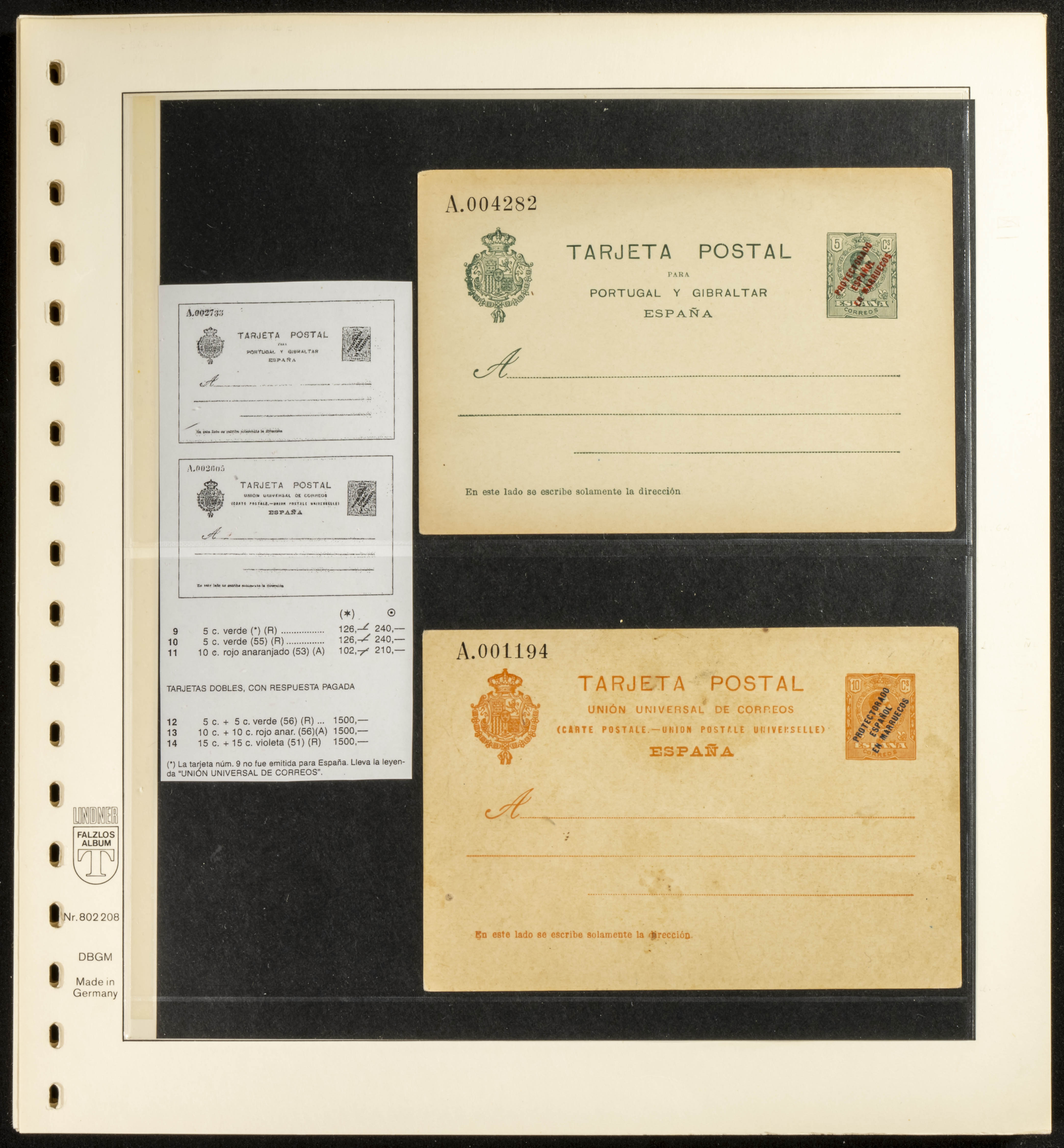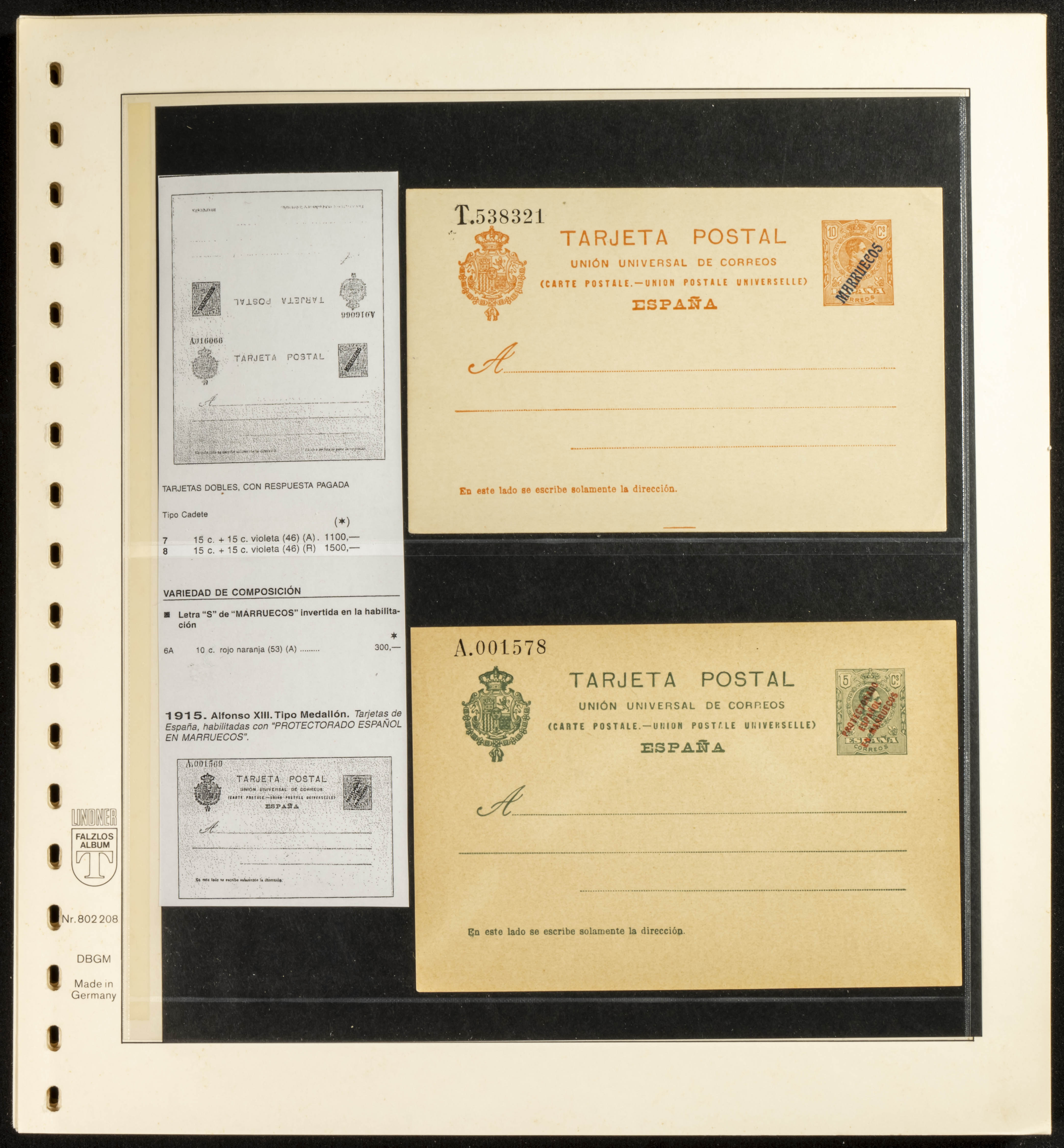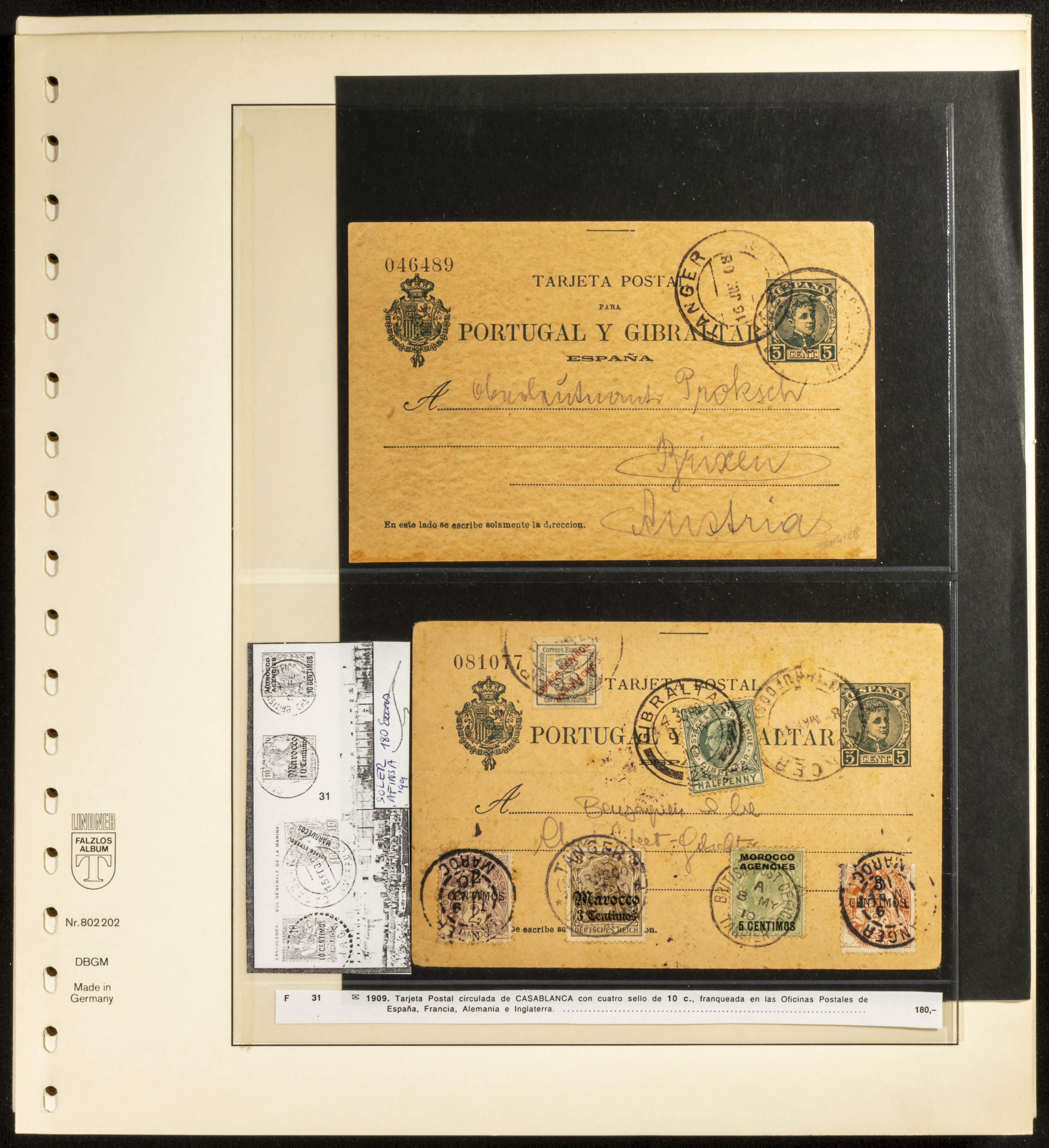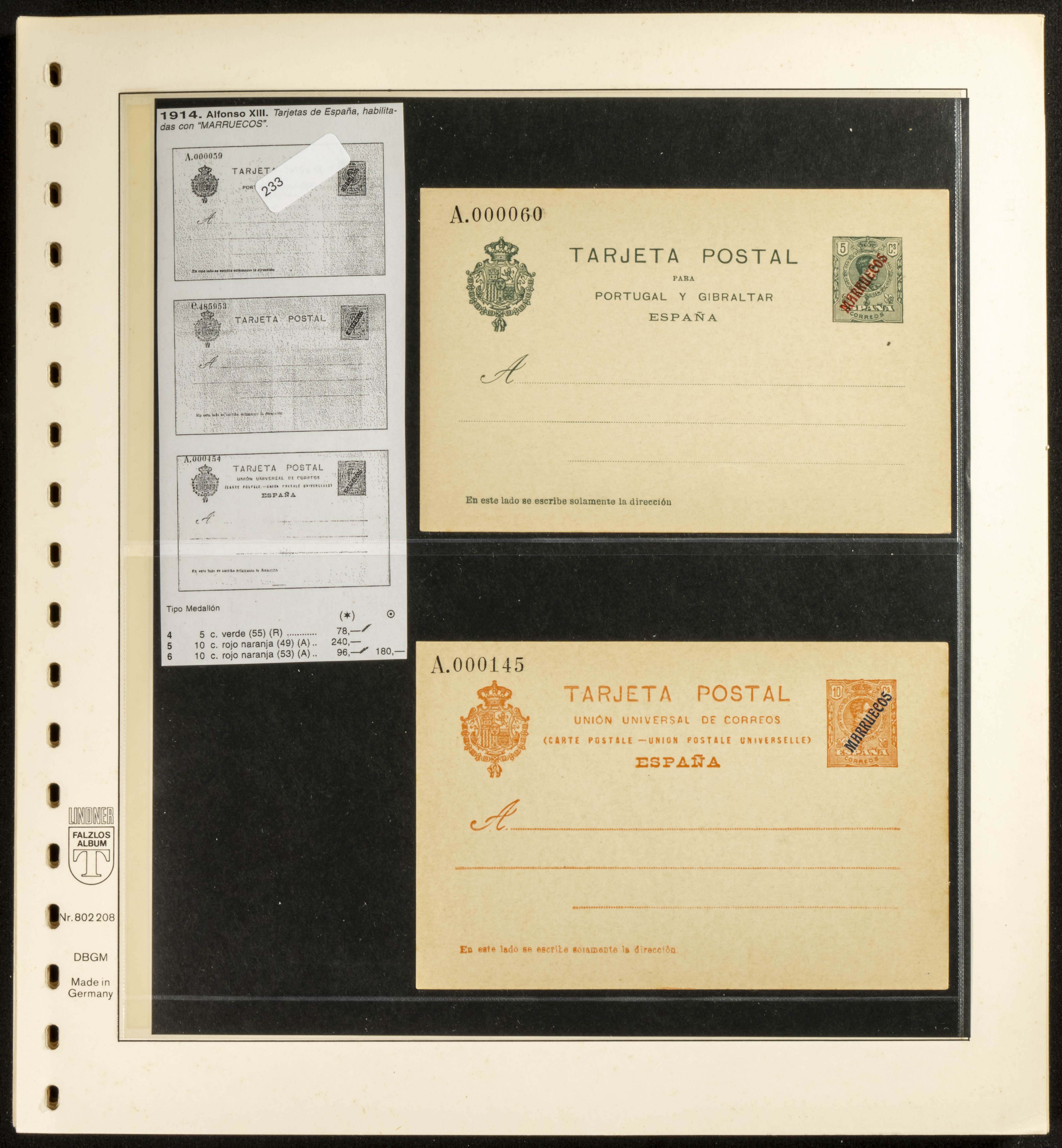 (★)/(1890ca). Interesantísima colección de Tarjetas Entero Postales de Marruecos entre 1890 y 1950, nuevas y circuladas e incluyendo cinco Tarjetas Entero Postales de España circuladas por el Correo Español de Marruecos, algunas tarjetas con sobrecarga MUESTRA o numeración ceros, así como ocho tarjetas circuladas de 1942 y 1944 (Paisajes y Pro-Mutilados). A EXAMINAR.