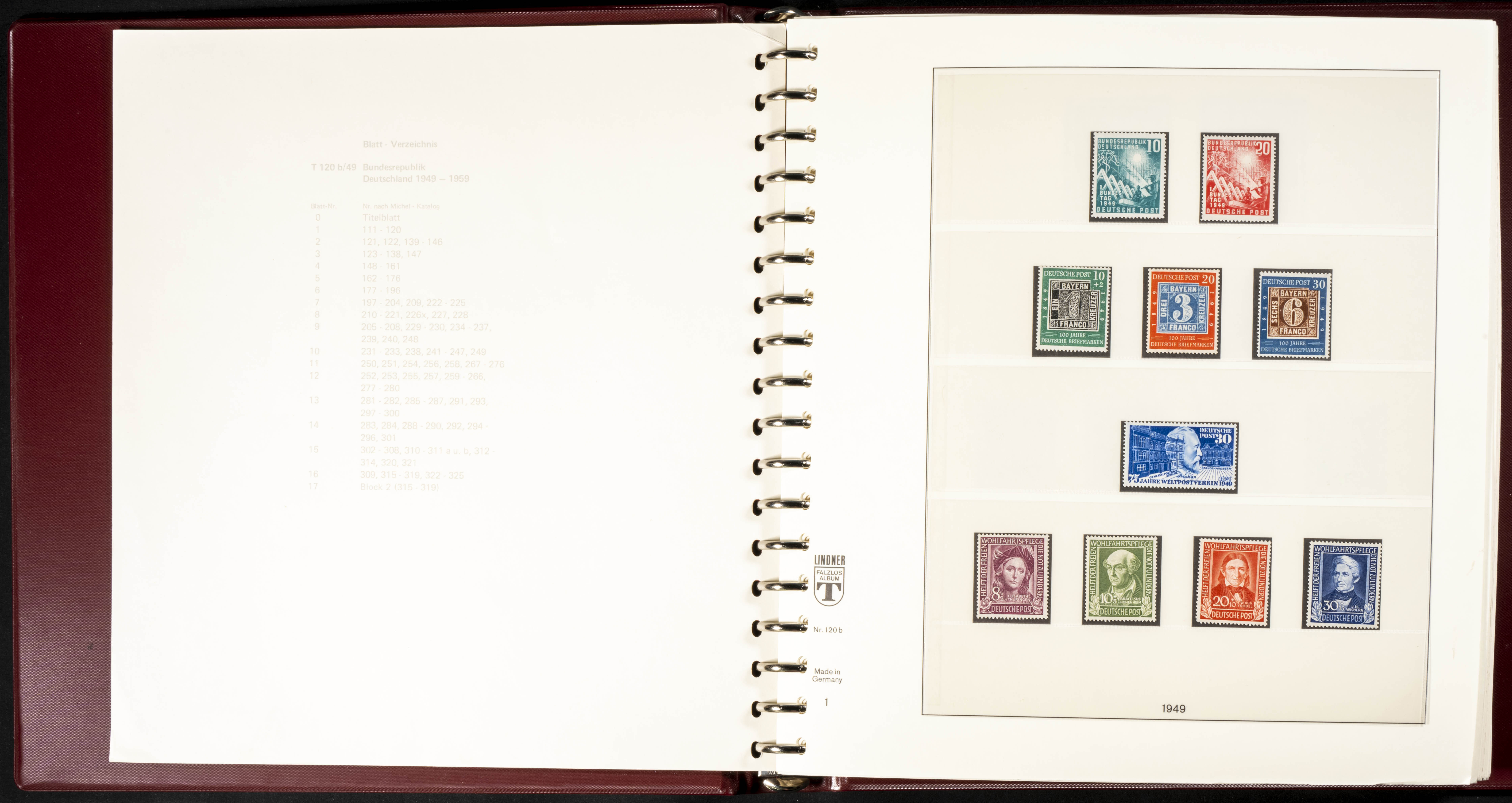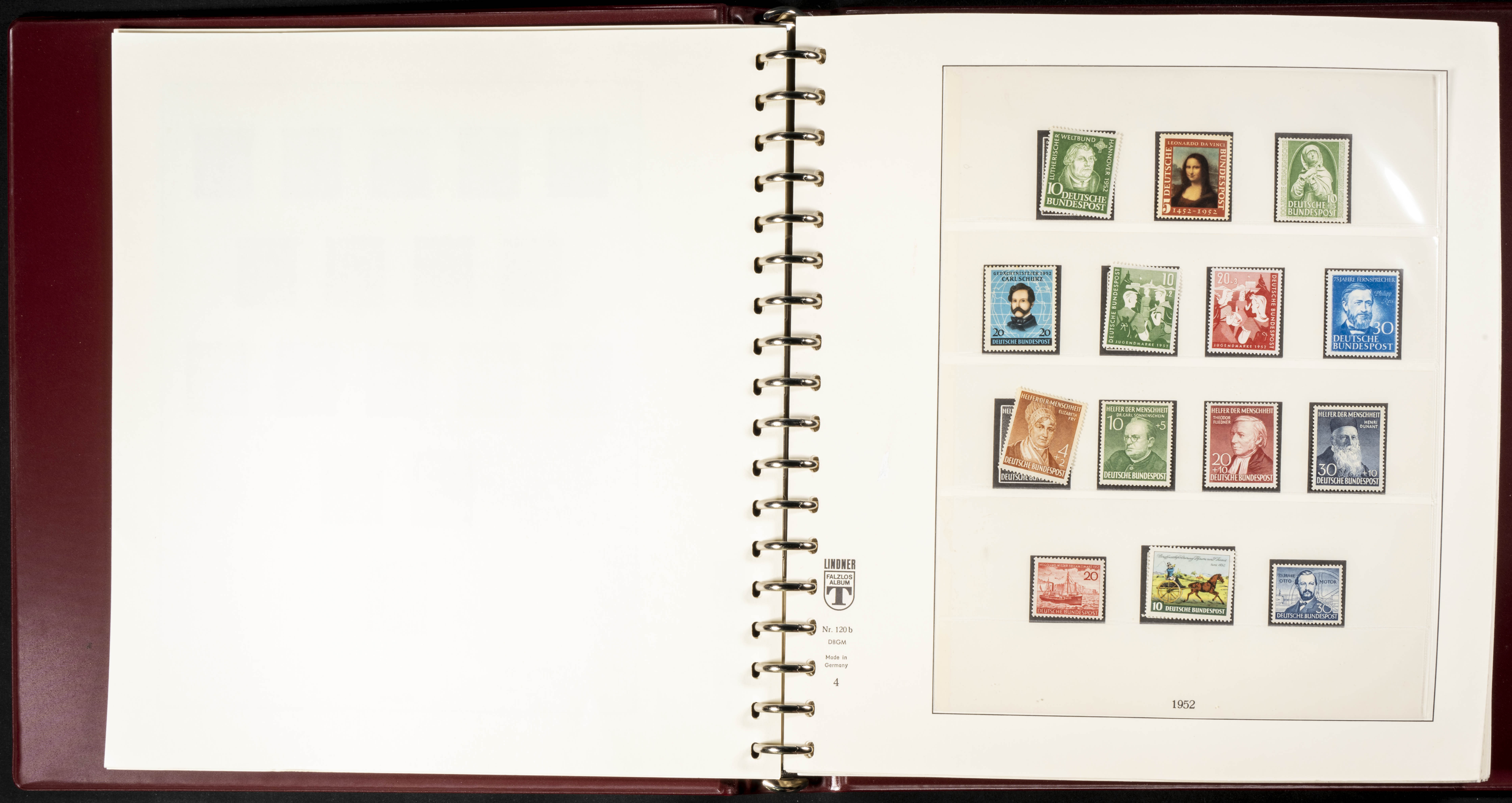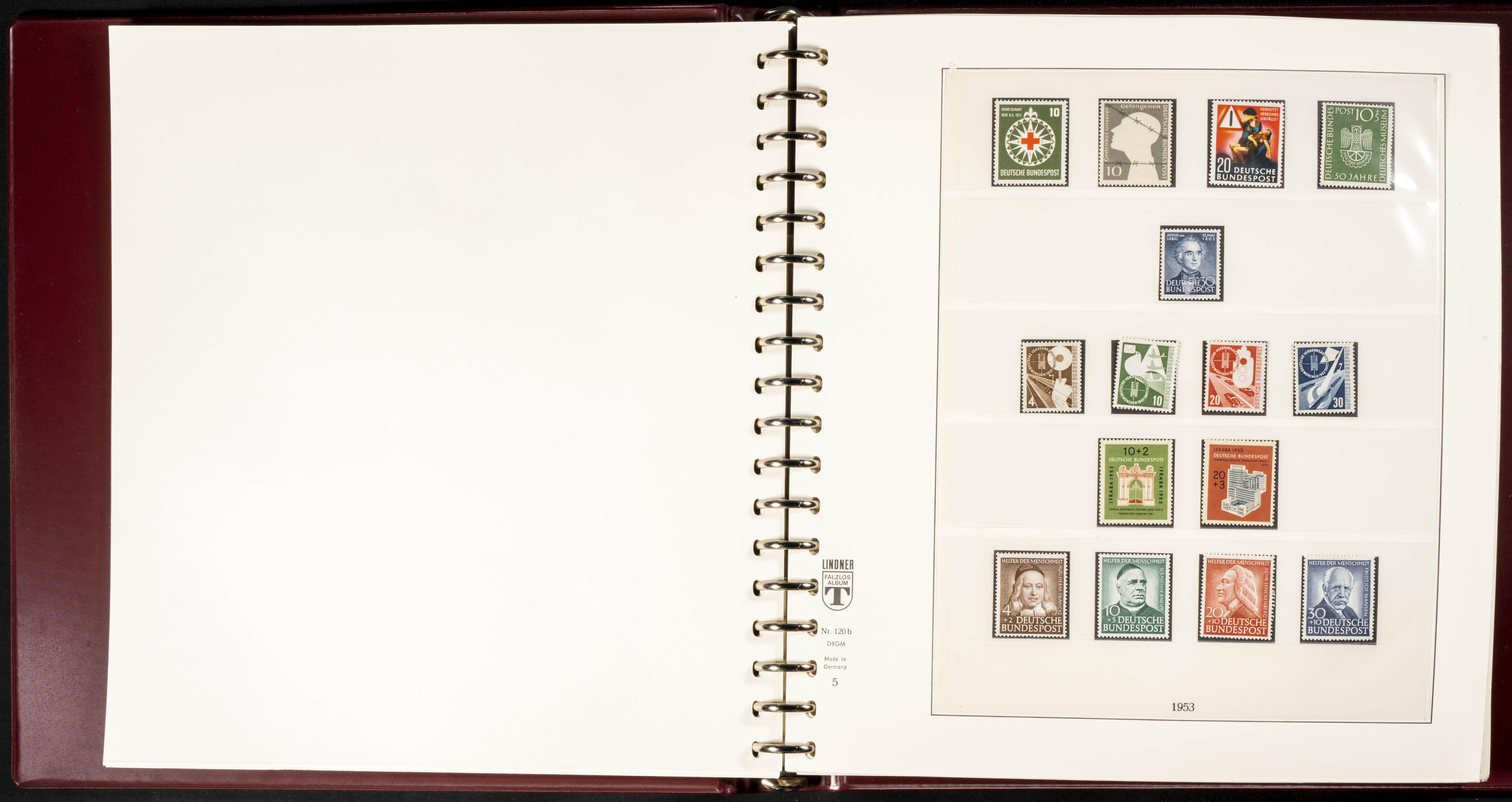 ★★/★(1949ca). Interesante y prácticamente completa colección de Alemania Occidental (RFA) entre 1949 y 2003, en nuevo y con todas las series del principio (Cornetas, Heuss, etc), la mayoría con fijasellos hasta 1960, incluye numerosos carnets, parejas y bloques procedentes de los mismos y minihojas (montado en álbumes Lindner). ALTISIMO VALOR DE CATALOGO. IMPRESCINDIBLE EXAMINAR.