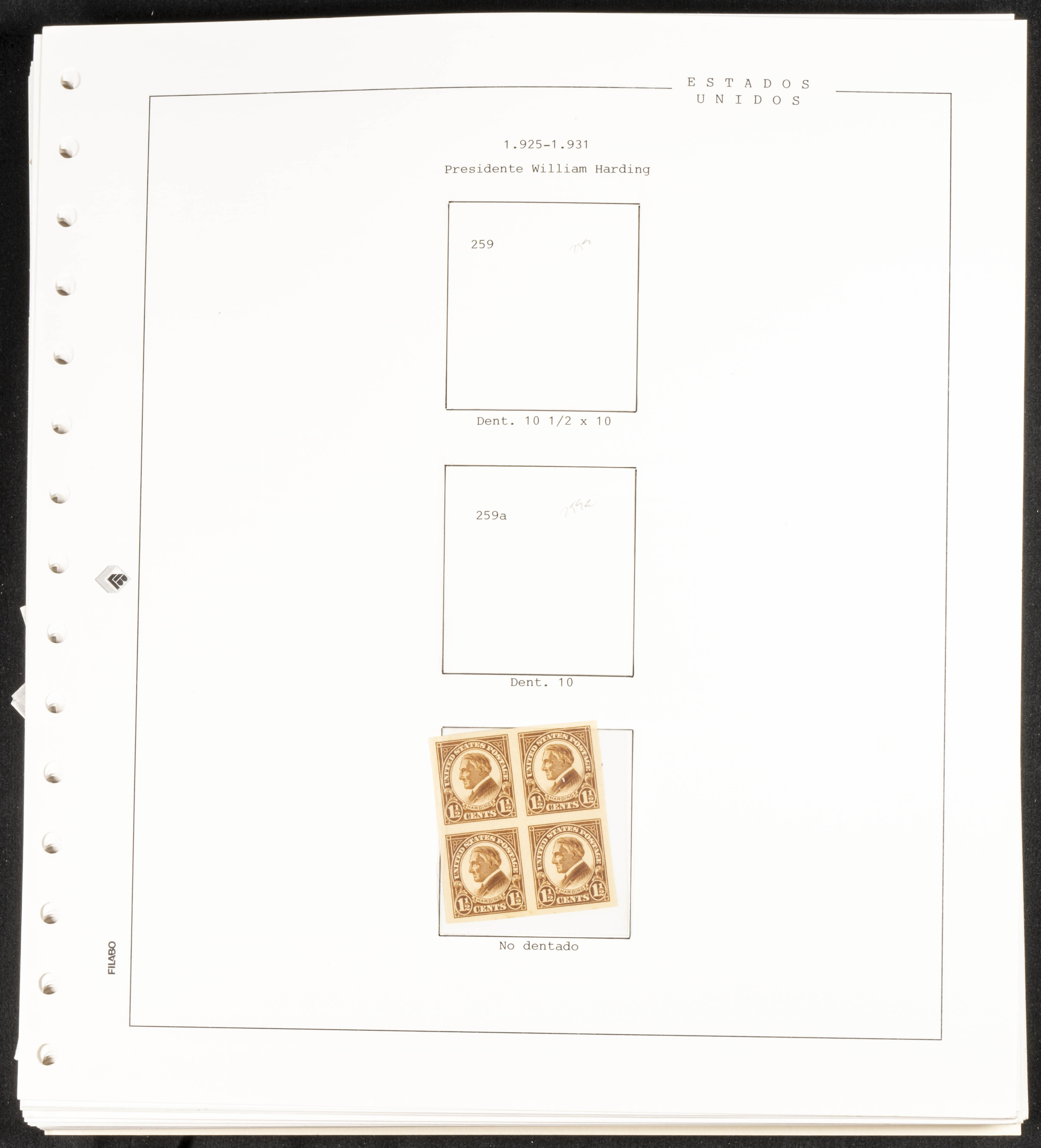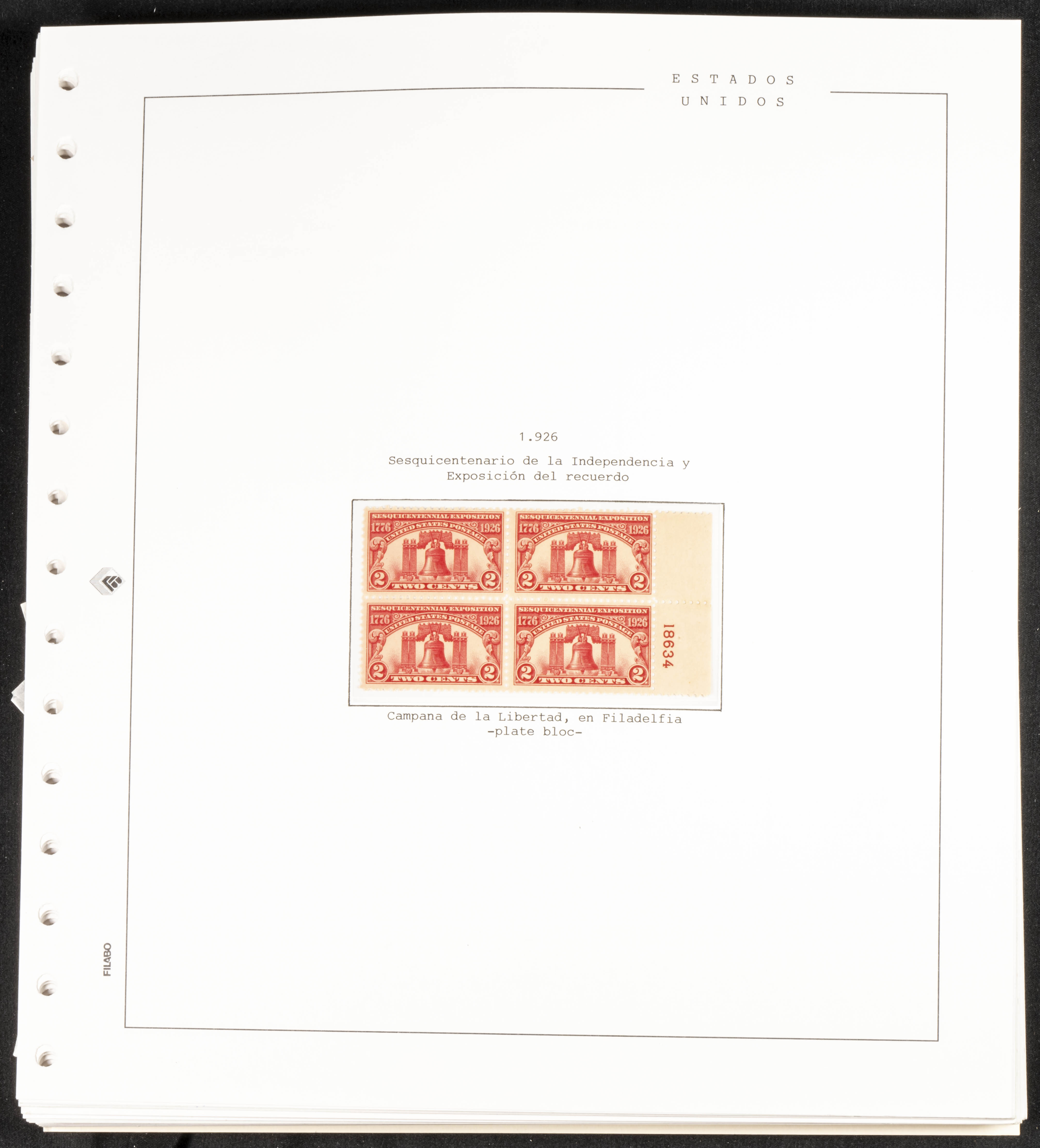 ★★(1940ca). Interesante y muy completa colección de Estados Unidos en bloque de cuatro entre 1926 y 1997, en nuevo e incluyendo minihojas y la mayoría de carnets emitidos, además de variedades y bloques con números de plancha, incluye los dos 5 dólares de Presidentes de 1938 y 1955 con número de plancha. ALTISIMO VALOR DE CATALOGO. A EXAMINAR.