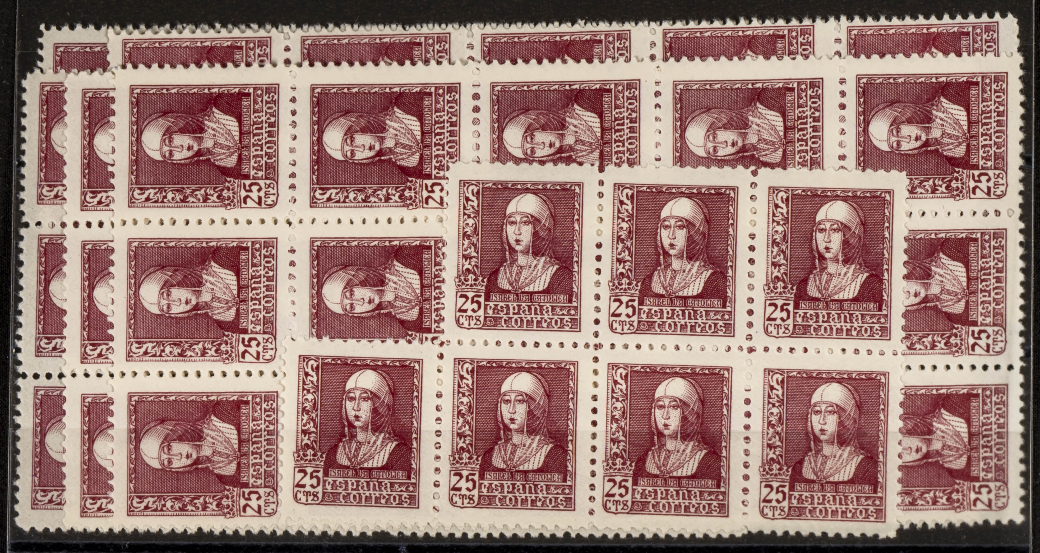 ★★ 856(69). 1938. 25 cts carmín, sesenta y nueve sellos. ISABEL (buena calidad en general). A EXAMINAR. Edifil 2025: 1.380 Euros
