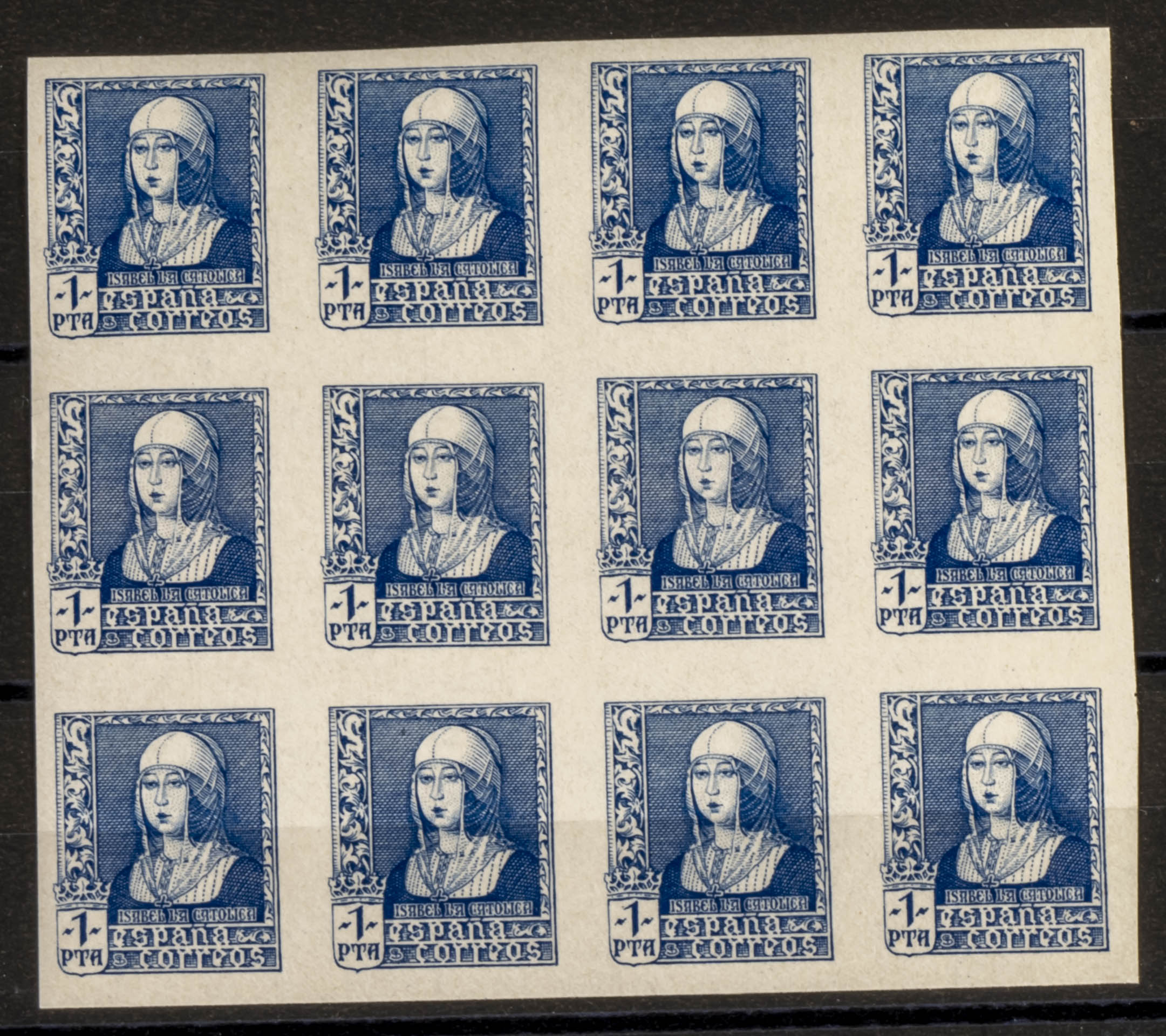 ★★ 860s(12). 1938. 1 pts azul SIN DENTAR, bloque de doce sellos. ISABEL LA CATOLICA (buena conservación). MAGNIFICO. Edifil 2025: 1.440 Euros