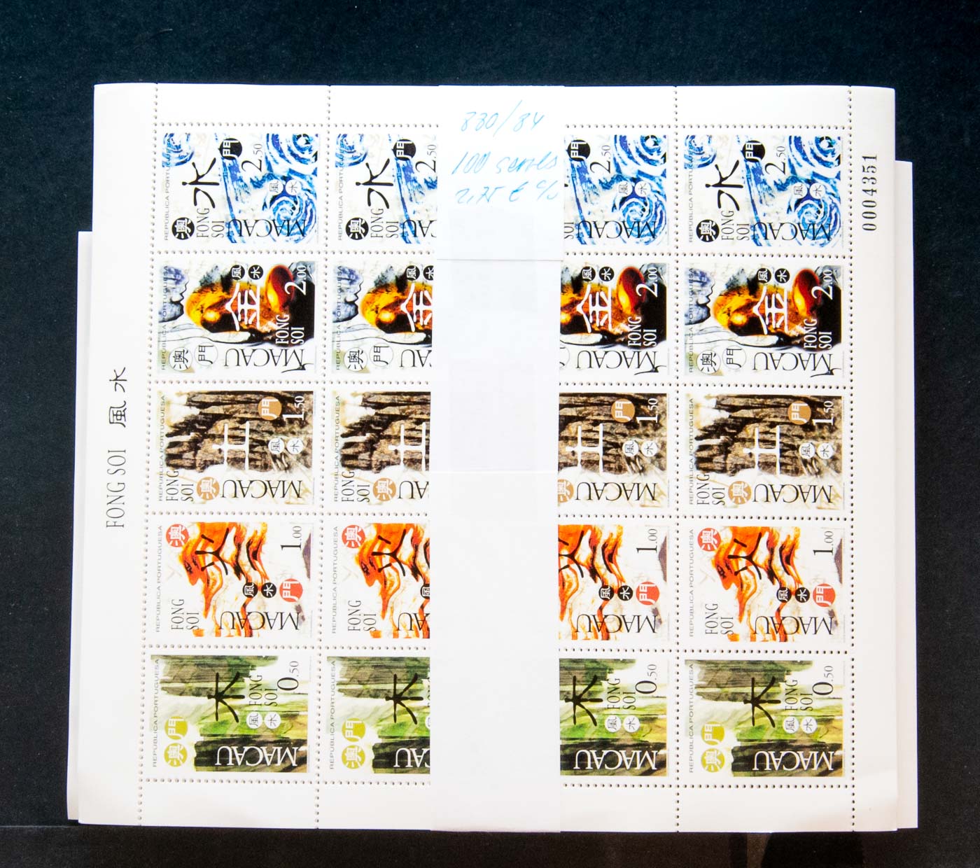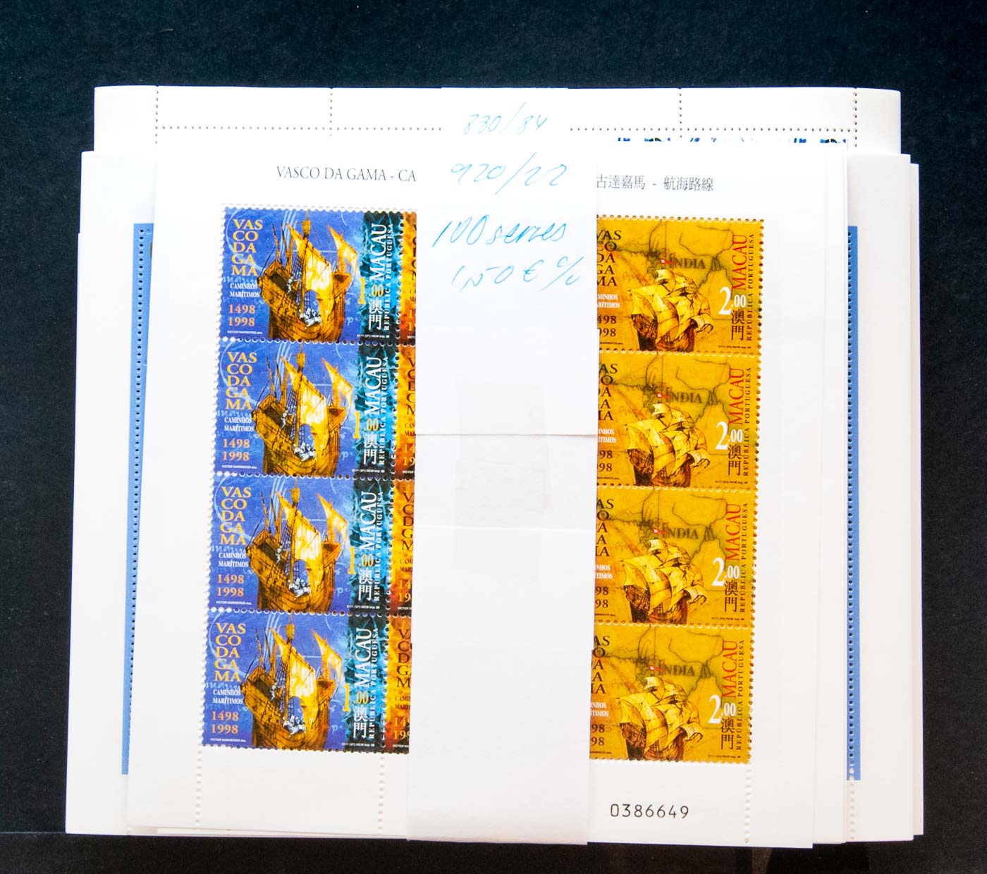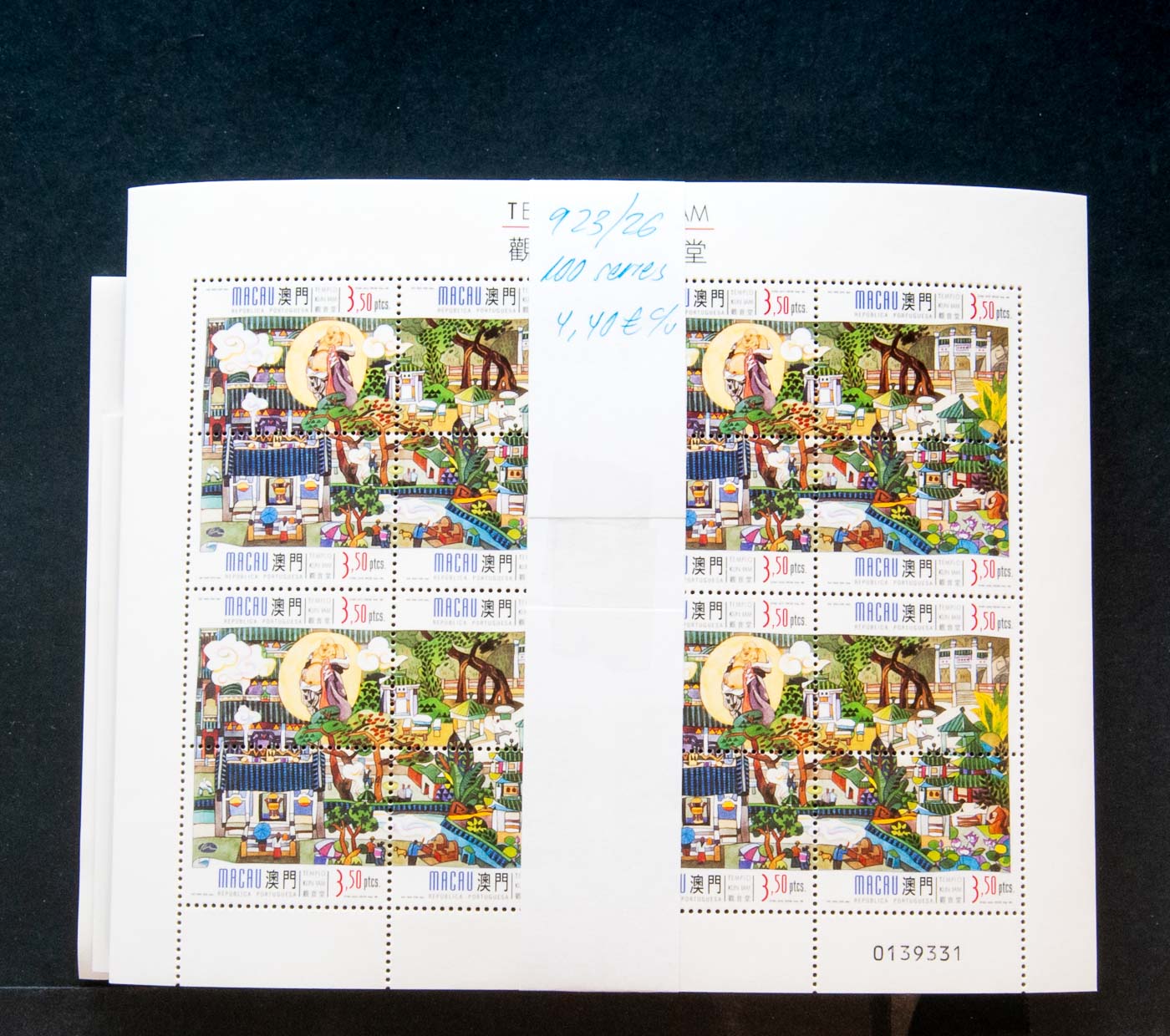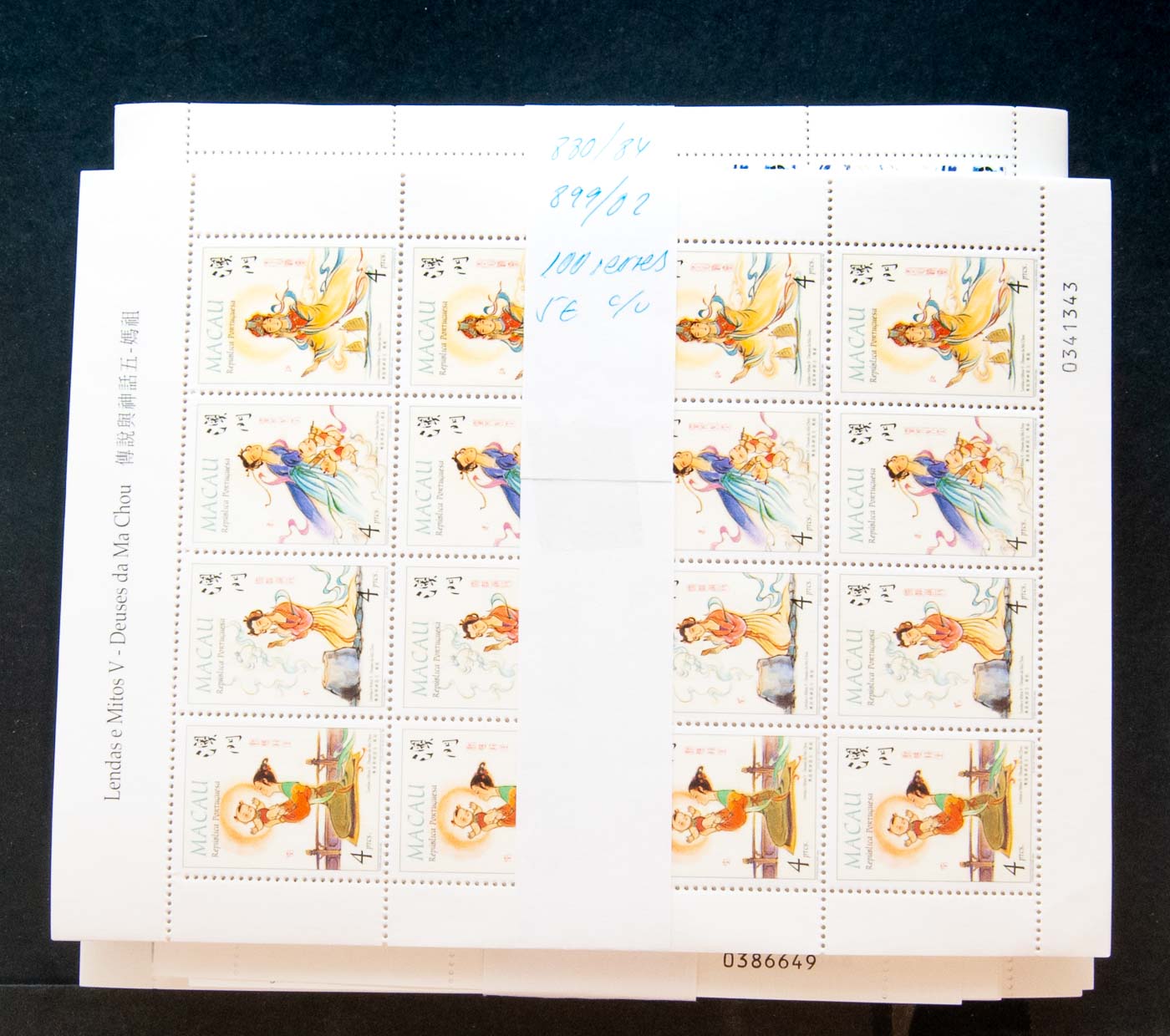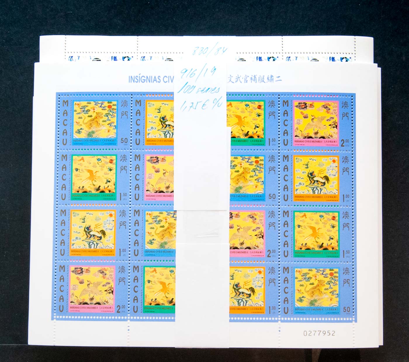 ★★(1997ca). Interesante conjunto de series completas y hojas bloque de Macao de 1997 a 1999, en nuevo con repeticiones entre cincuenta y doscientas unidades de cada (se adjunta listado: 56270 Patacas, equivalente a +7000 Euros). ALTISIMO VALOR FACIAL. A EXAMINAR. Yvert 2020: +11.000 Euros