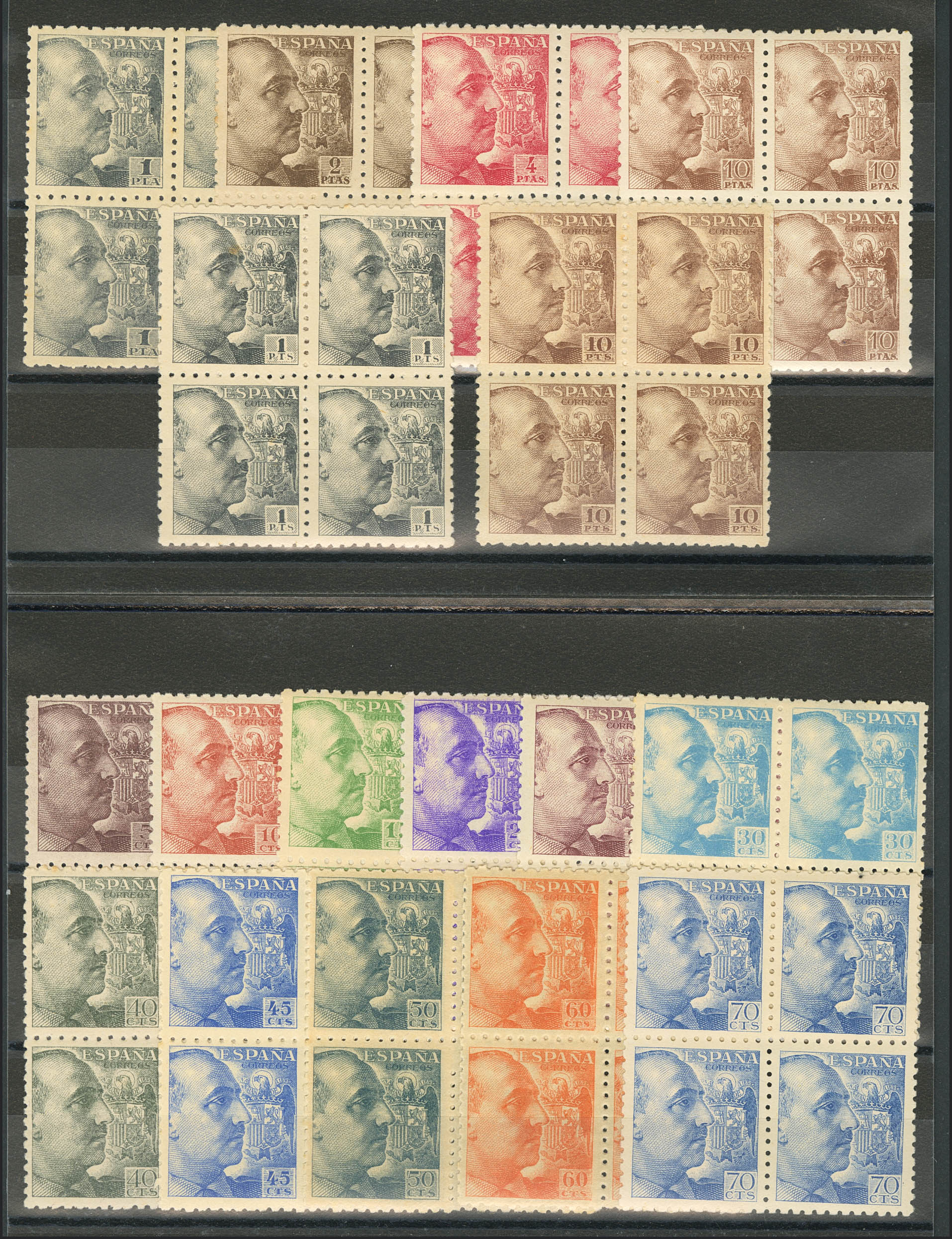★★ 919/35(4). 1940. Serie completa, bloque de cuatro (un sello de 1 pts manchita del tiempo). MAGNIFICA Y RARA. Edifil 2025: +1.680 Euros