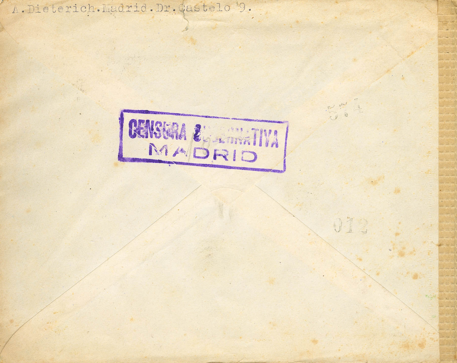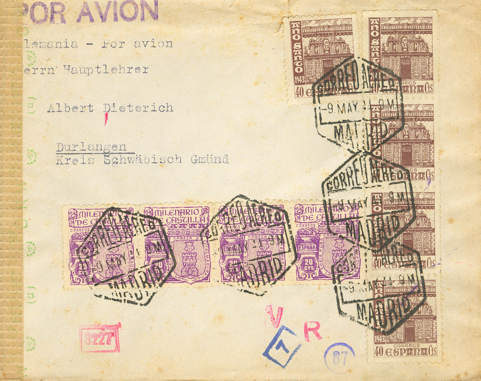 968(5), 974(4). 1944. 20 cts violeta, tira de cuatro y 40 cts castaño, tira de cuatro y un sello. Correo Aéreo de MADRID a DURLANGEN (ALEMANIA). En el frente diversas marcas de control del correo alemán. MAGNIFICA.
