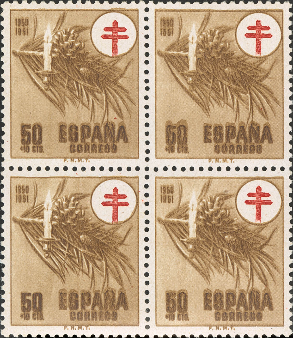 ★★ 1086ed(4). 1950. 50 cts castaño, bloque de cuatro. IMPRESION PATINADA. MAGNIFICO. Edifil 2021: +124 Euros