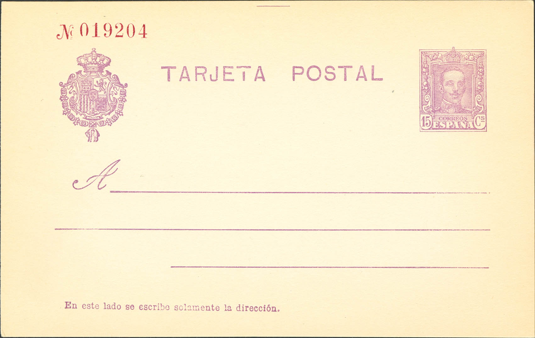 (★) EP57NR. 1925. 15 cts violeta sobre Tarjeta Entero Postal. NUMERACION EN ROJO. MAGNIFICA Y MUY RARA. Edifil 2017: 385 Euros