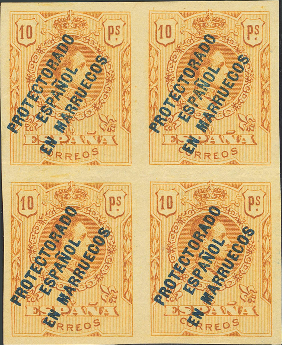★★ 55s(4). 1915. 10 pts naranja, bloque de cuatro (pliegue central que no toca los sellos). SIN DENTAR. MAGNIFICO. Edifil 2018: 440 Euros