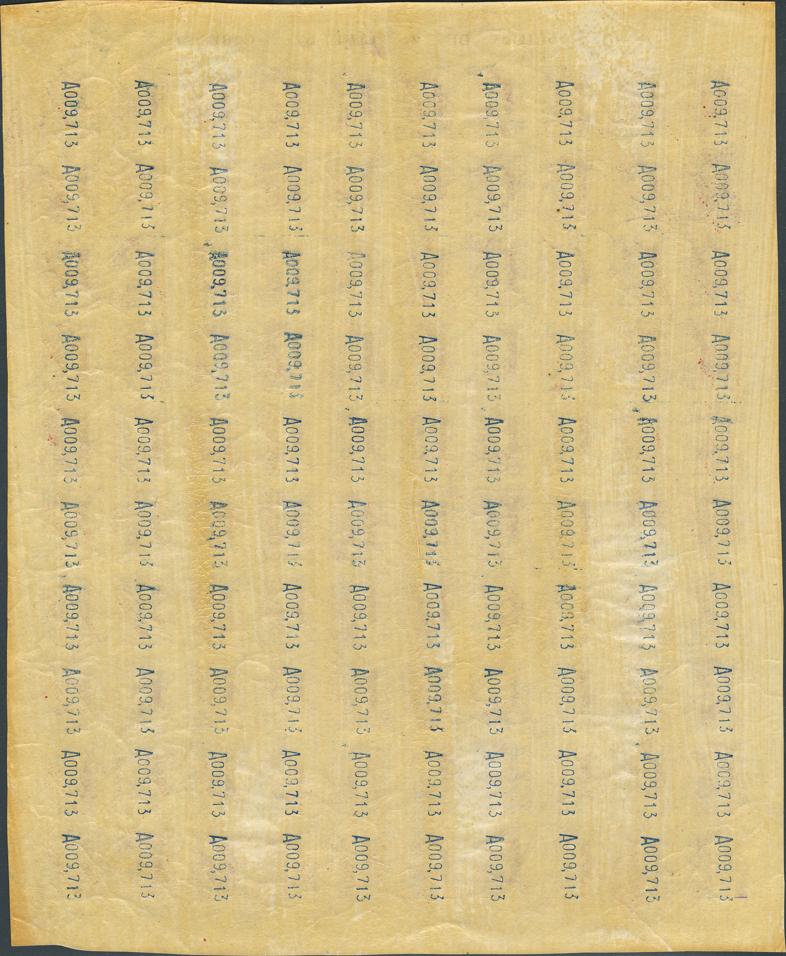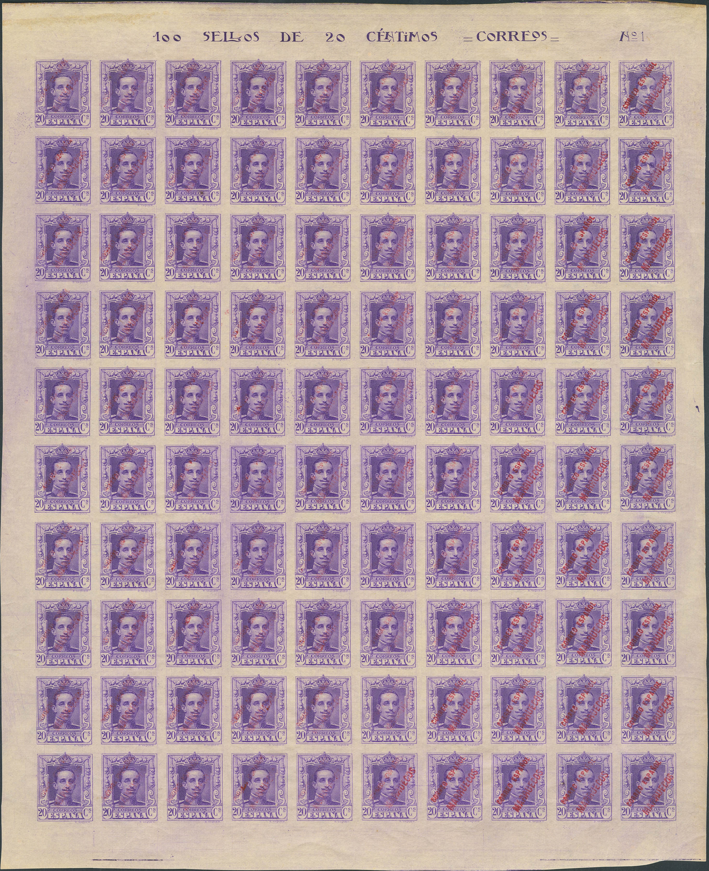 ★★ 21s(100). 1923. 20 cts violeta, pliego completo de cien sellos. SIN DENTAR y SOBRECARGA ESTAMPACION DEBIL, en algunos casos se ven algunos restos de tinta. MAGNIFICO Y RARISIMO. Edifil 2025: +++5.100 Euros