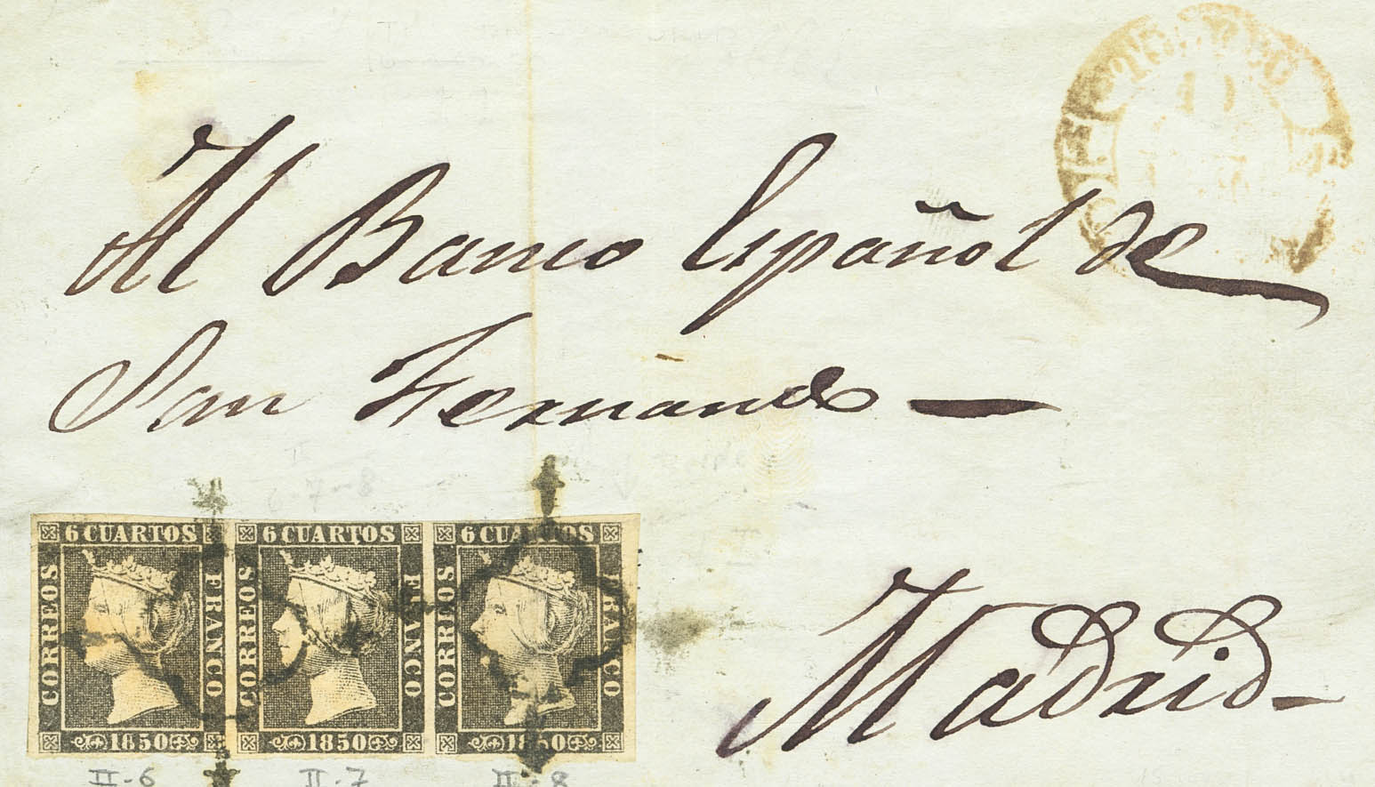 1A(3). 1850. 6 cuartos negro. TOLEDO a MADRID. MAGNIFICO Y RARO TRIPLE PORTE.