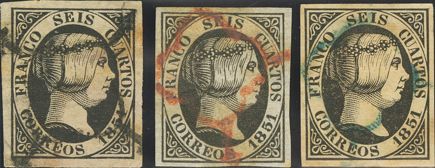 6(3). 1851. Conjunto de tres sellos del 6 cuartos negro inutilizados con el matasello ARAÑA, en negro, en azul y en rojo. MAGNIFICOS.