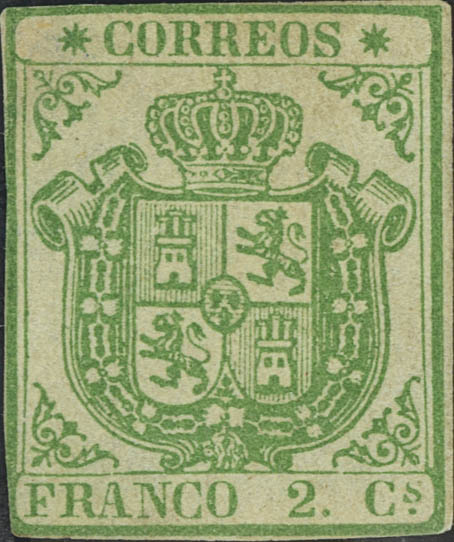 (★) 32A. 1854. 2 cuartos verde (esquina superior izquierda reparada). PAPEL AZULADO. MAGNIFICO Y RARISIMO. Cert. CEM.