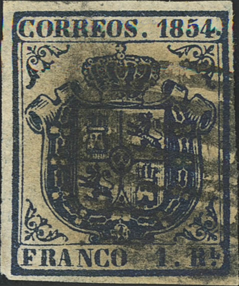 34F. 1854. 1 real azul. FALSO SPERATI (Tipo C), sin firma de Jean Sperati y sin marca de la B.P.A. MAGNIFICO.