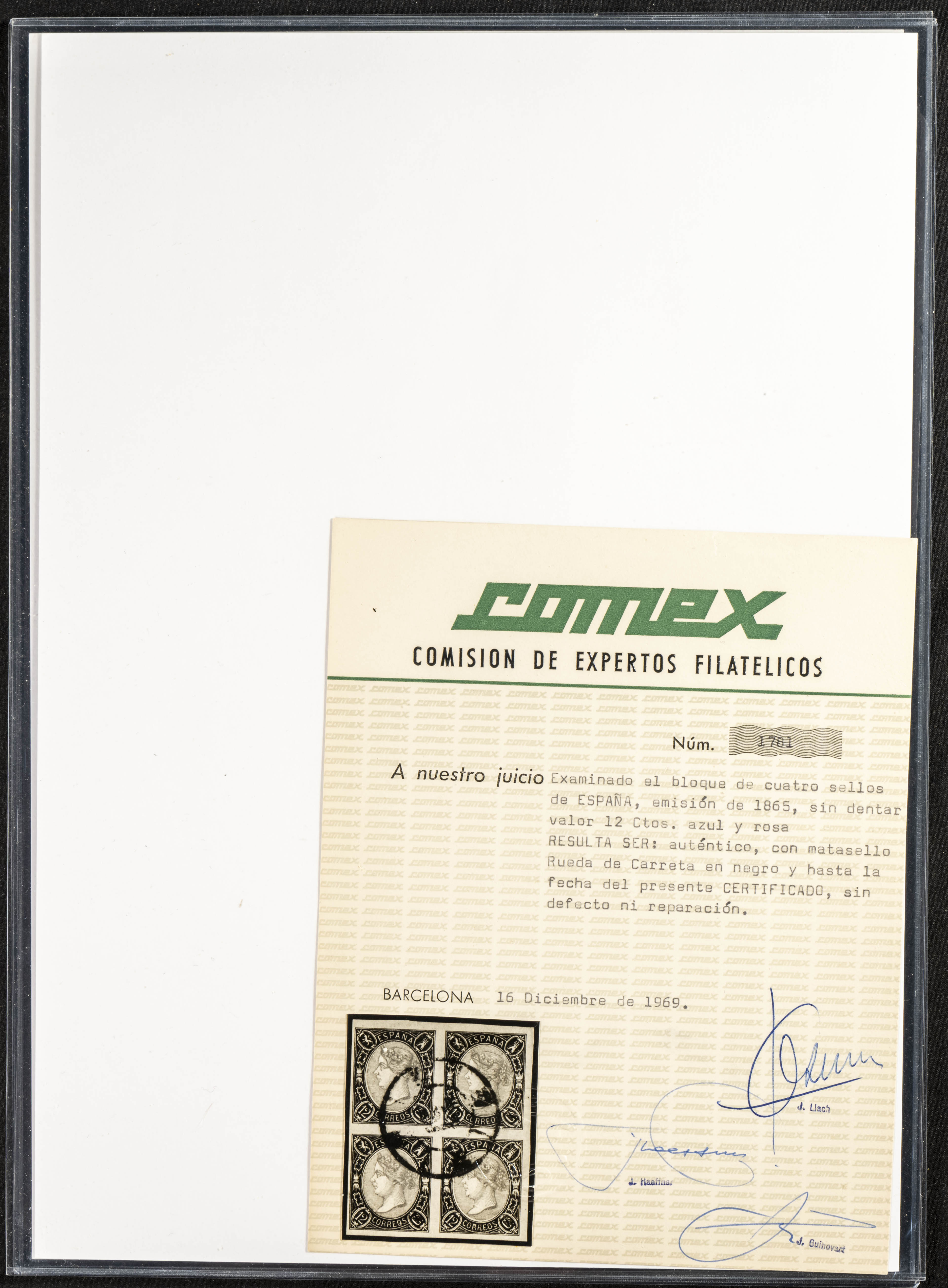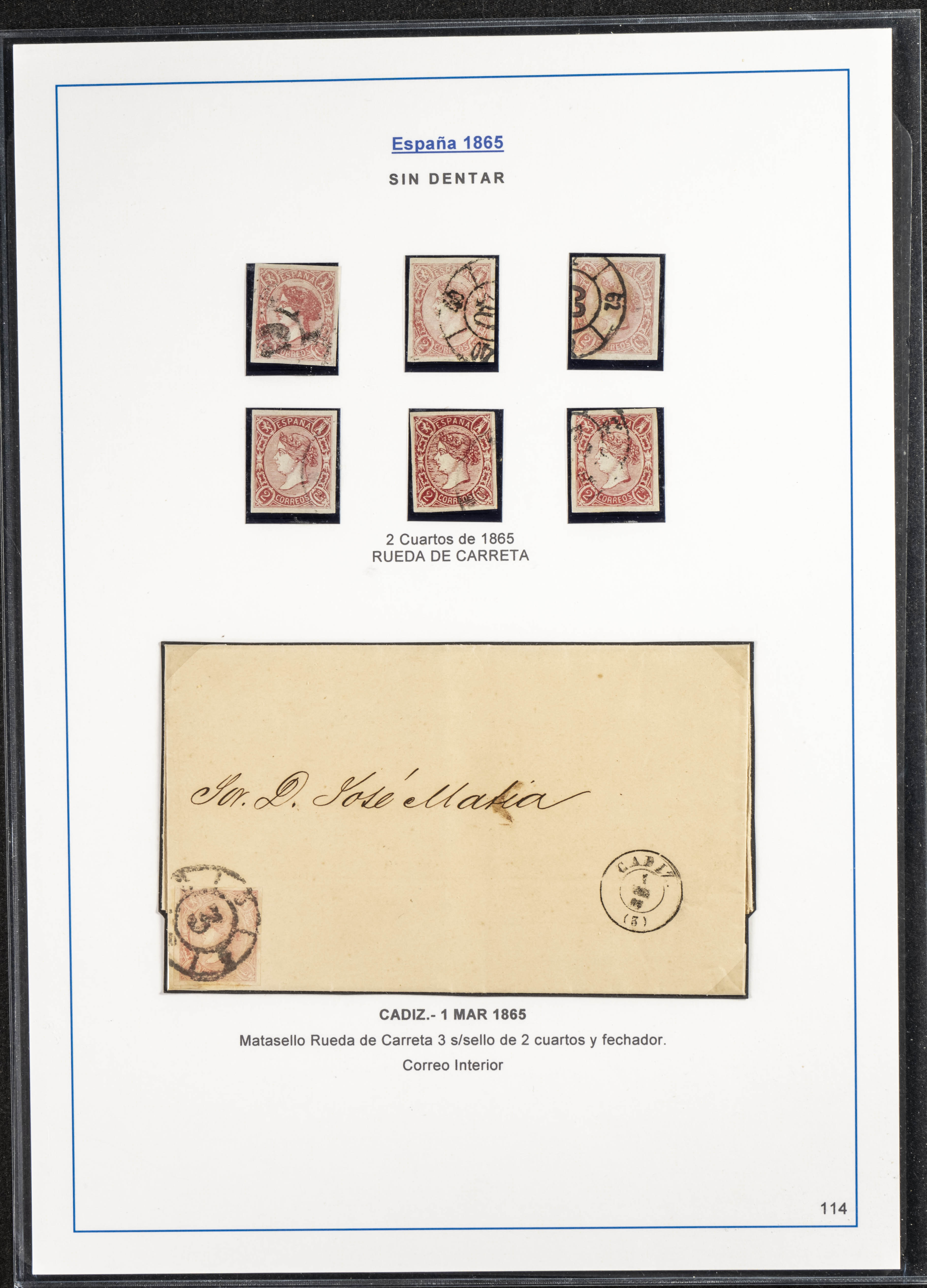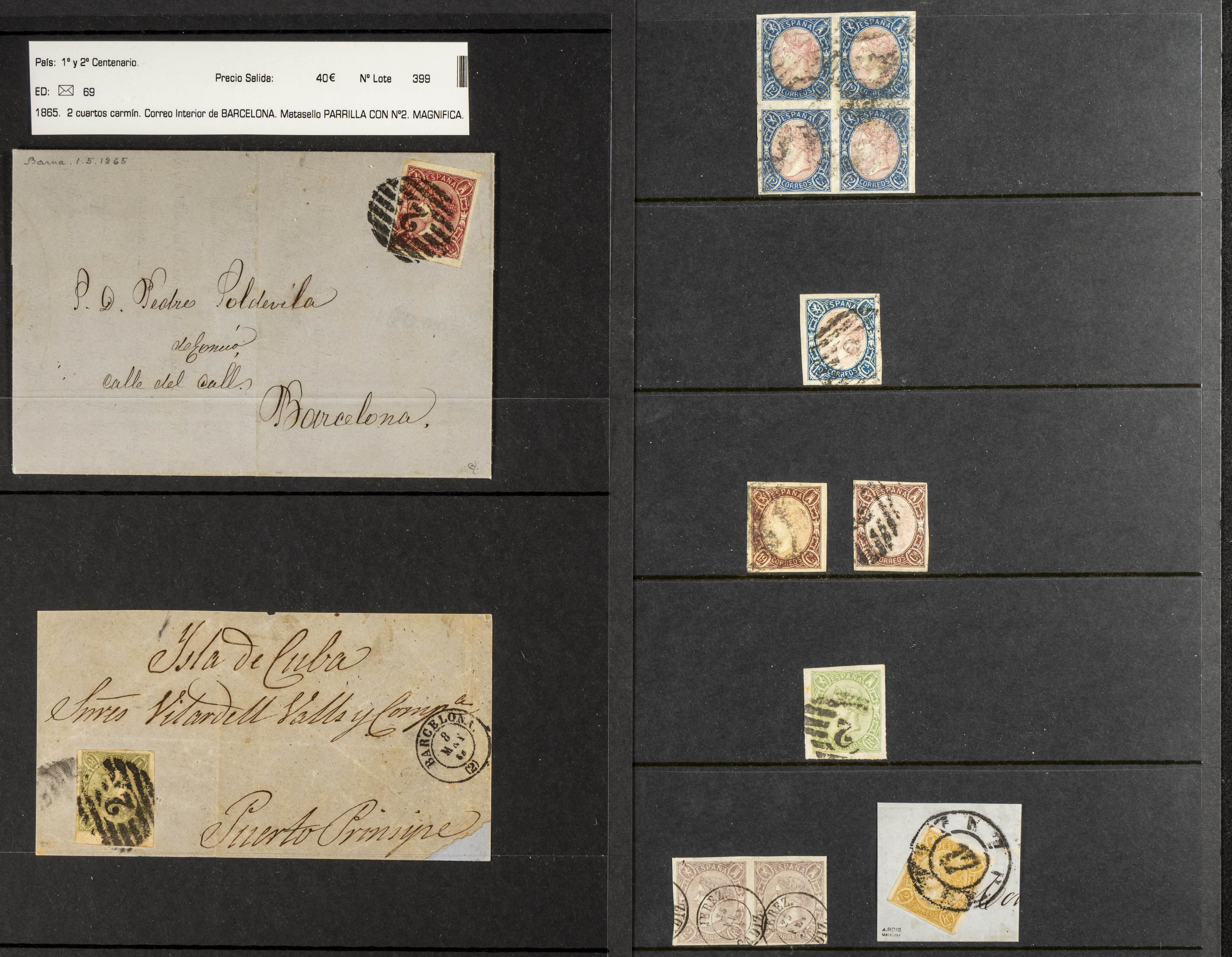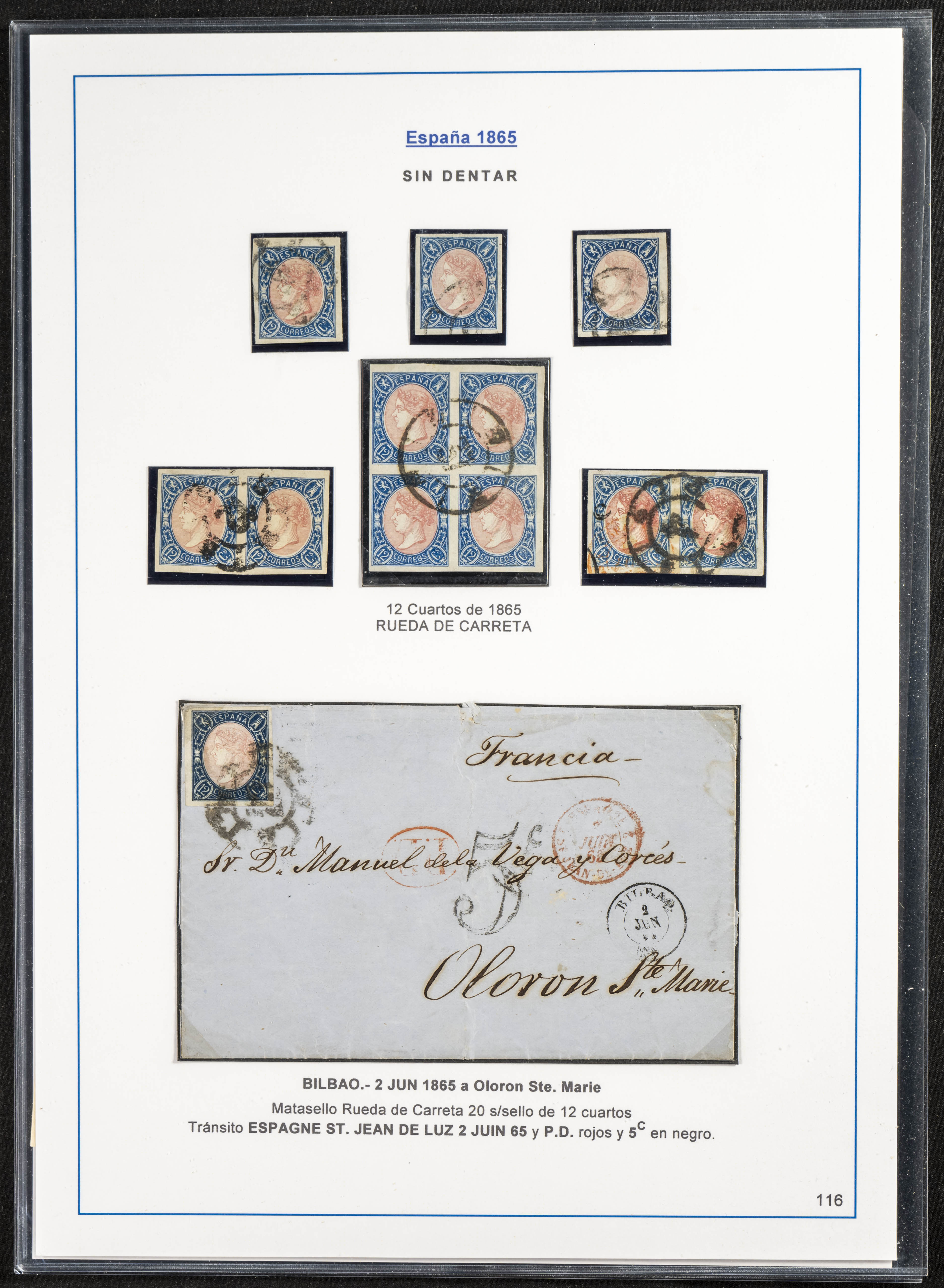 1865. Interesante conjunto de sellos usados y cartas circuladas de la emisión de Isabel II sin dentar de 1865, incluye dos sellos de 19 cuartos, tres bloques de cuatro de 12 cuartos (2) y 1 real verde (1), dos cartas dirigidas a Francia (12 cuartos), un frontal dirigido a Cuba (1 real) y dos cartas de Correo Interior (2 cuartos), entre otras. A EXAMINAR.