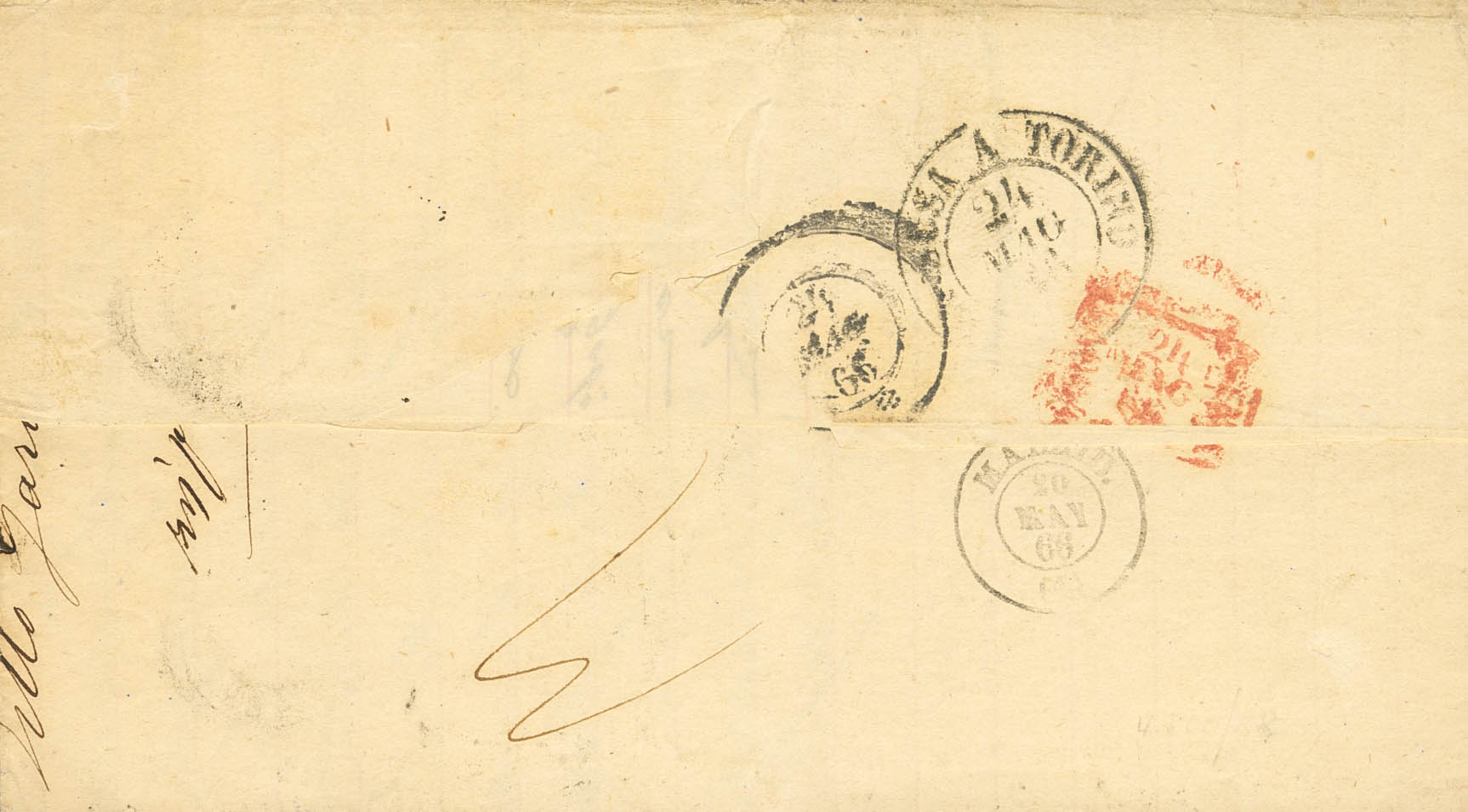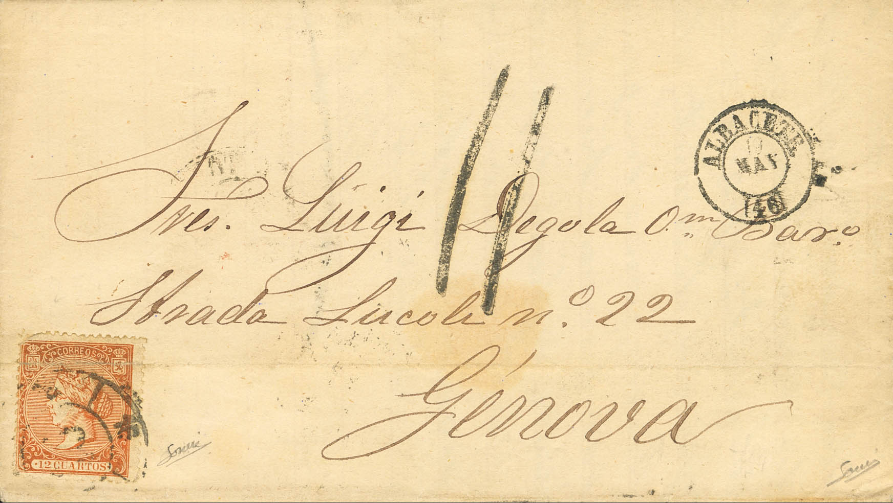 82. 1866. 12 cuartos naranja (pliegue de archivo). ALBACETE a GENOVA (ITALIA). En el frente porteo italiano "11" (décimas), franqueo correcto según la tarifa en vigor desde Junio de 1853, de 12 cuartos hasta 1 onza de peso. BONITA Y RARISIMA.