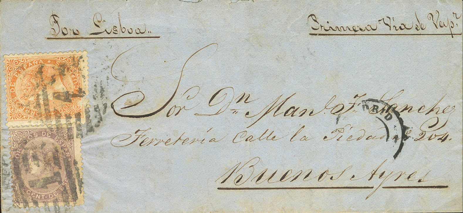 89, 92. 1867. 12 cuartos naranja y 20 cts lila. MADRID a BUENOS AIRES (ARGENTINA). En el frente anotaciones manuscritas "Por Lisboa" y "Primera vía del Vapor". MAGNIFICA E INUSUAL COMBINACION DE FRANQUEO PARA COMPLETAR LA TARIFA DE 29 CUARTOS (350 MIL), VIA PORTUGAL.