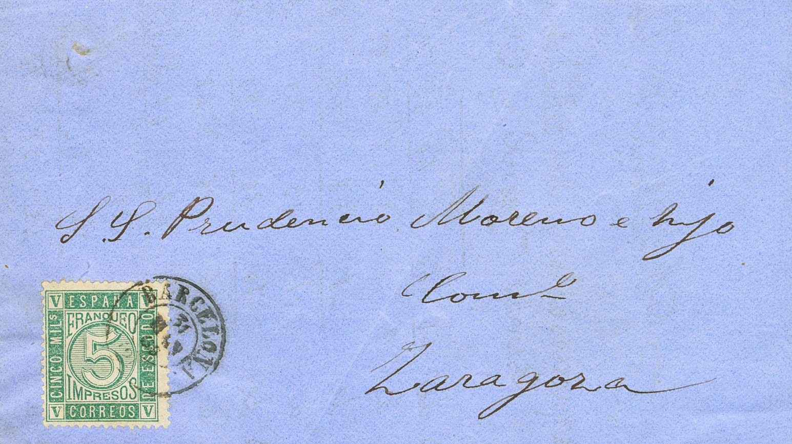 93. 1867. 5 cts verde. Impreso de BARCELONA a ZARAGOZA. Matasello BARCELONA / 2. MAGNIFICA.