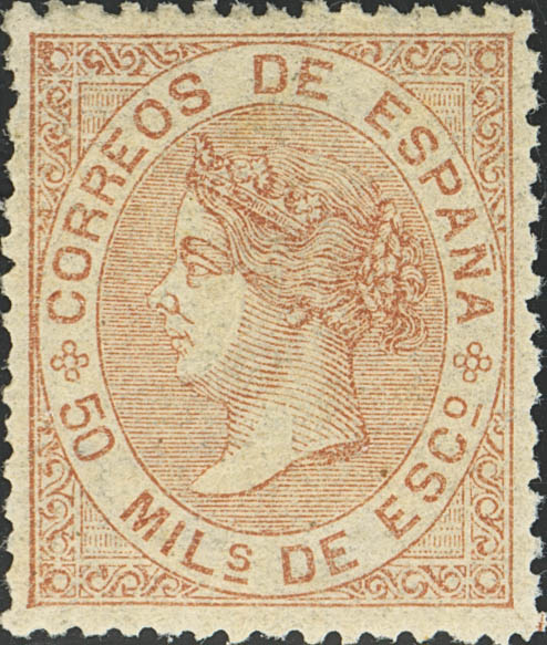 ★ 96. 1867. 50 mils castaño. Bien centrado. MAGNIFICO.