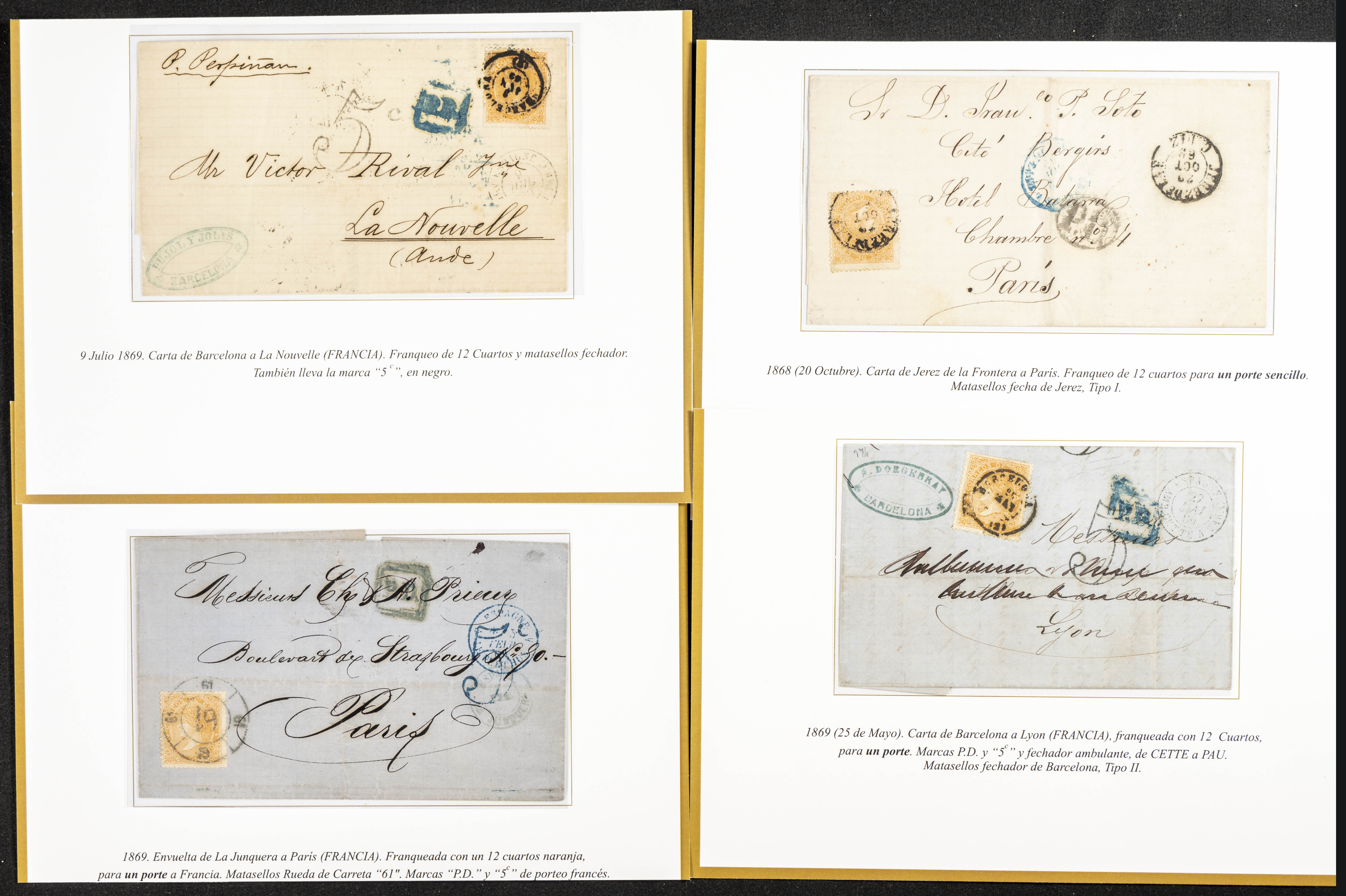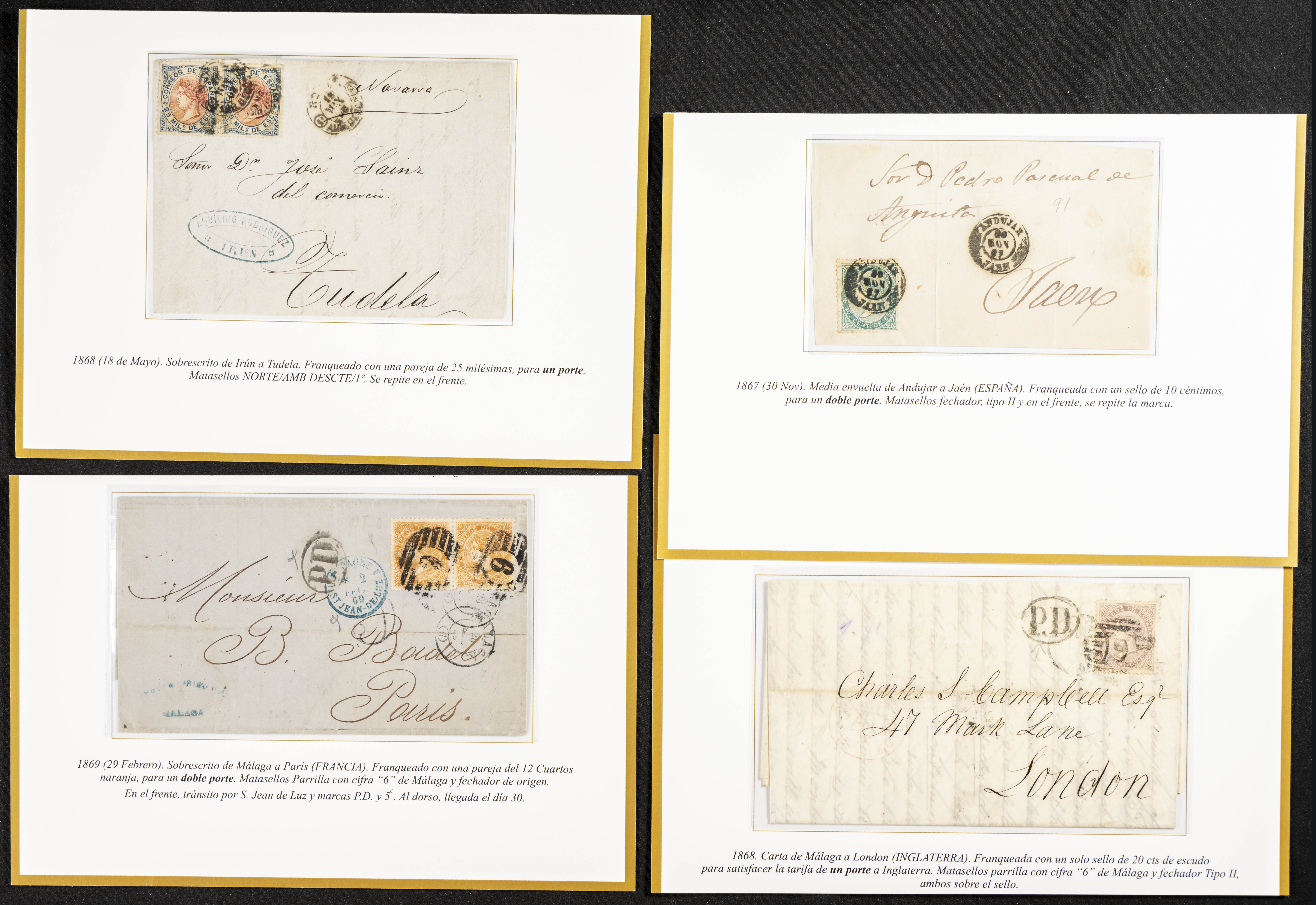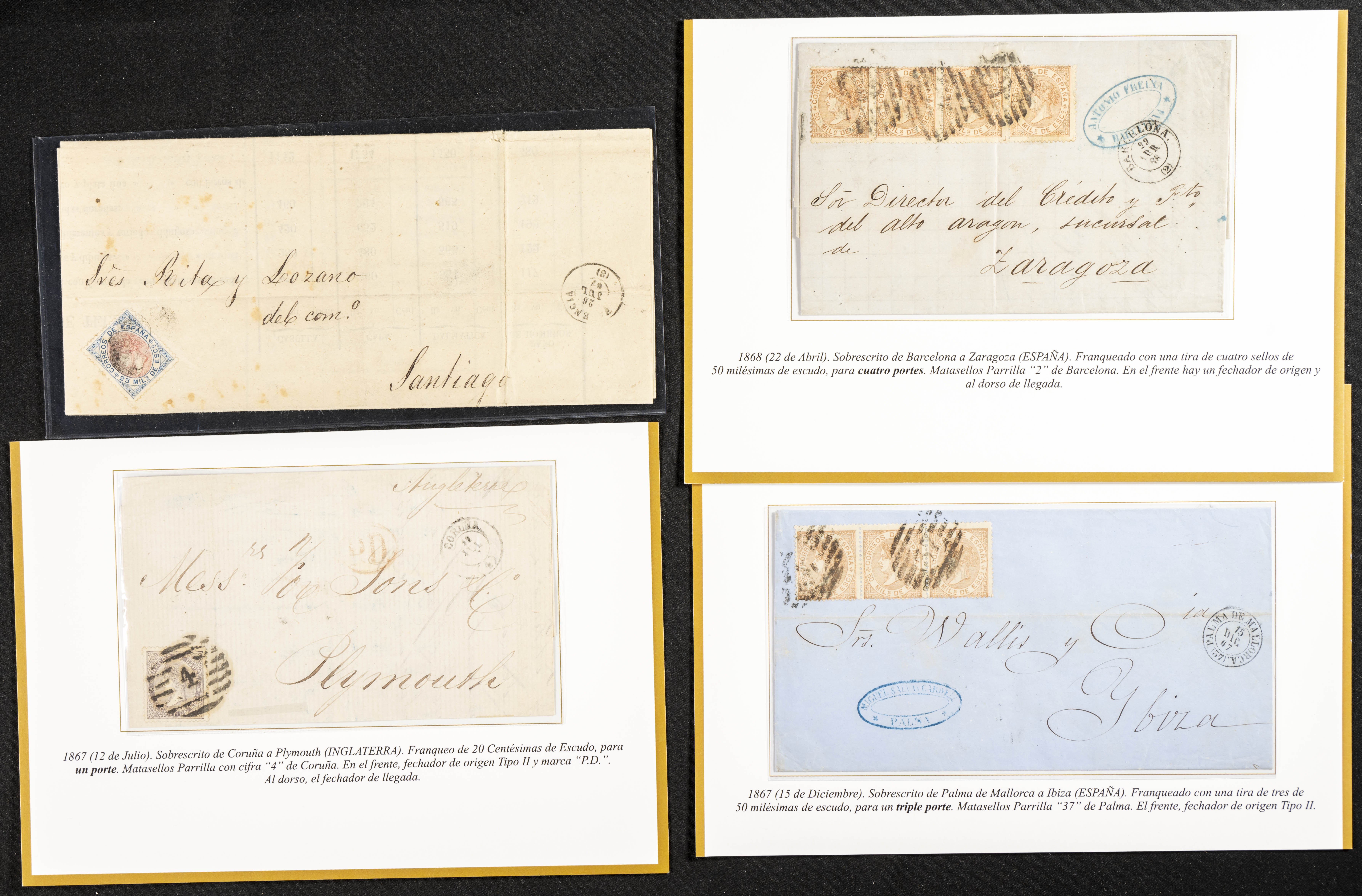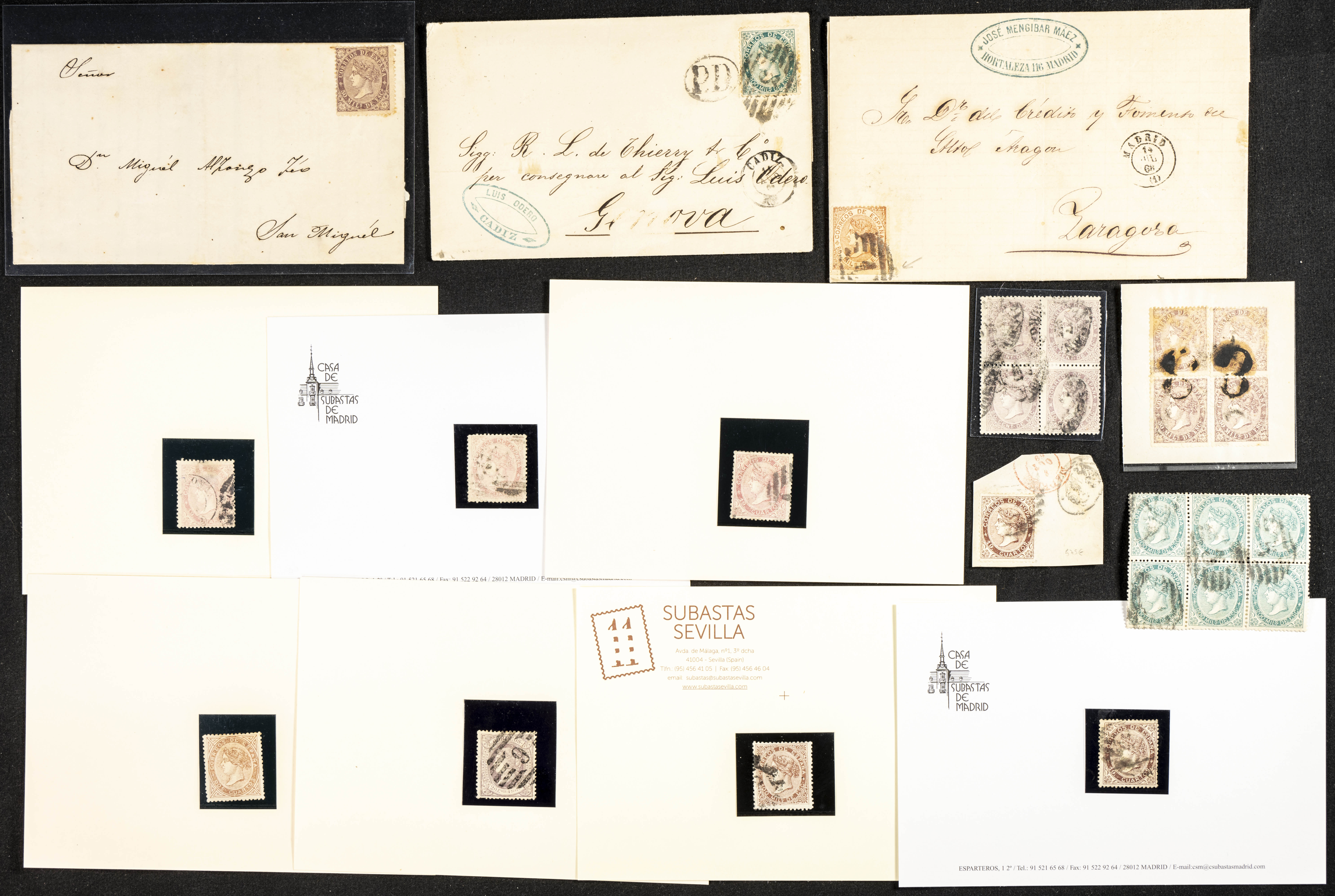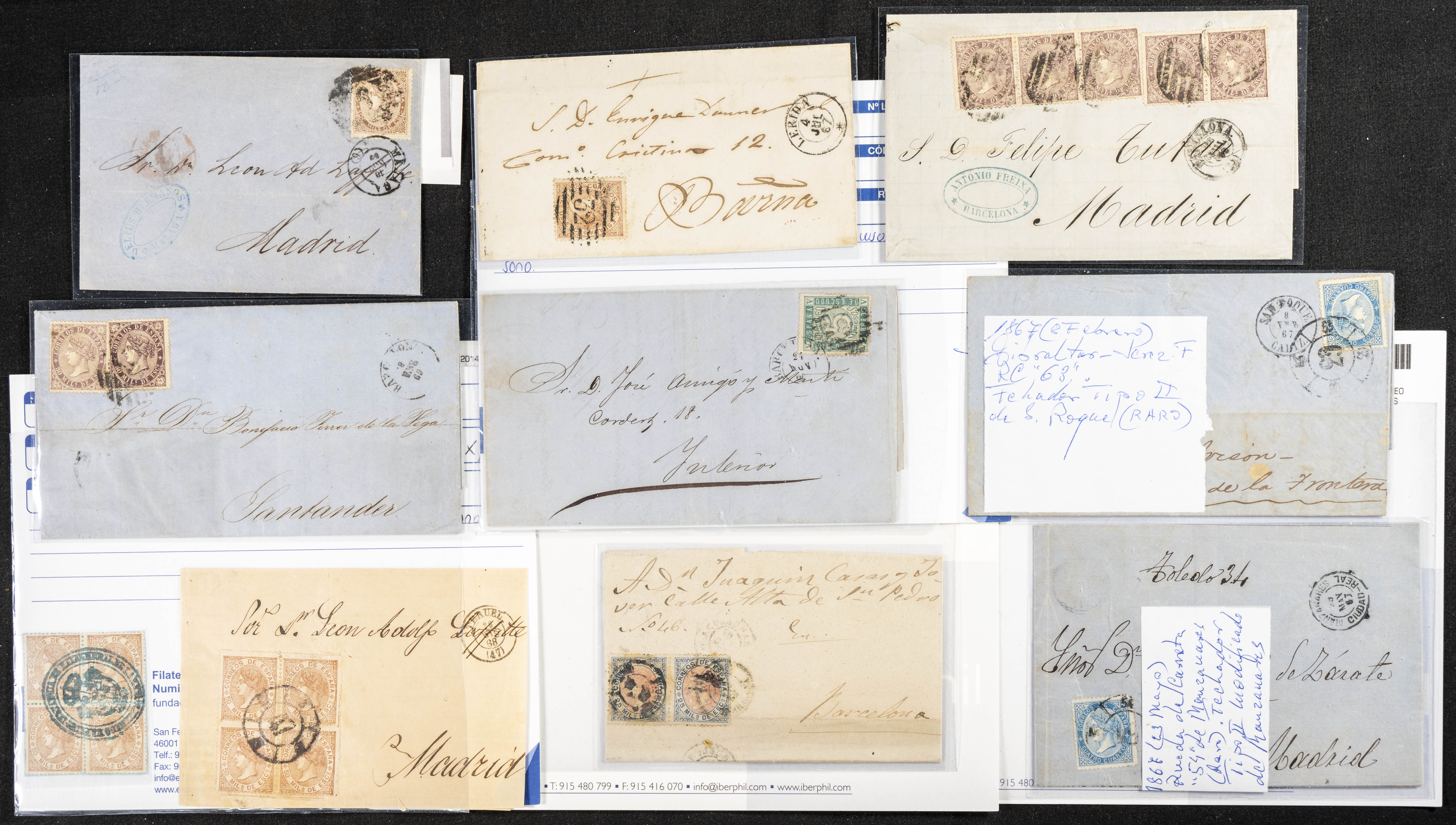 (1867ca). Interesante conjunto de sellos usados y cartas circuladas de las emisiones de Isabel II de 1867 y 1868, incluye varios sellos de 19 cuartos rosa y castaño, un 2 cuartos de 1867 nuevo, varias cartas dirigidas a Francia y Gran Bretaña franqueadas con sellos de 20 cts y 12 cuartos, una dirigida a Italia con sello de 100 mils verde, franqueos múltiples nacionales y bloques. IMPRESCINDIBLE EXAMINAR.